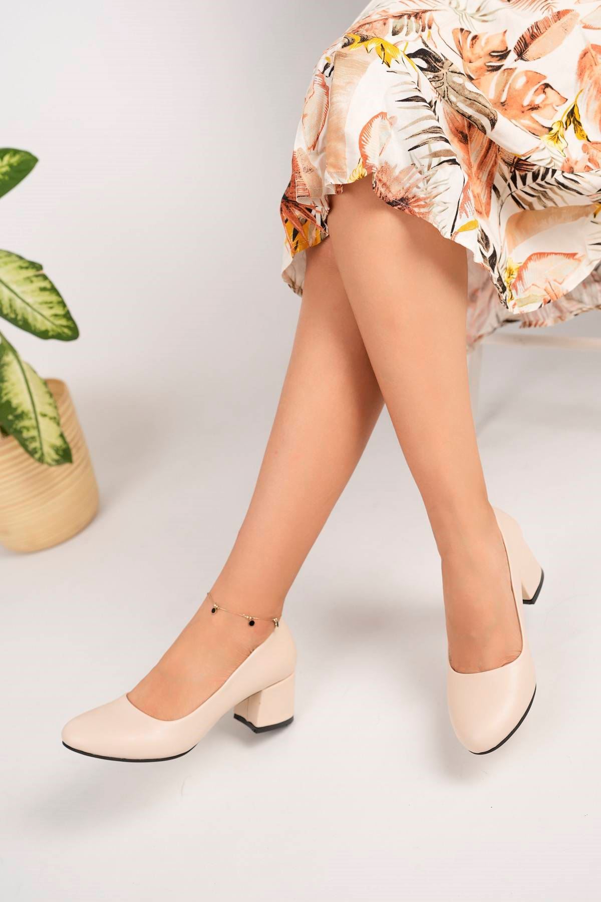 Alçak Topuk Yuvarlak Kalıp Krem Cilt Stiletto