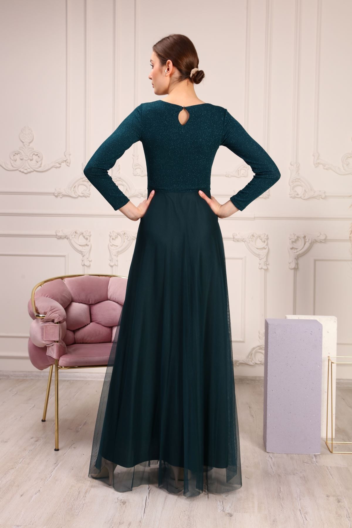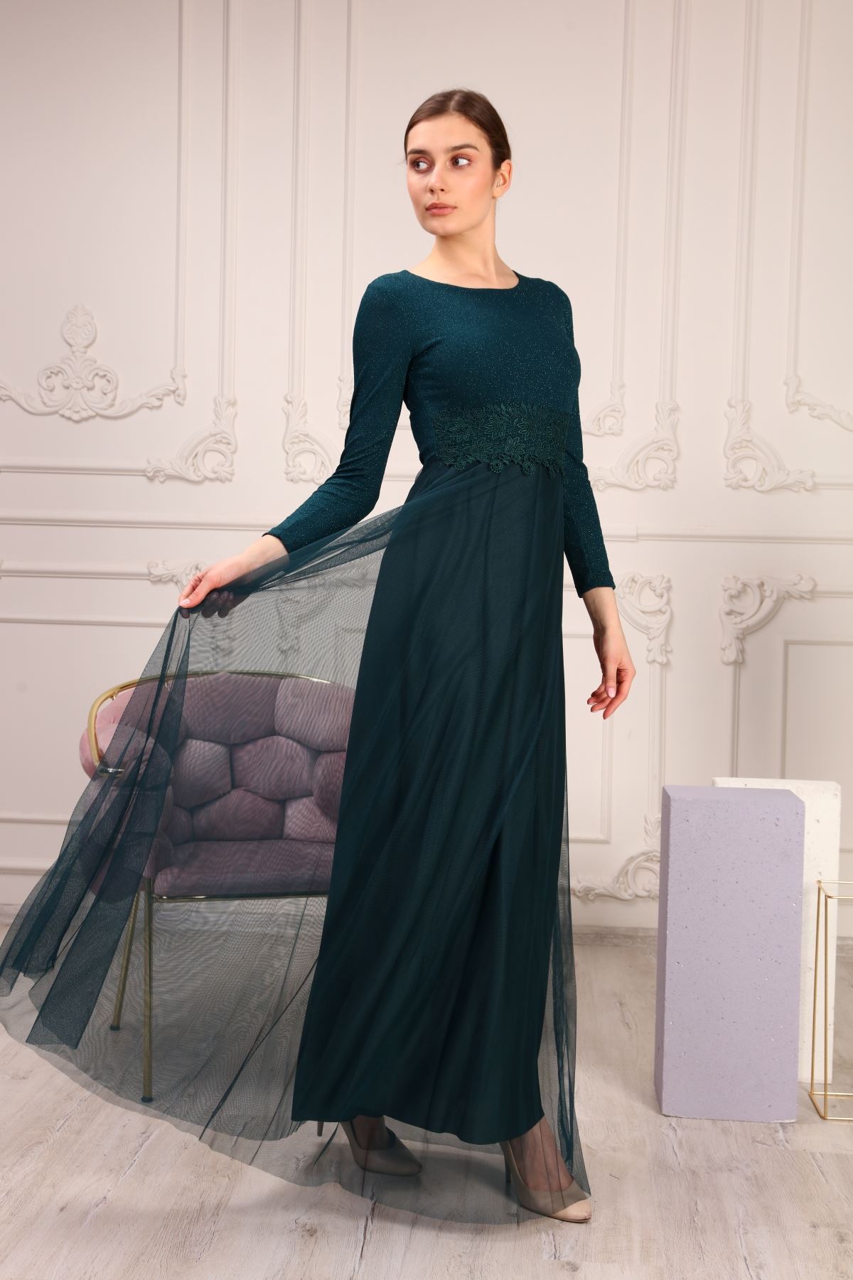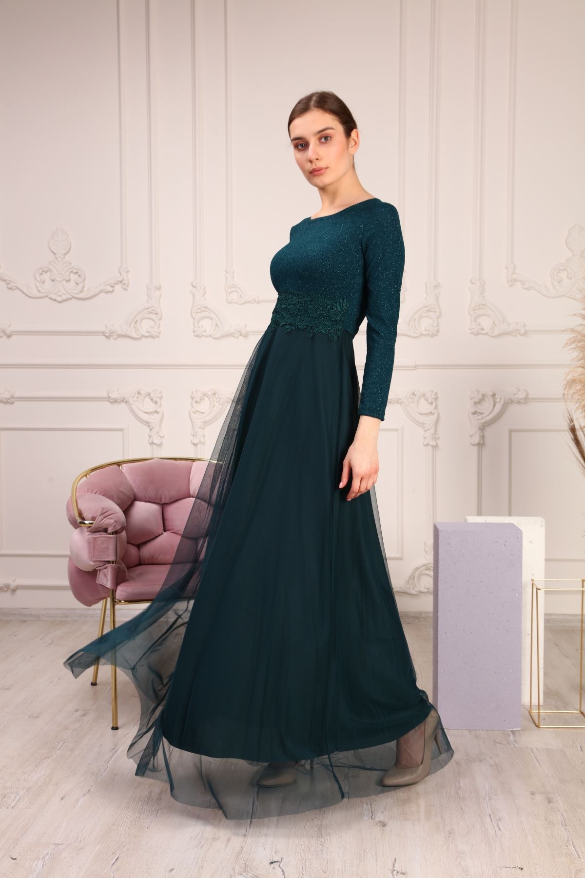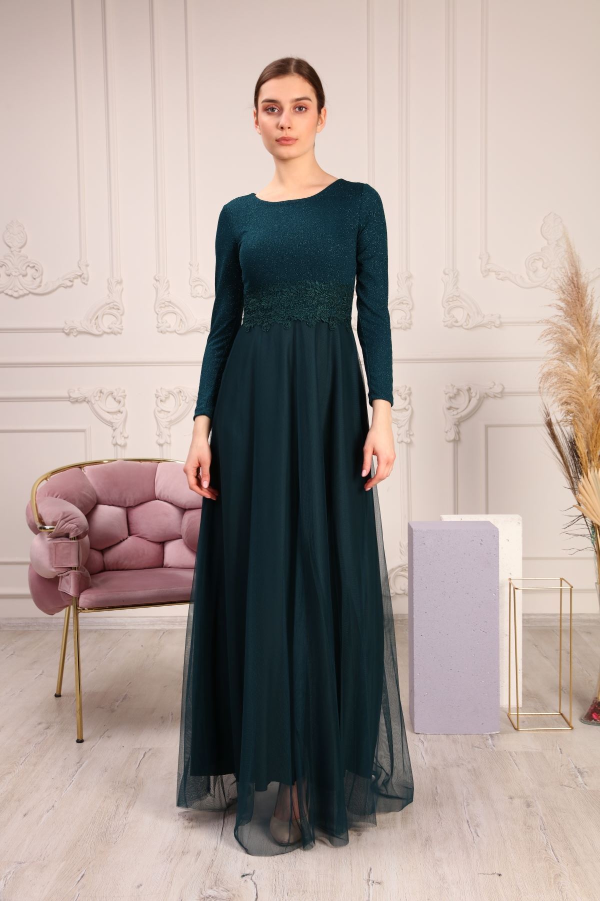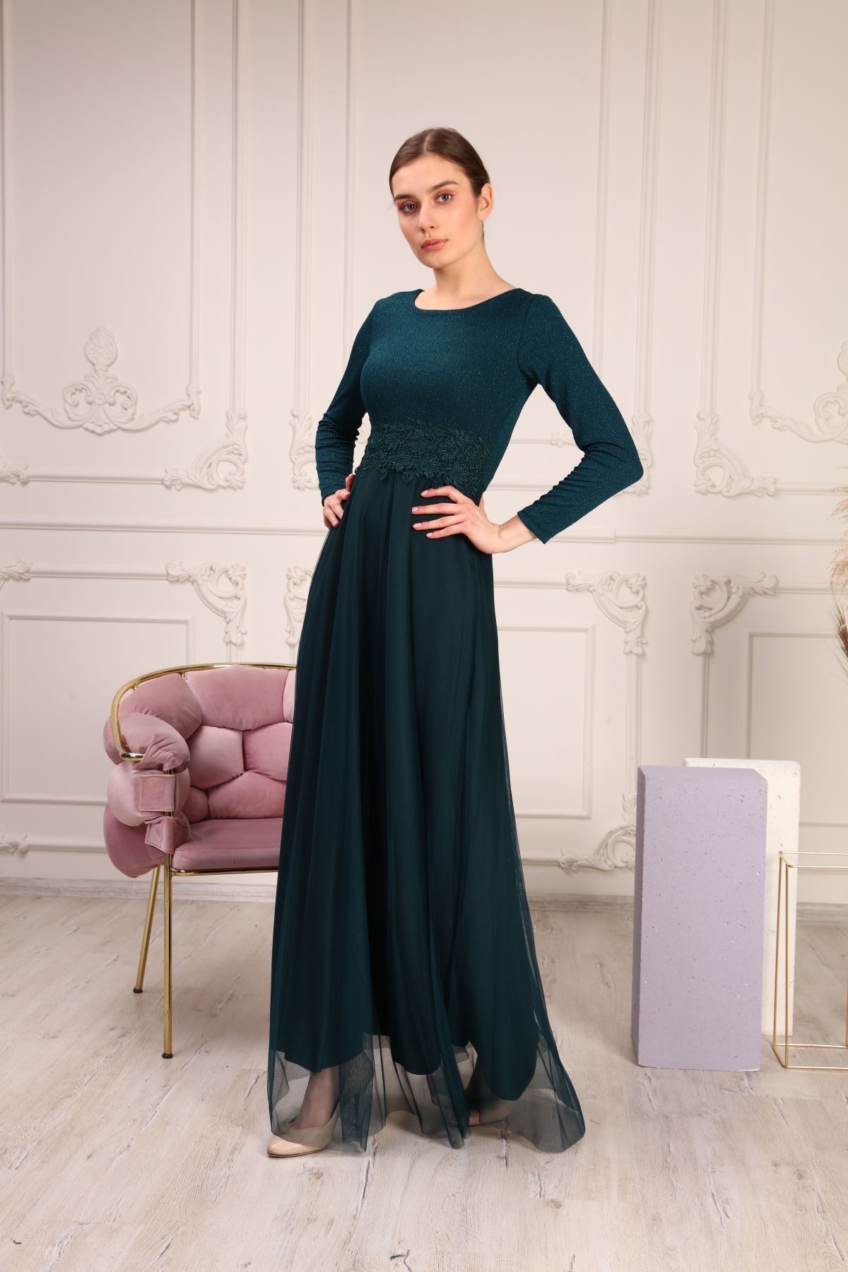 Beli Şeritli Uzun Kol Kadın Abiye Elbise