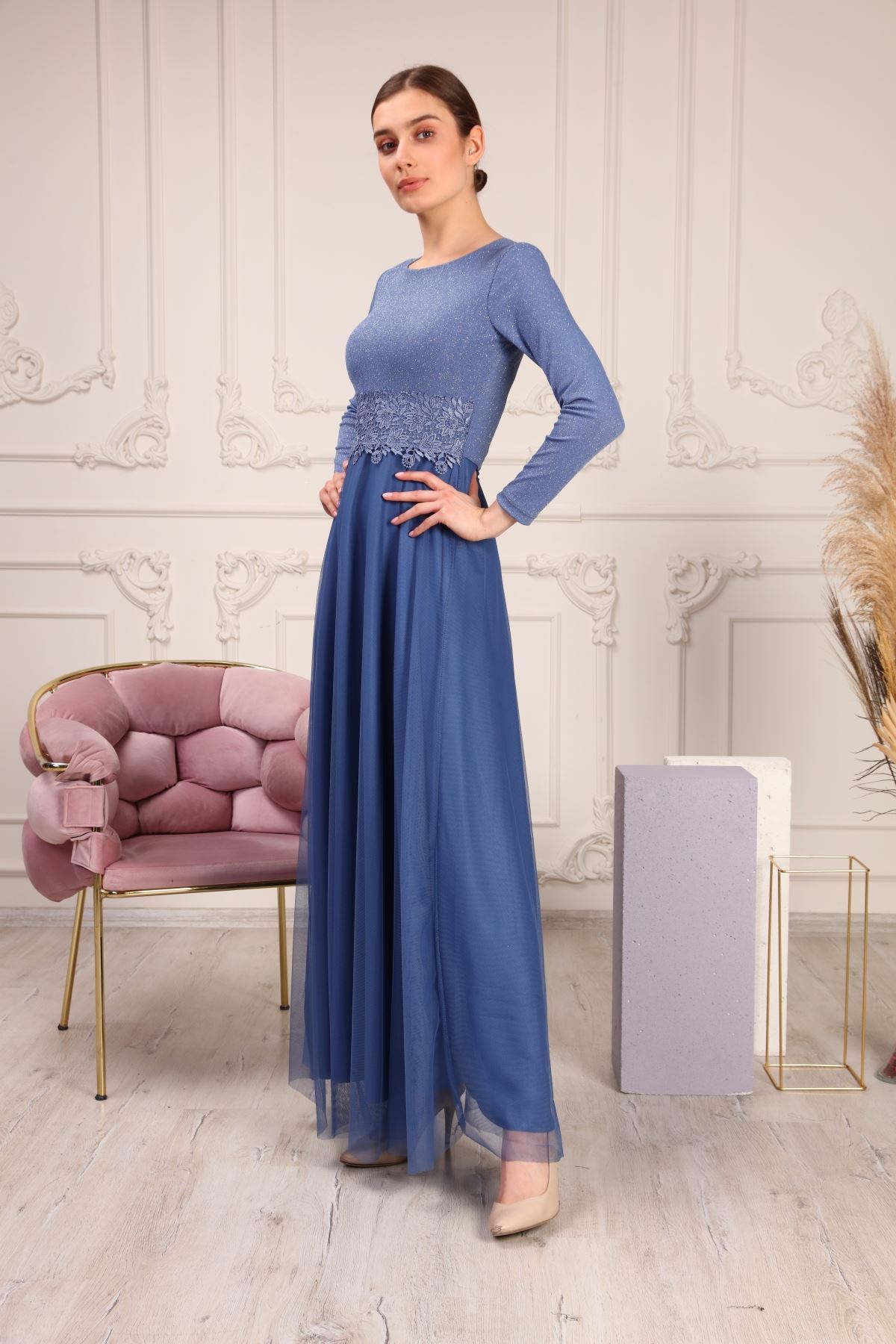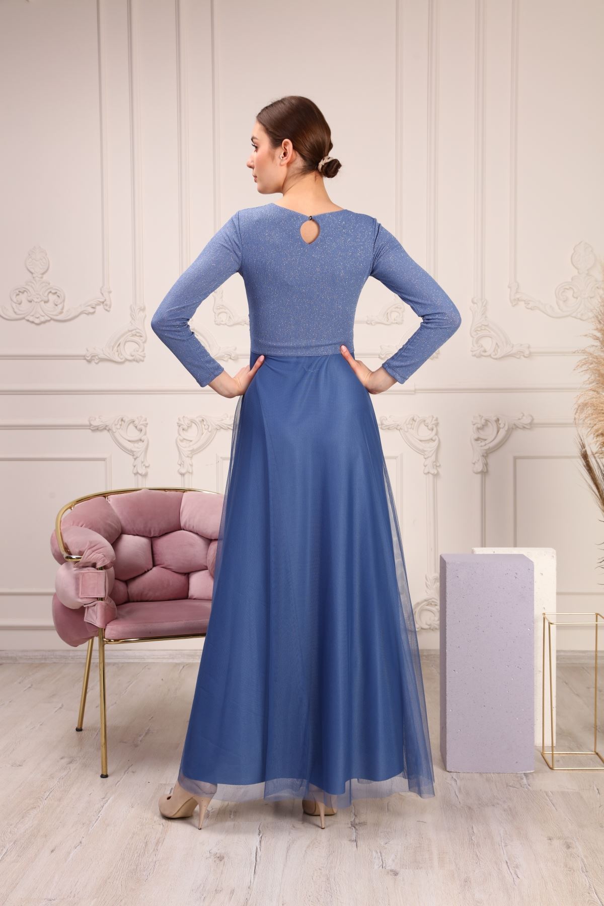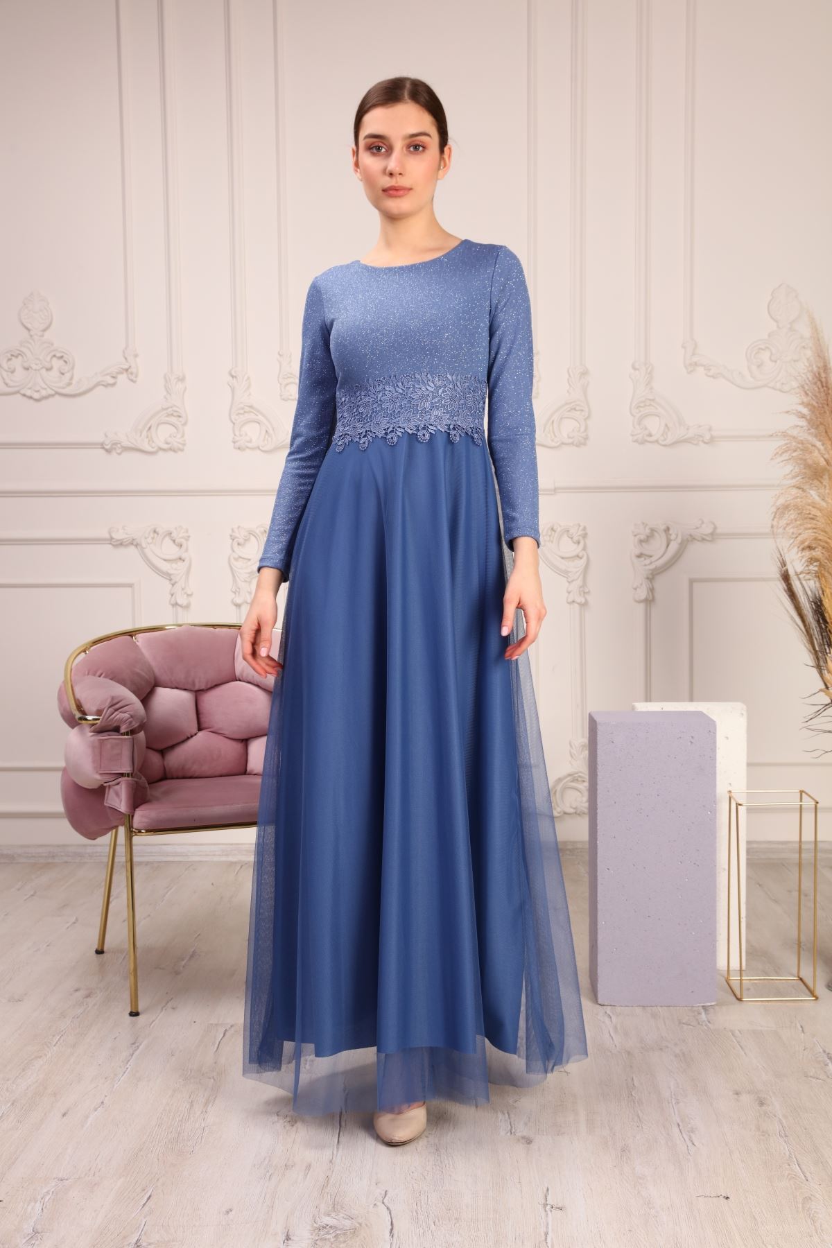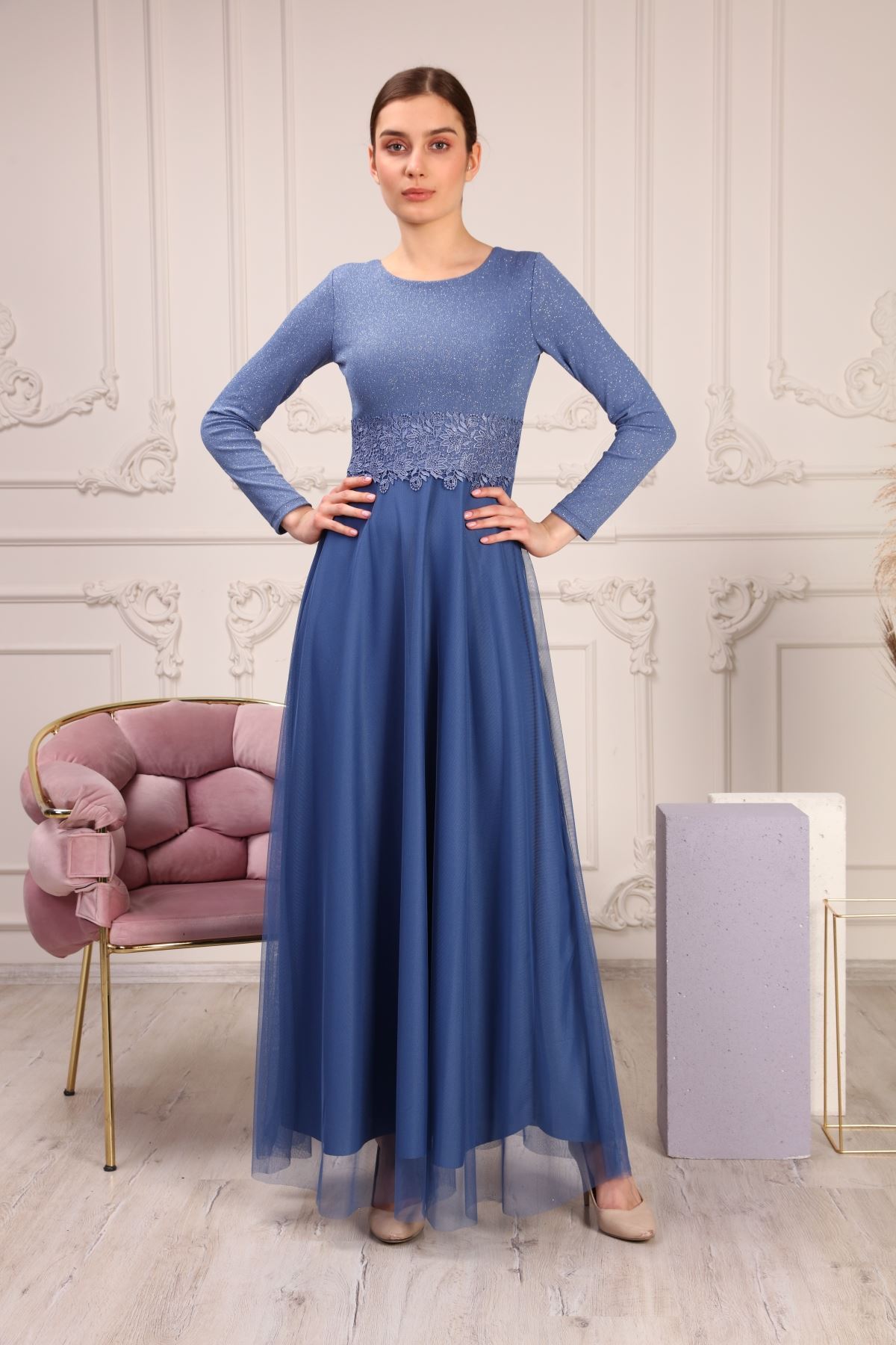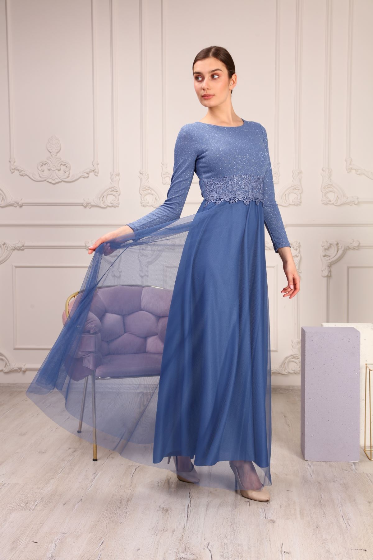 Beli Şeritli Uzun Kol Kadın Abiye Elbise
