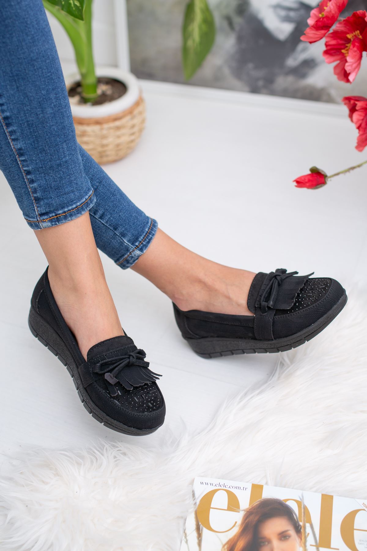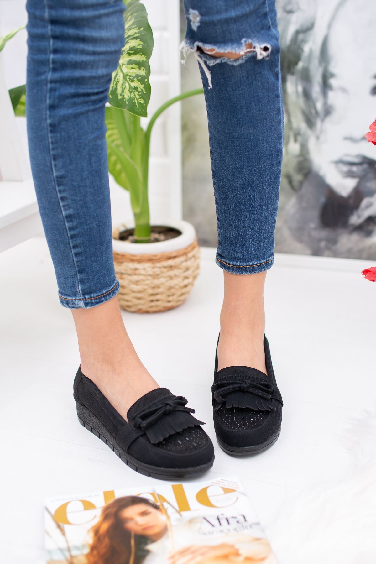 Burnu Taşlı Püsküllü Ortopedik Pedli Siyah Ayakkabı