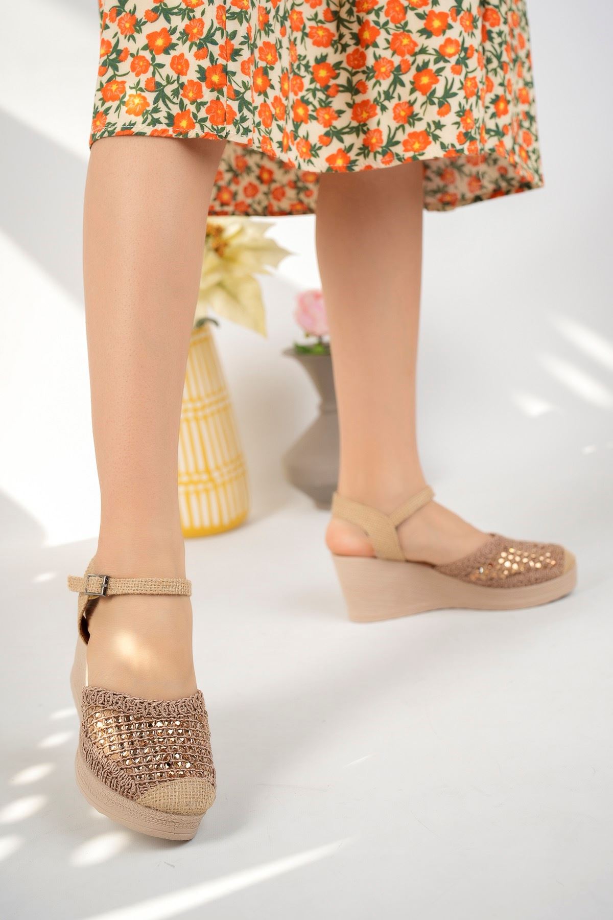 Dolgu Taban Arka Açık Vizon Taşlı Kadın Ayakkabı