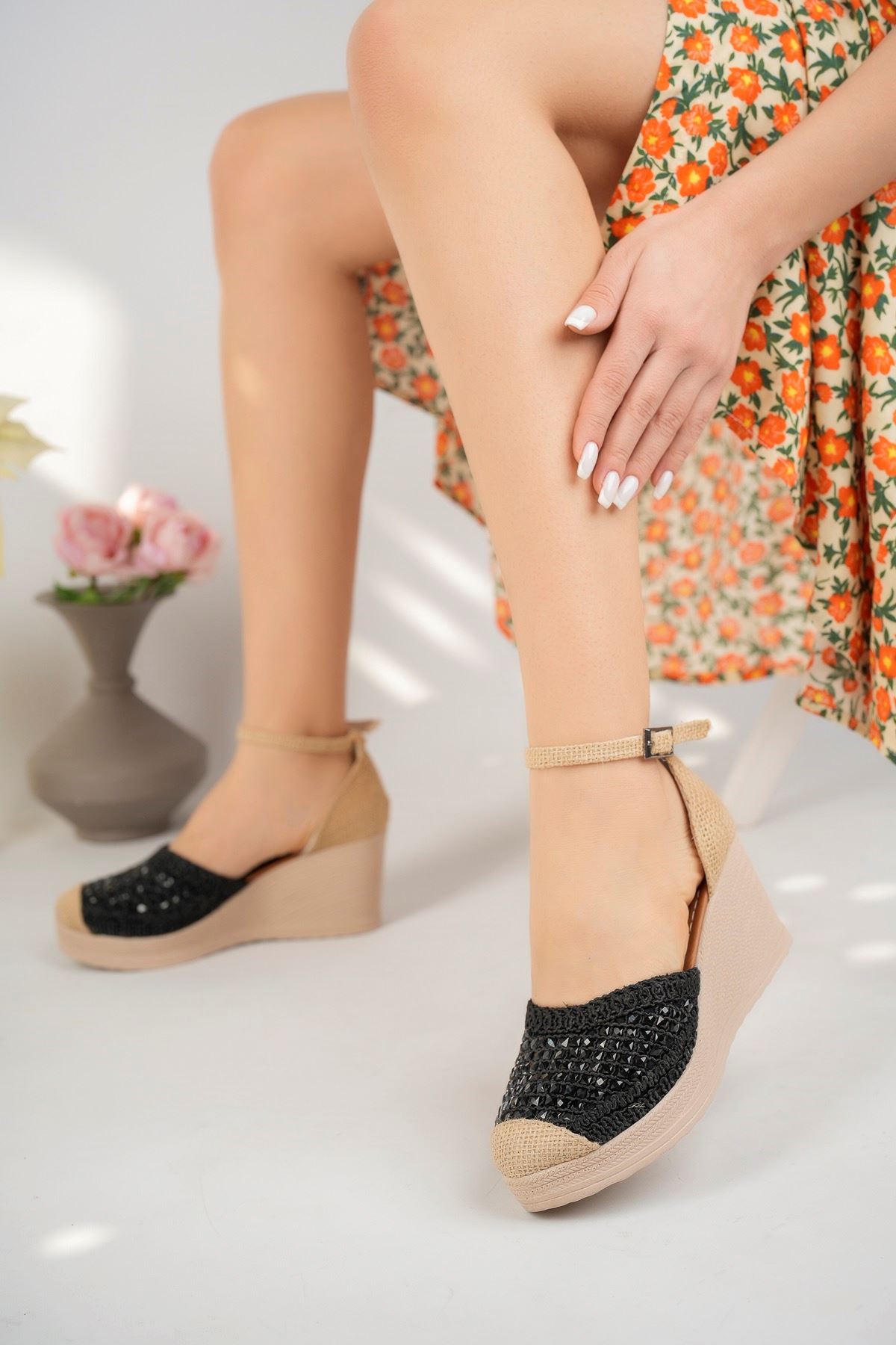 Dolgu Taban Arka Kapalı Taşlı Siyah Kadın Ayakkabı