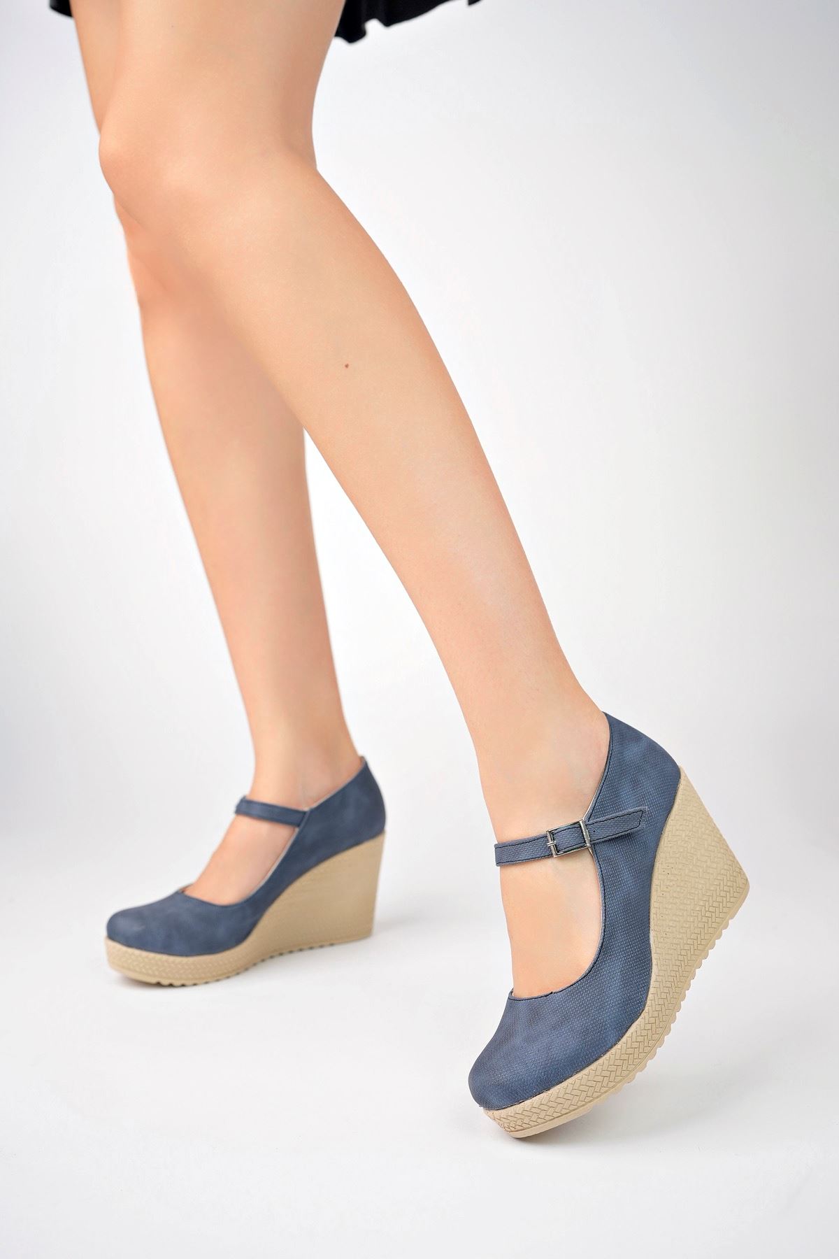 Dolgu Taban Bilekten Tokalı Lacivert İRM Kot Ayakkabı