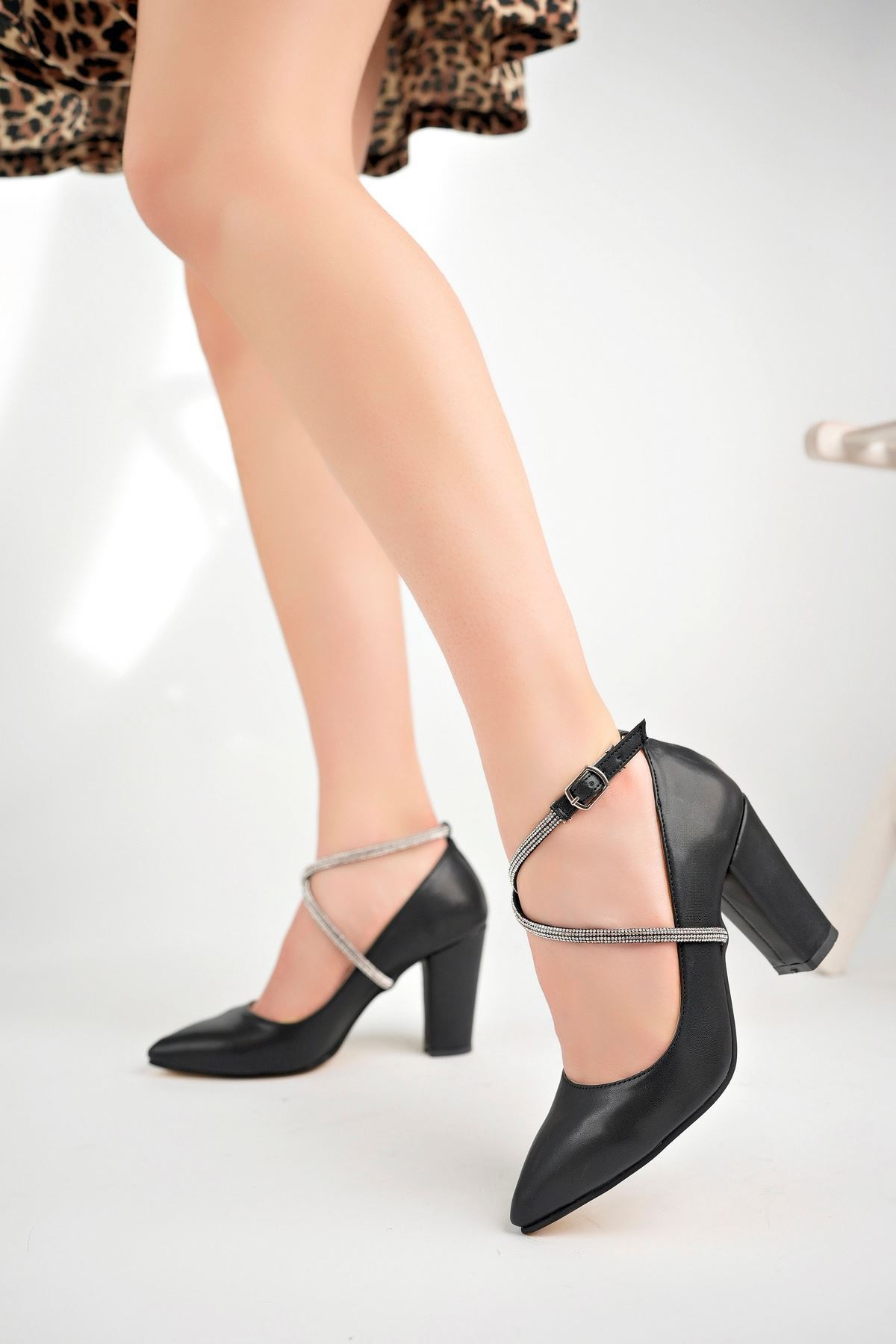 Dolgu Taban Biyesi Taşlı Siyah Cilt Kadın Ayakkabı