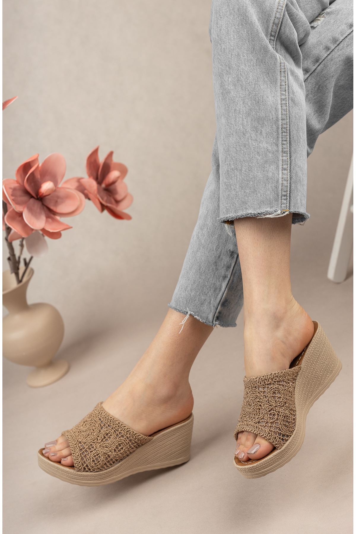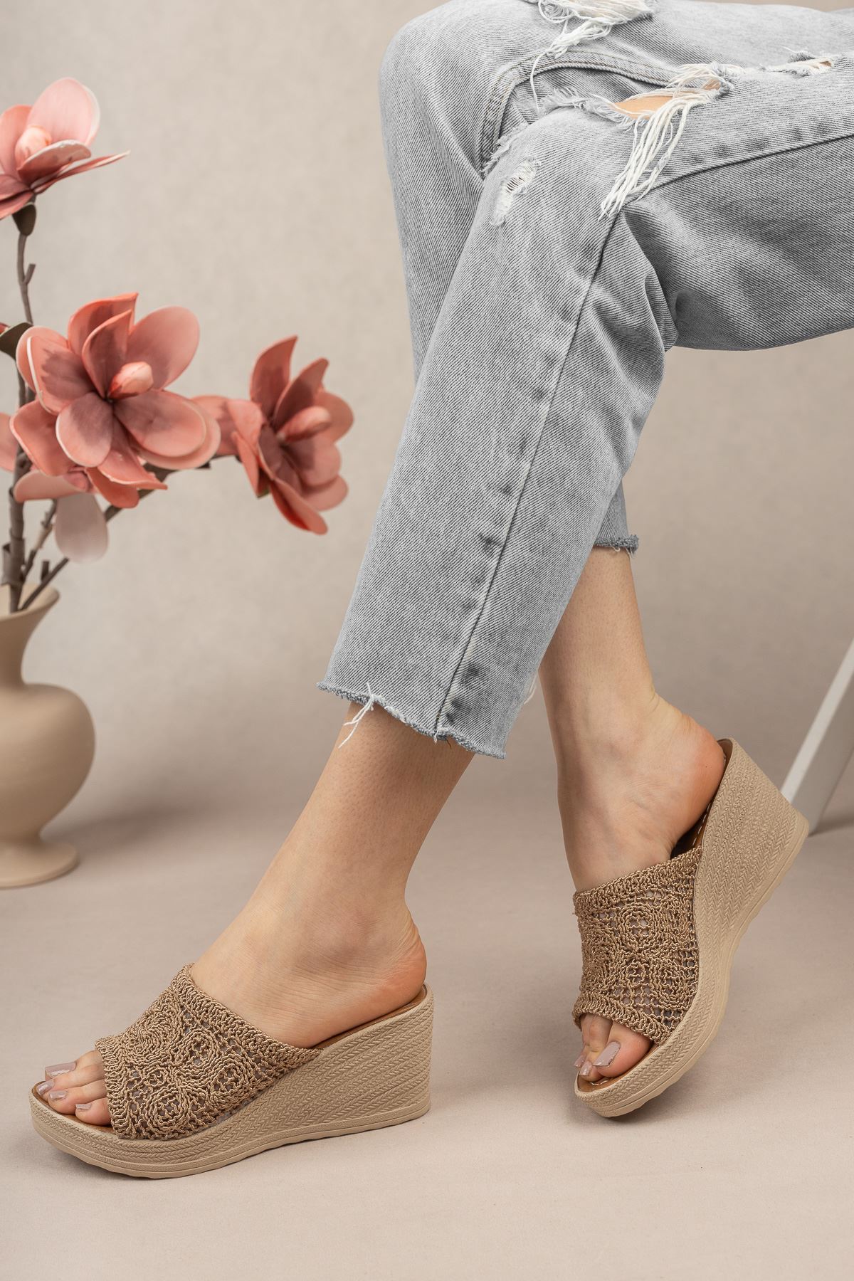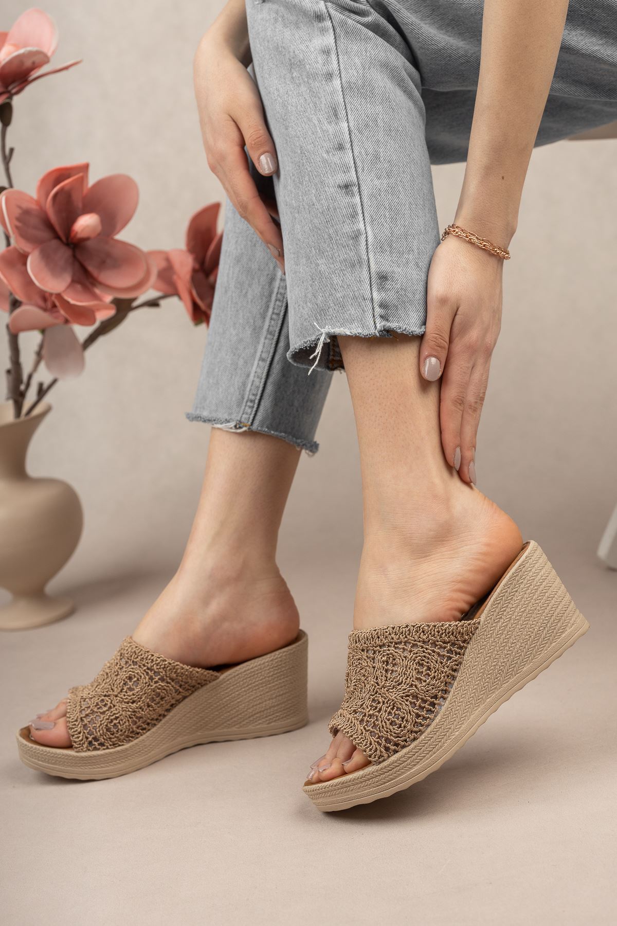 Dolgu Taban Burnu Açık Örgülü Terlik