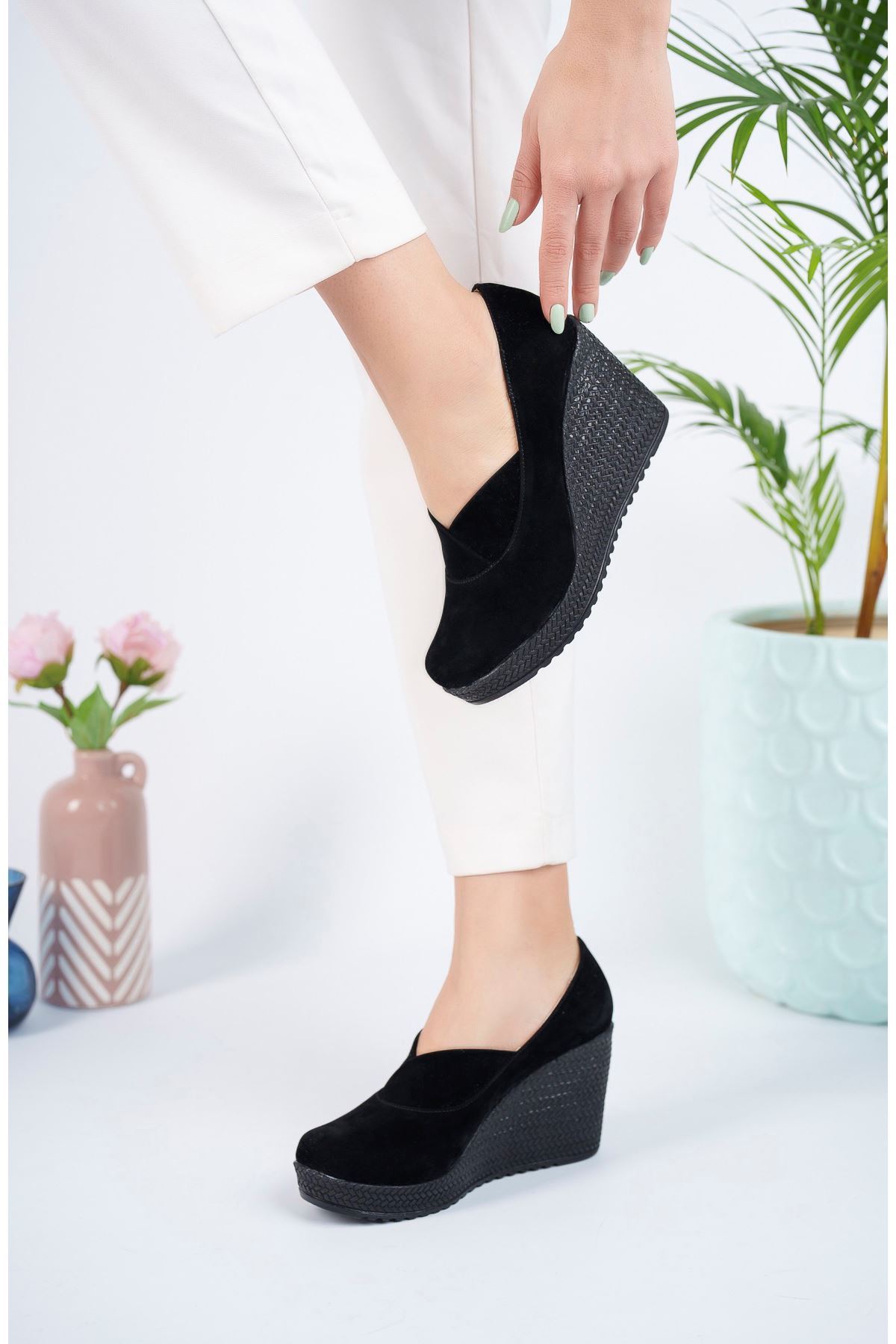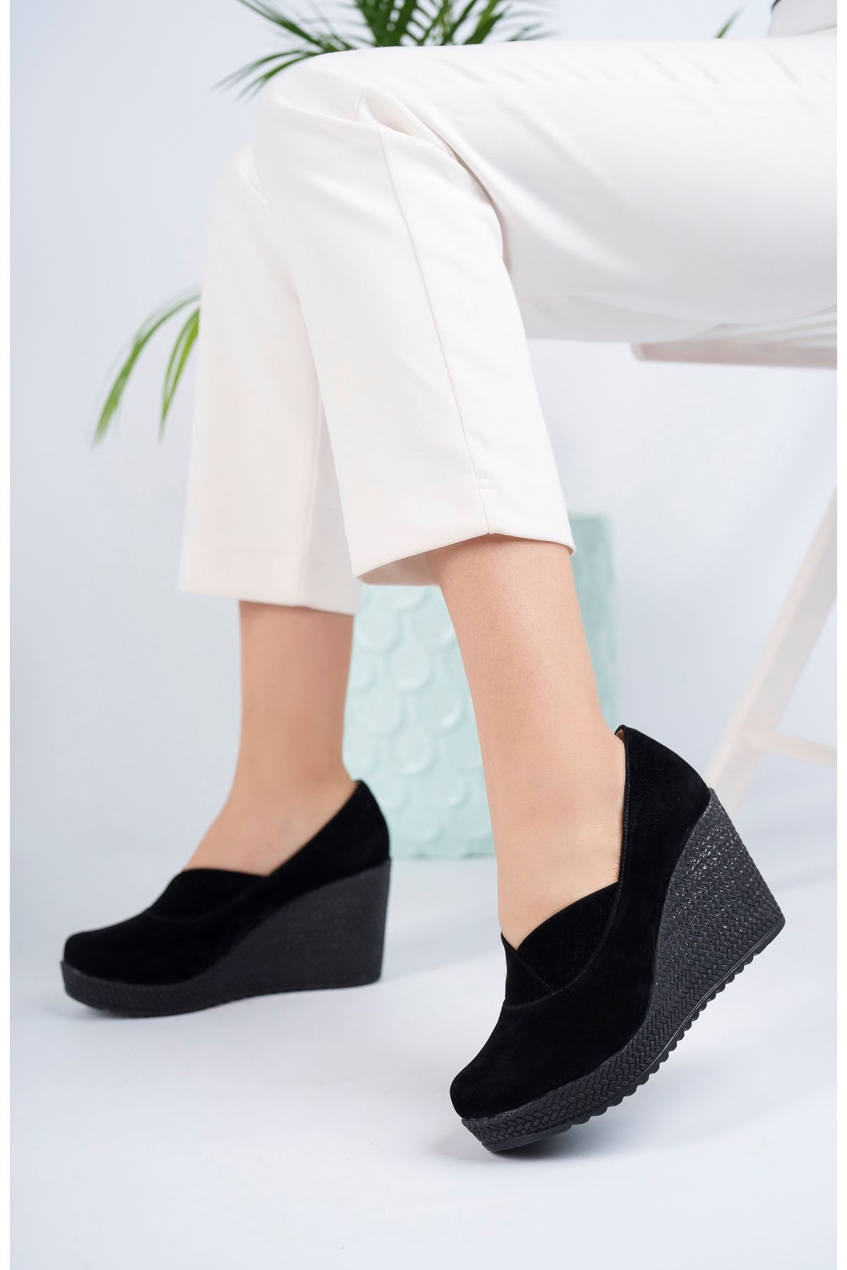 Dolgu Taban Çapraz Model Siyah Süet Ayakkabı