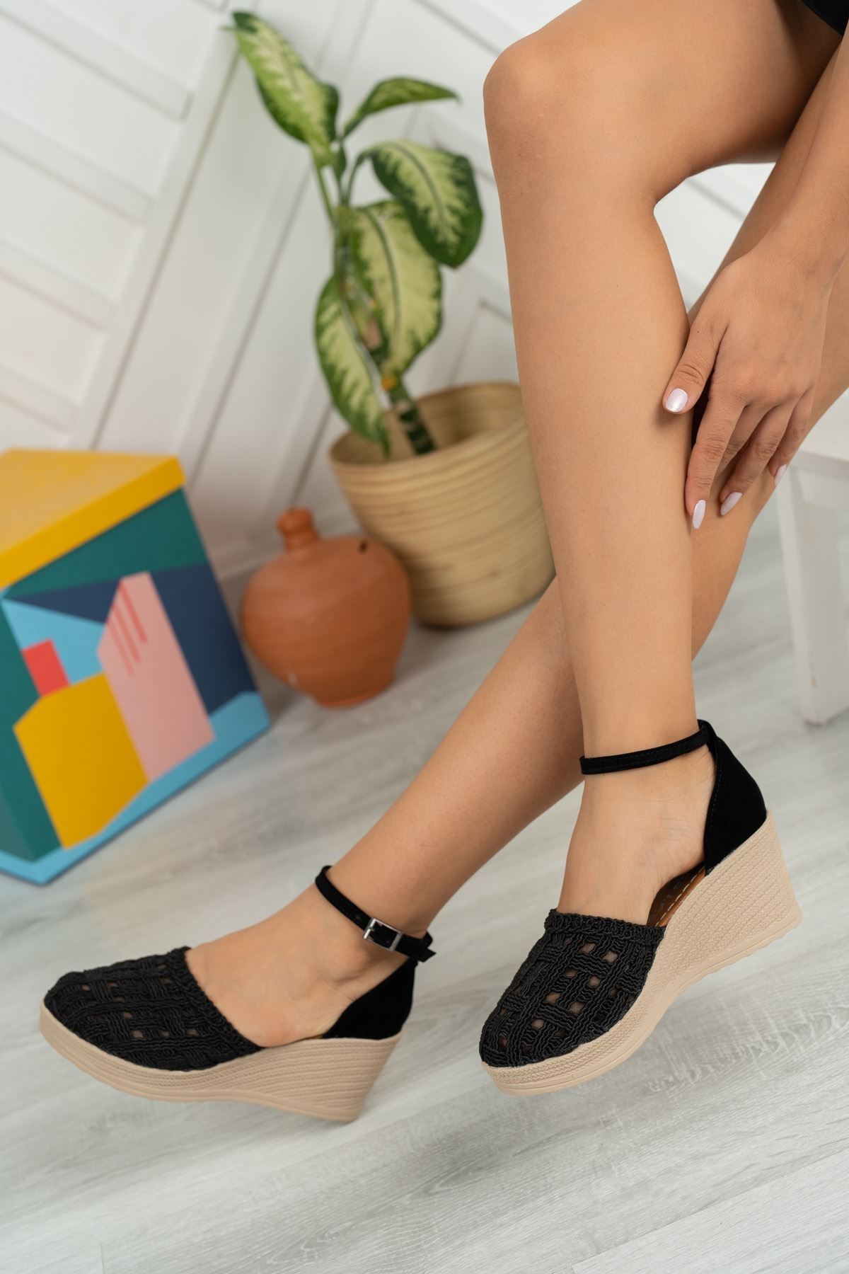 Dolgu Taban Ekose Örgü Siyah Karnıyarık Ayakkabı