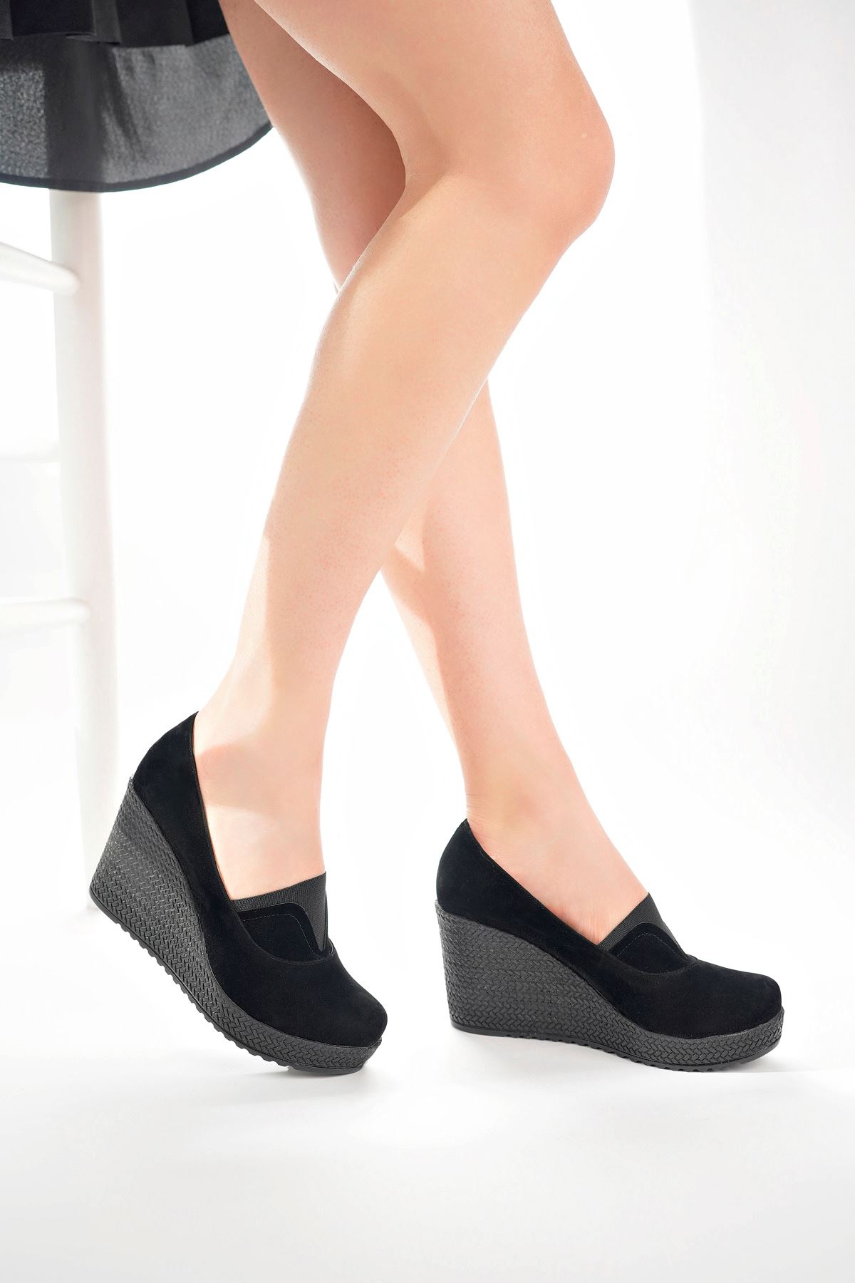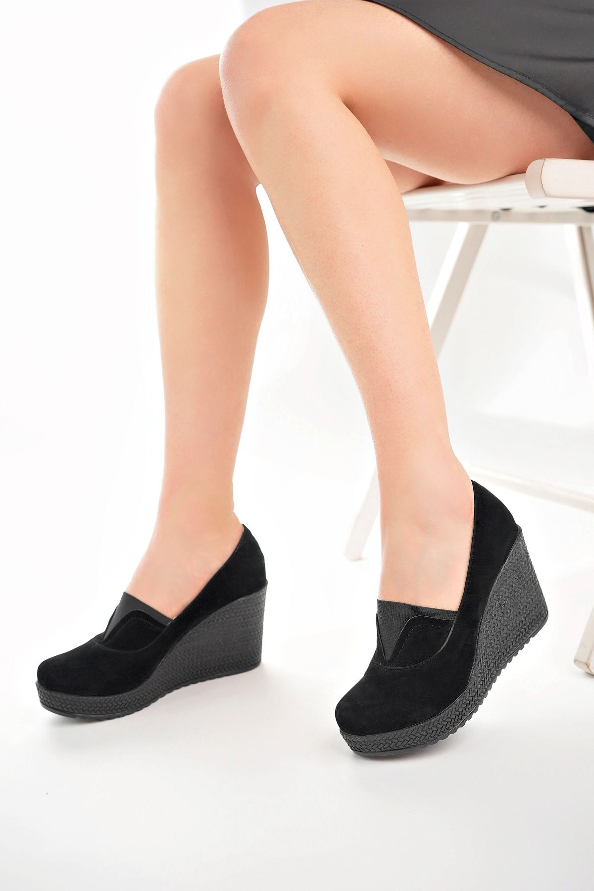 Dolgu Taban Lastikli Siyah Süet Ayakkabı