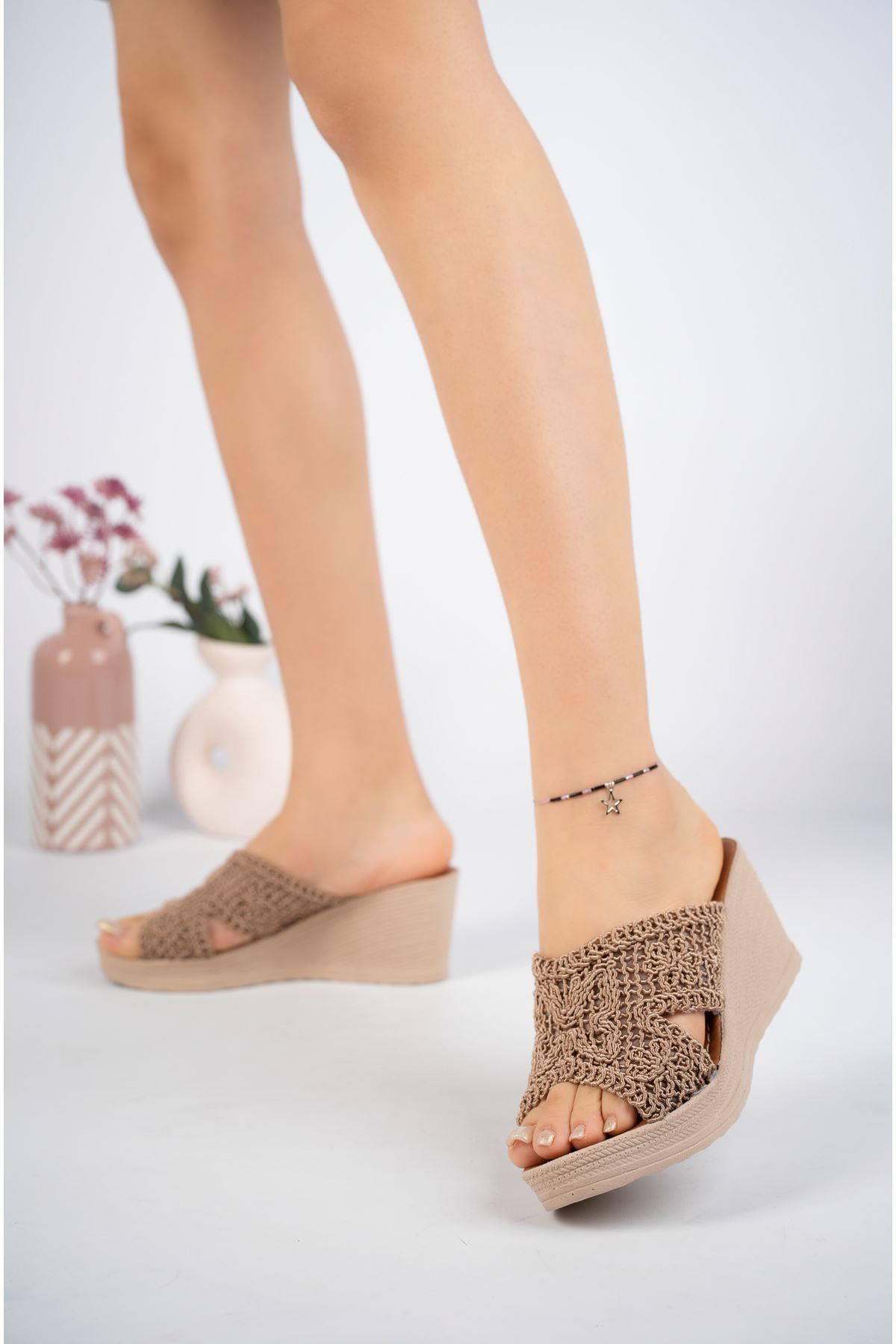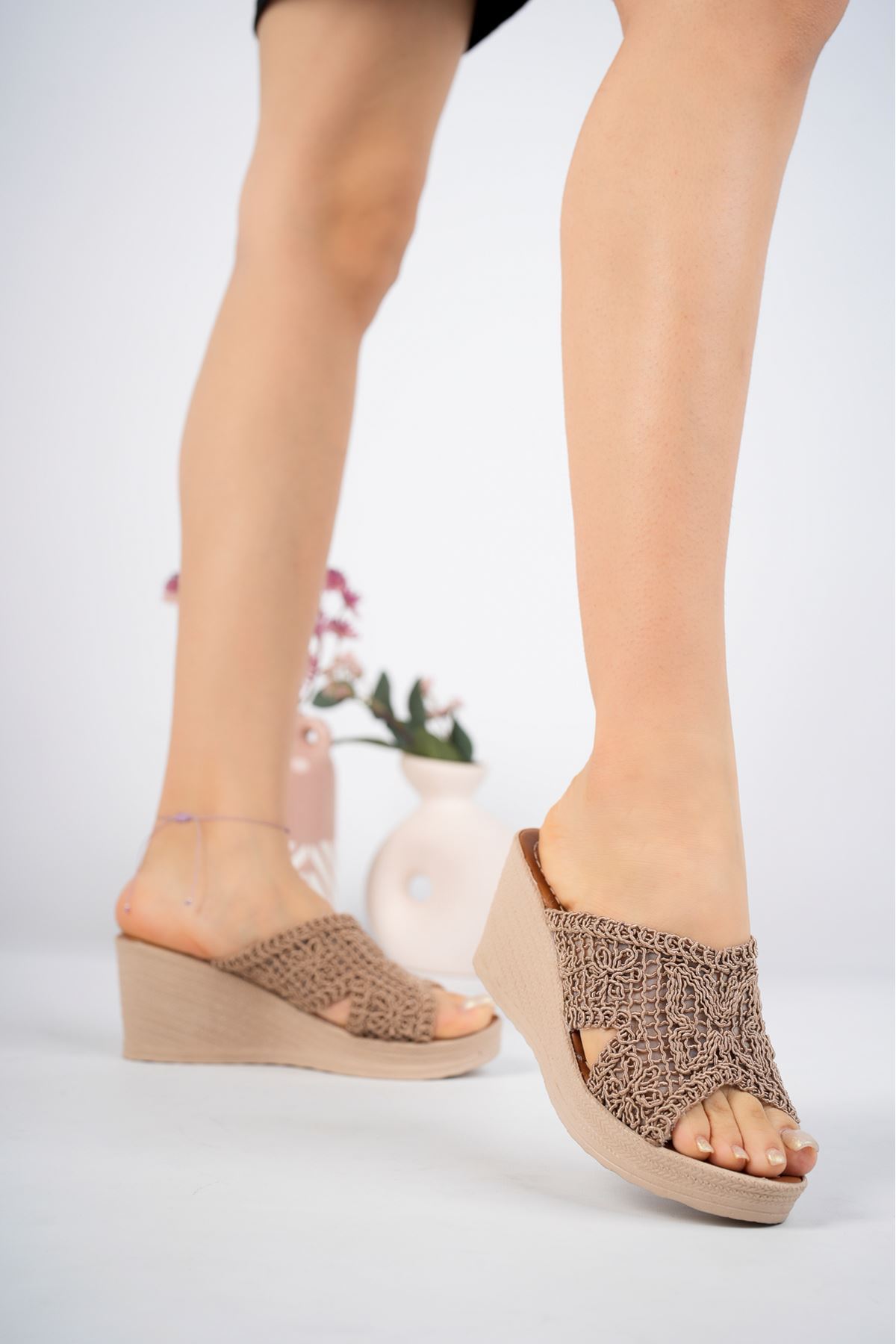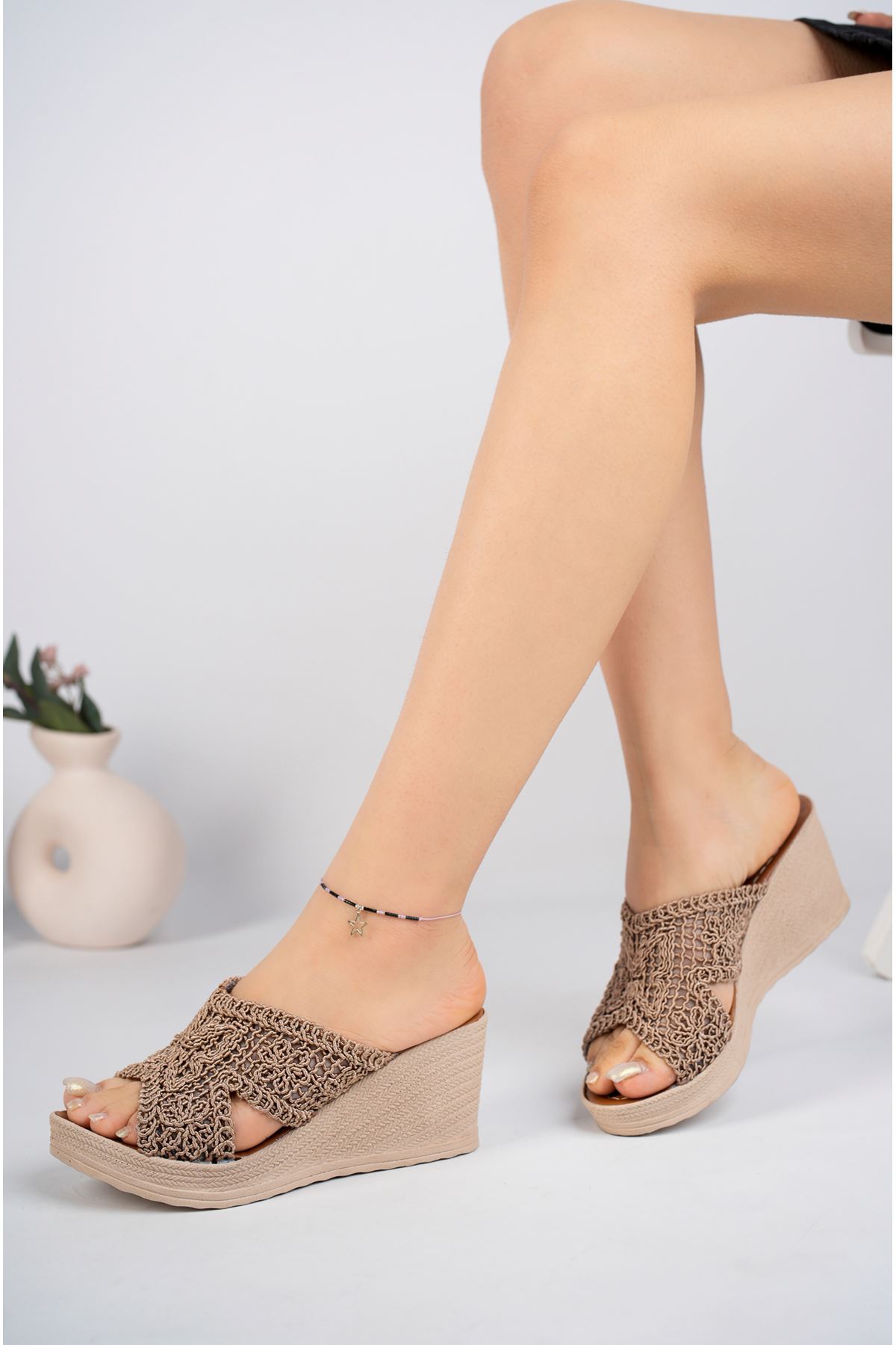 Dolgu Taban Önü Açık Örgü Vizon Kadın Terlik