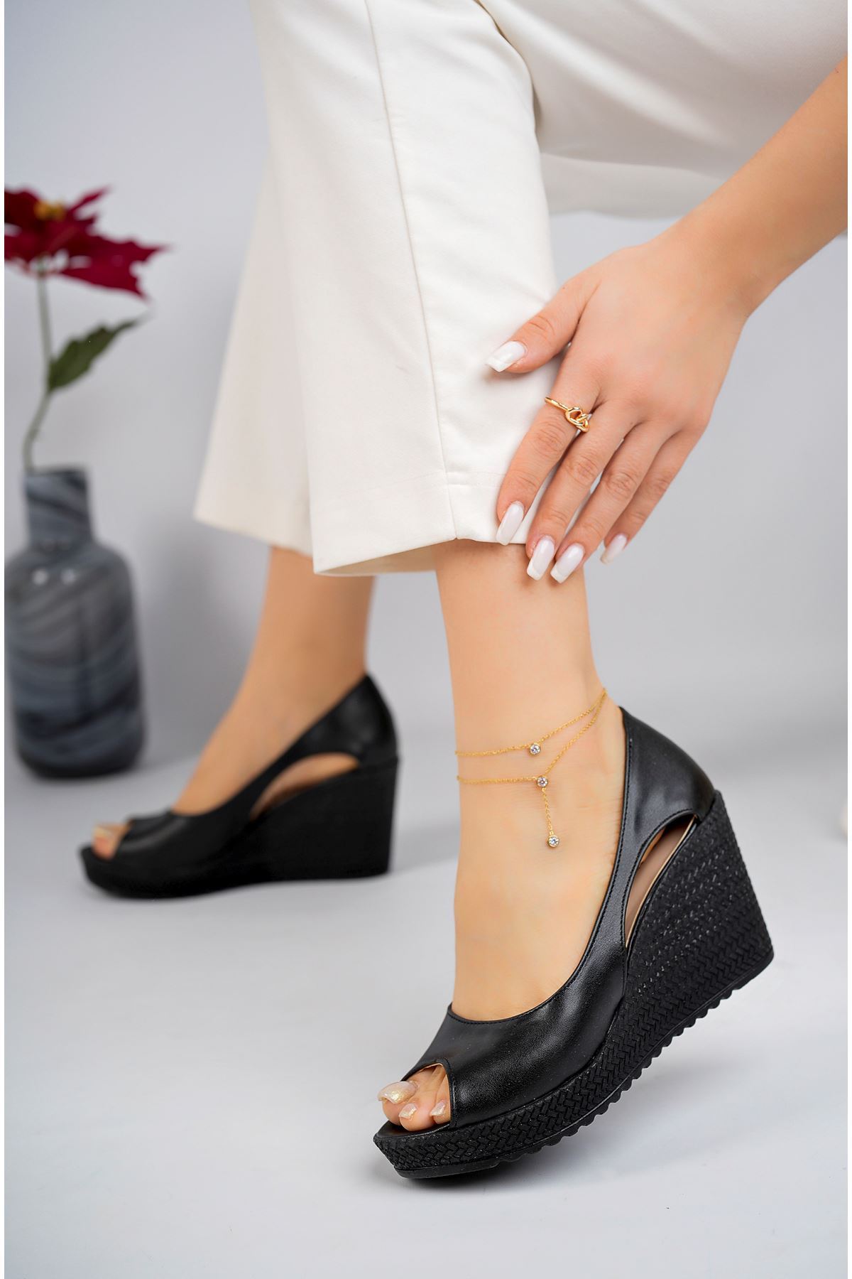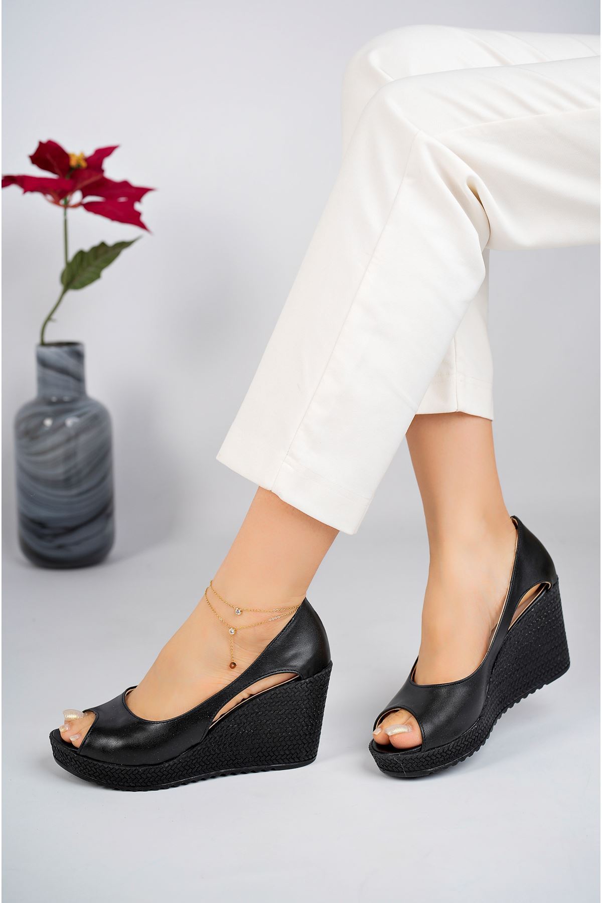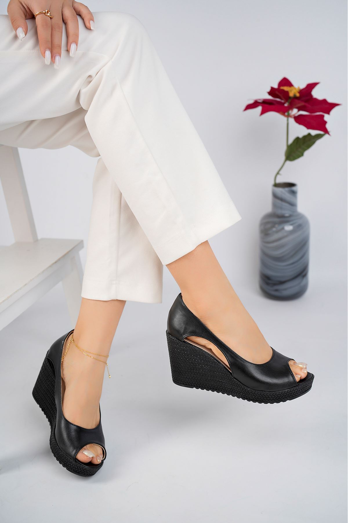 Dolgu Taban Önü Açık Siyah Cilt Kadın Ayakkabı