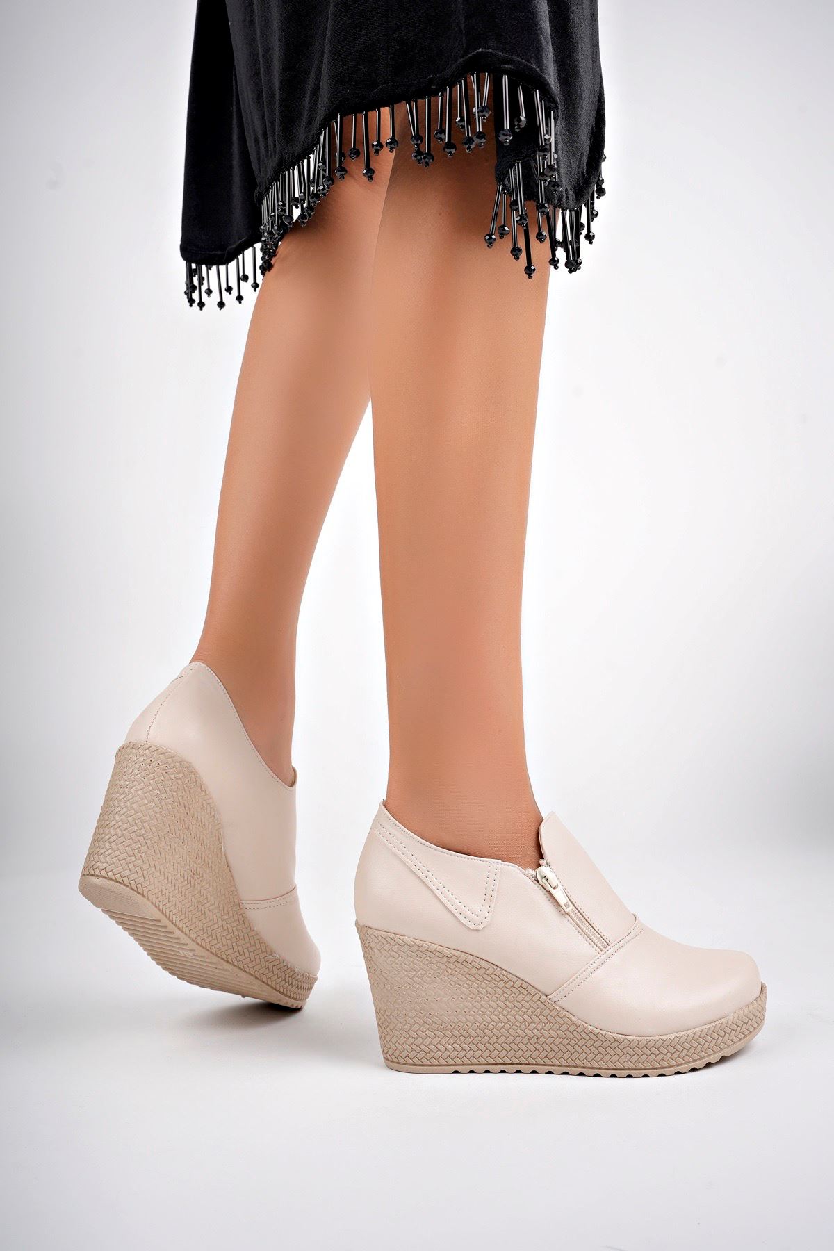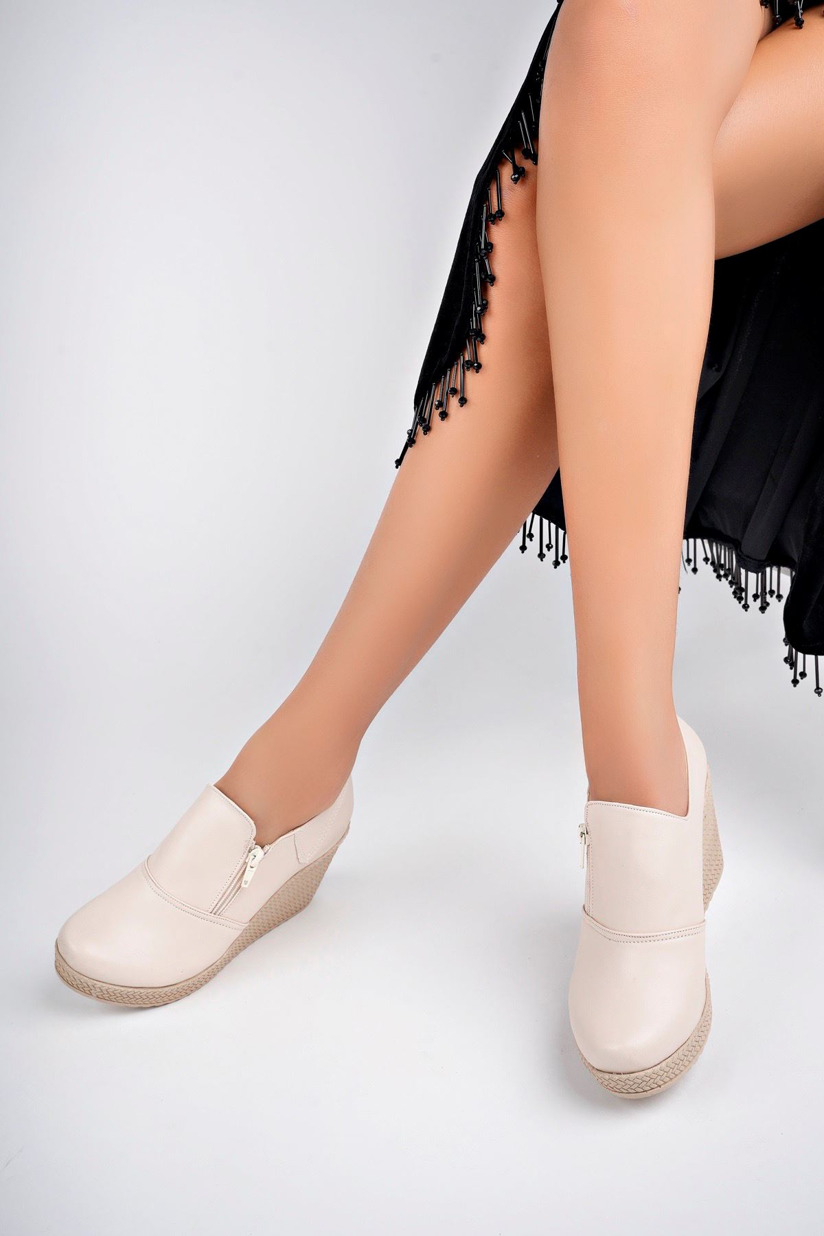 Dolgu Taban Yandan Fermuarlı Krem Cilt Ayakkabı
