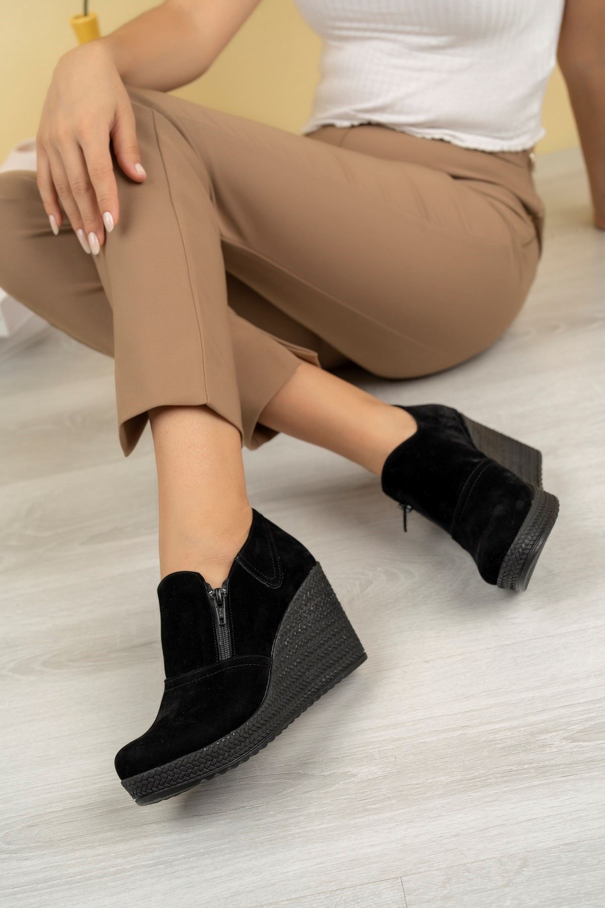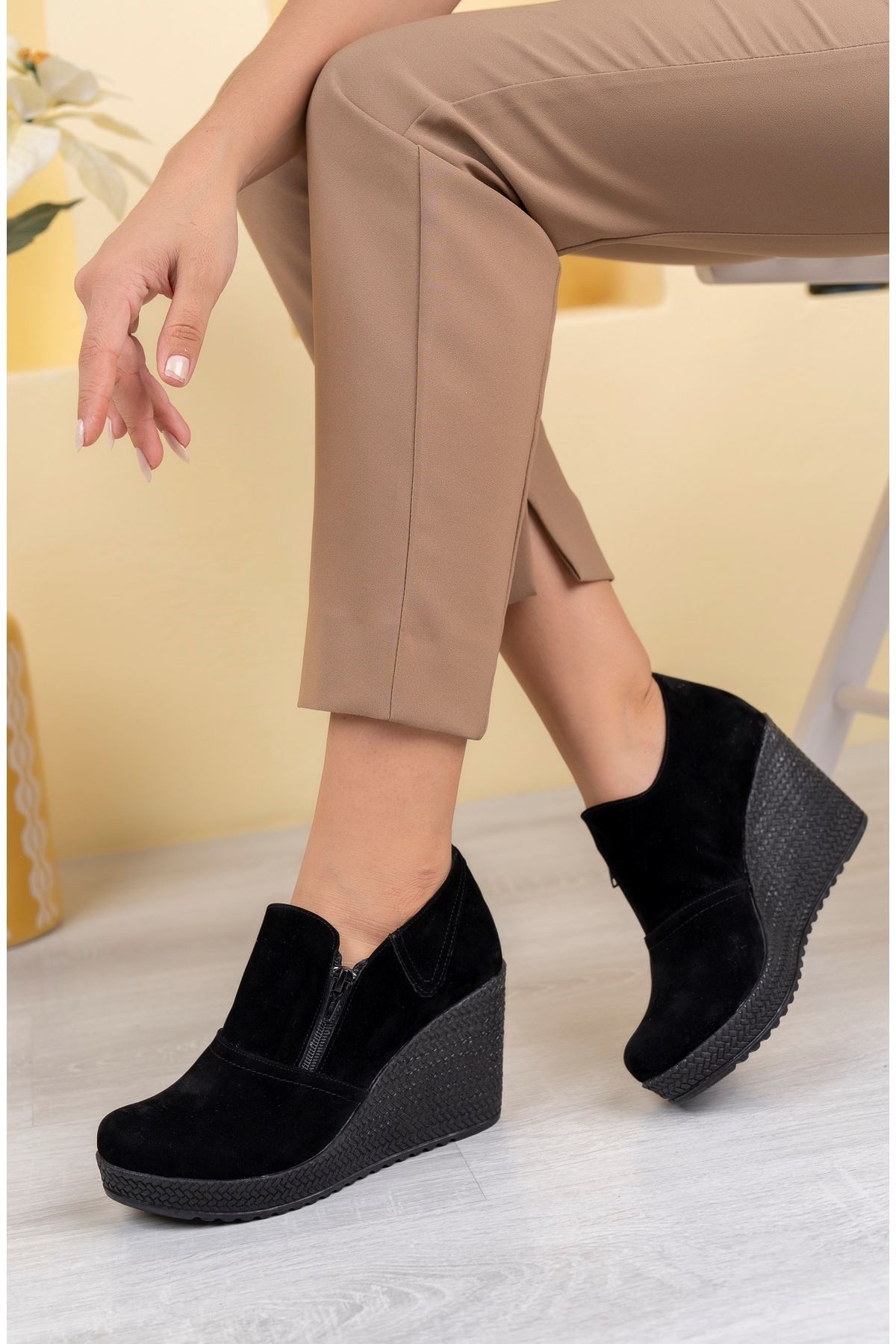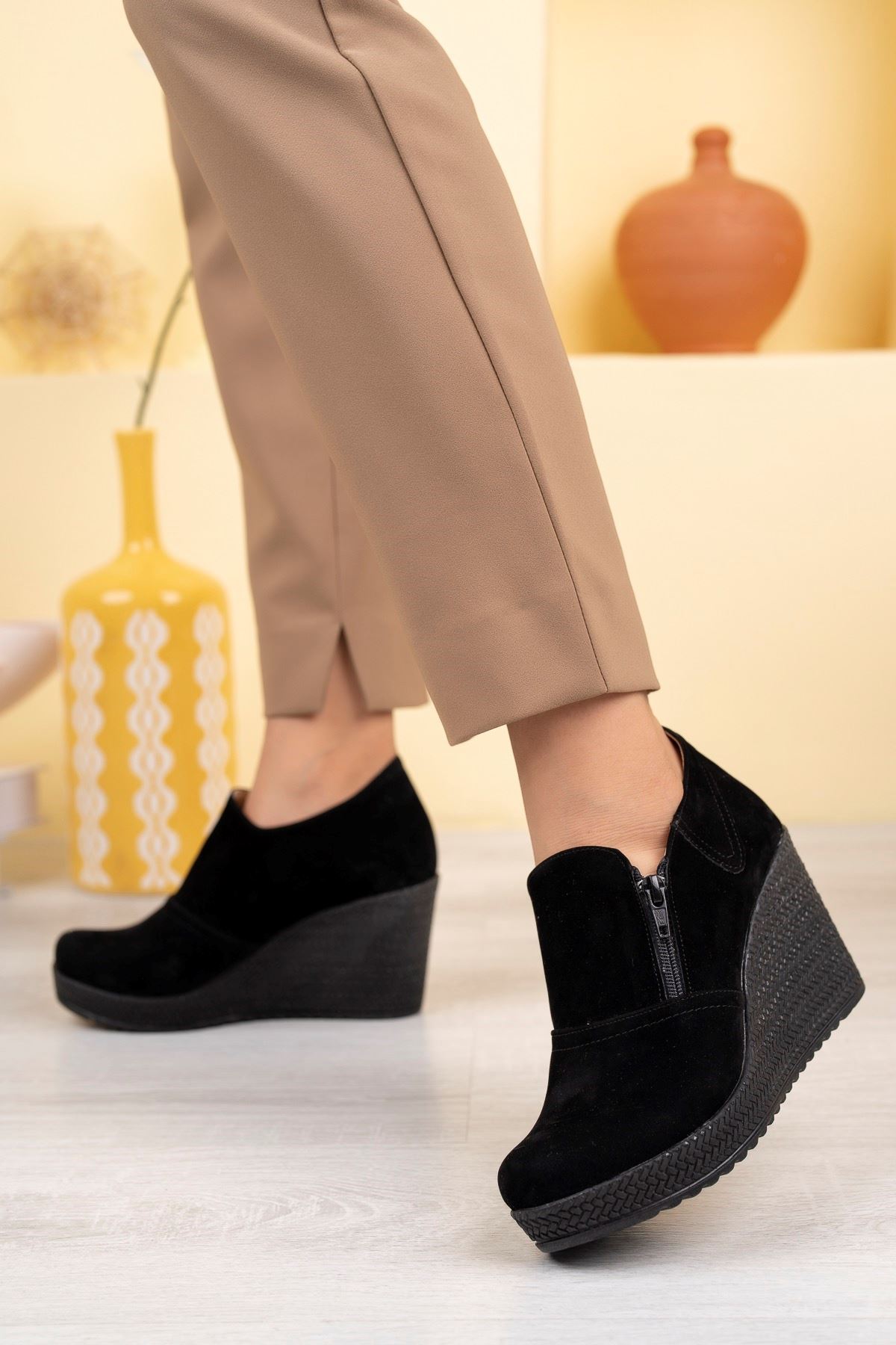 Dolgu Taban Yandan Fermuarlı Siyah Süet Ayakkabı