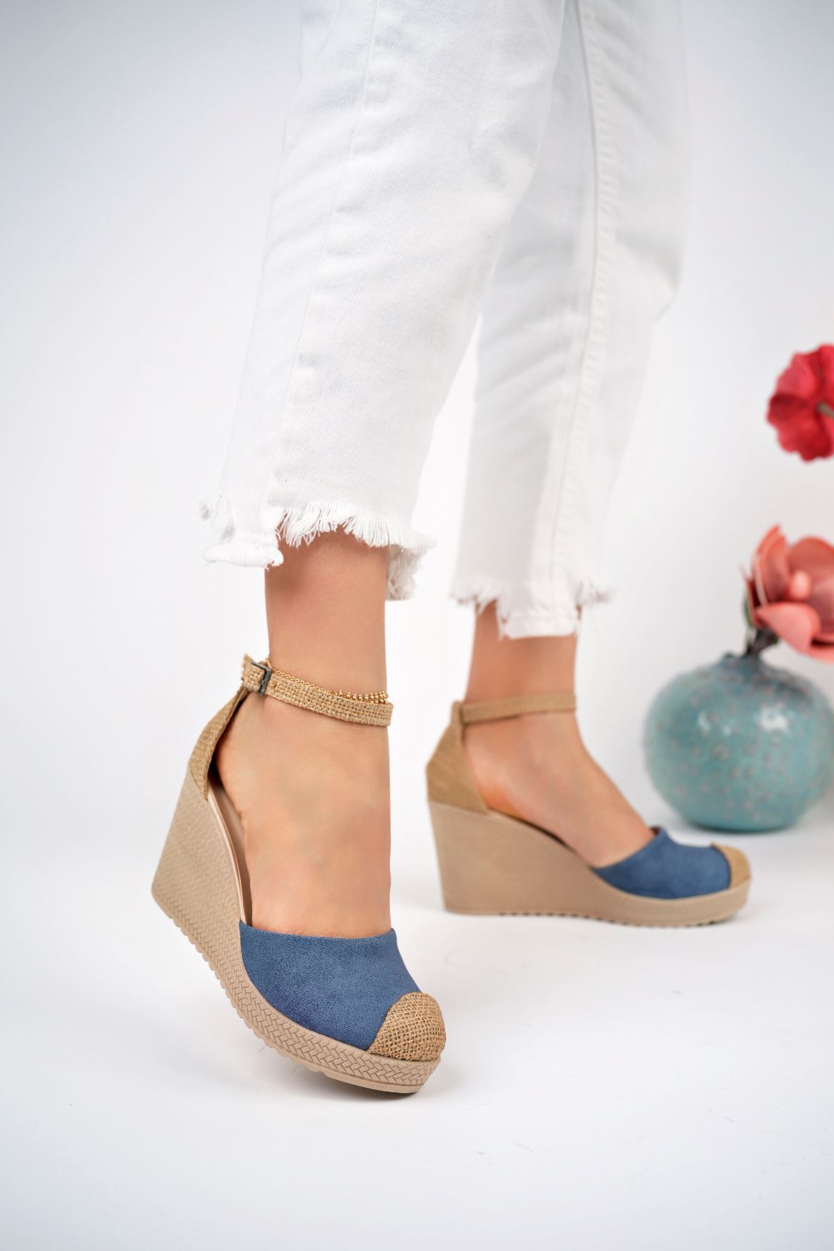 Dolgu Topuk Hasır Lacivert Kot Karnıyarık Ayakkabı