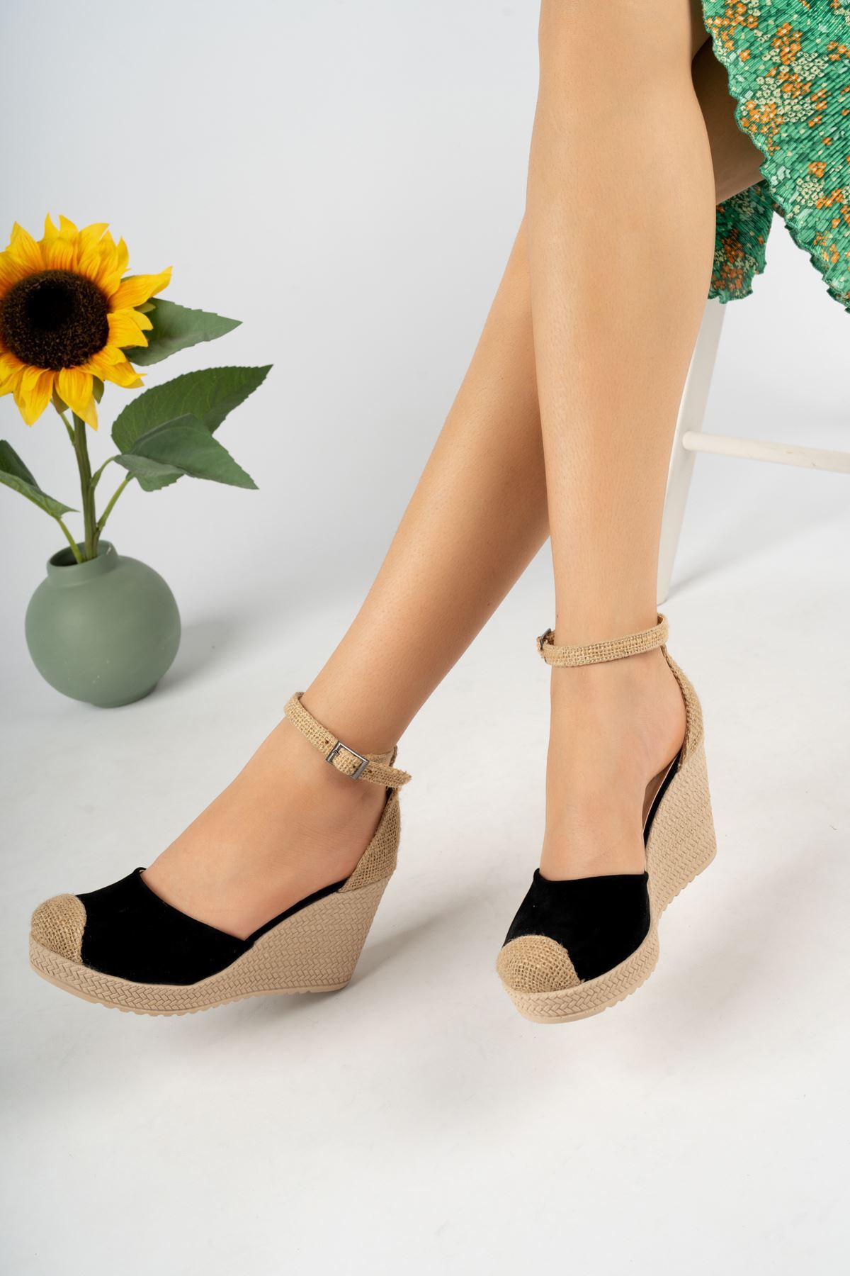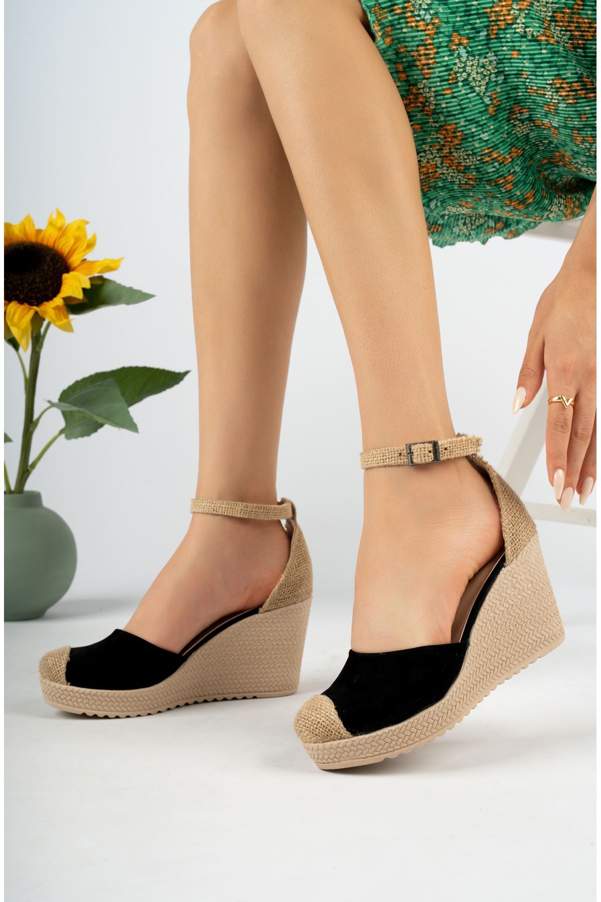 Dolgu Topuk Hasır Siyah Süet Karnıyarık Ayakkabı