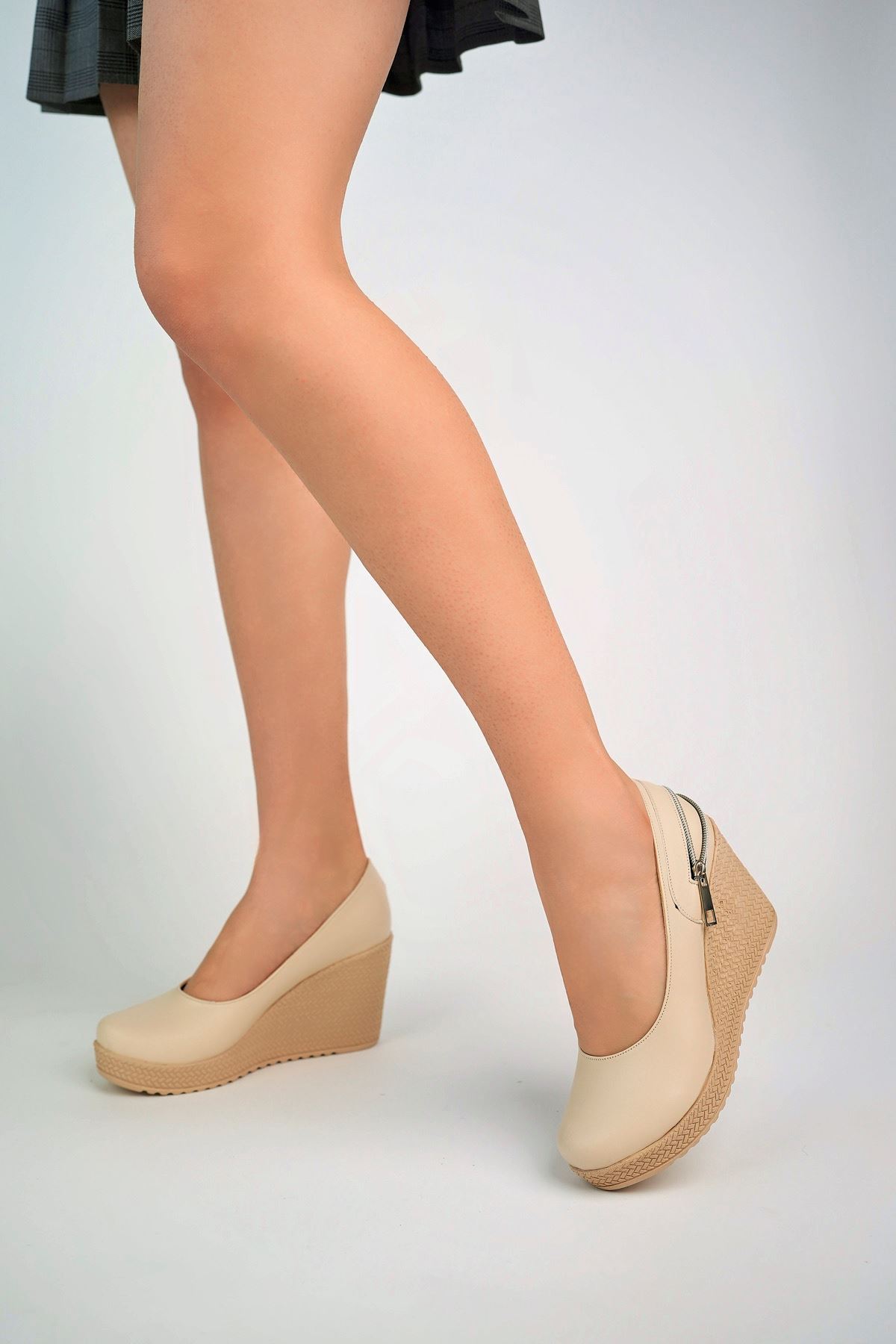 Dolgu Topuk Krem Cilt Kadın Ayakkabı