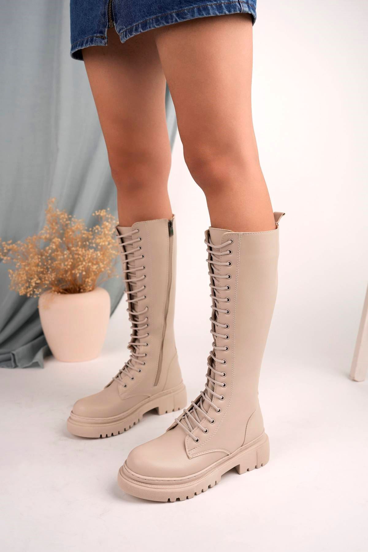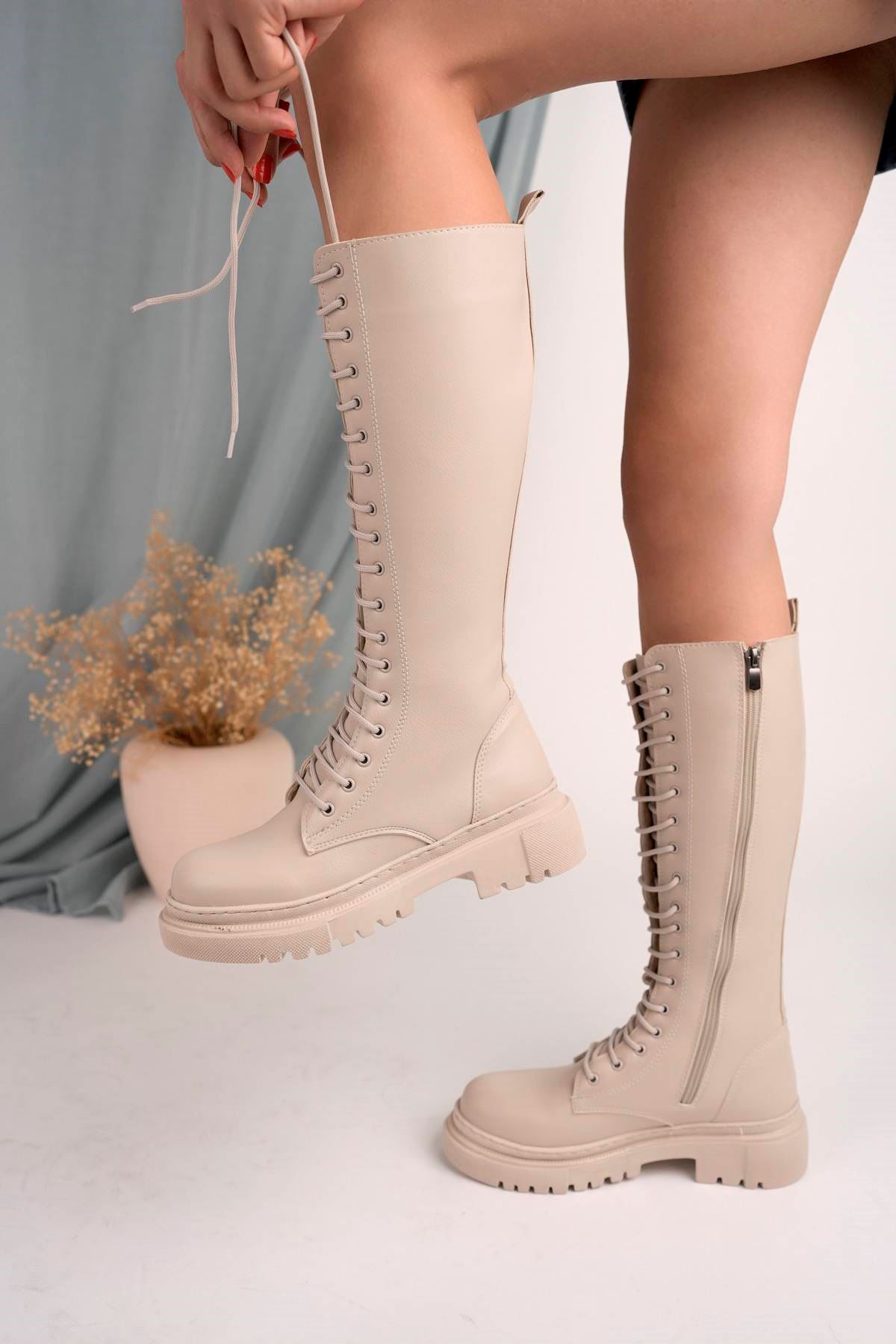 Fermuarlı Bağcıklı Uzun Krem Cilt Kadın Postal Bot