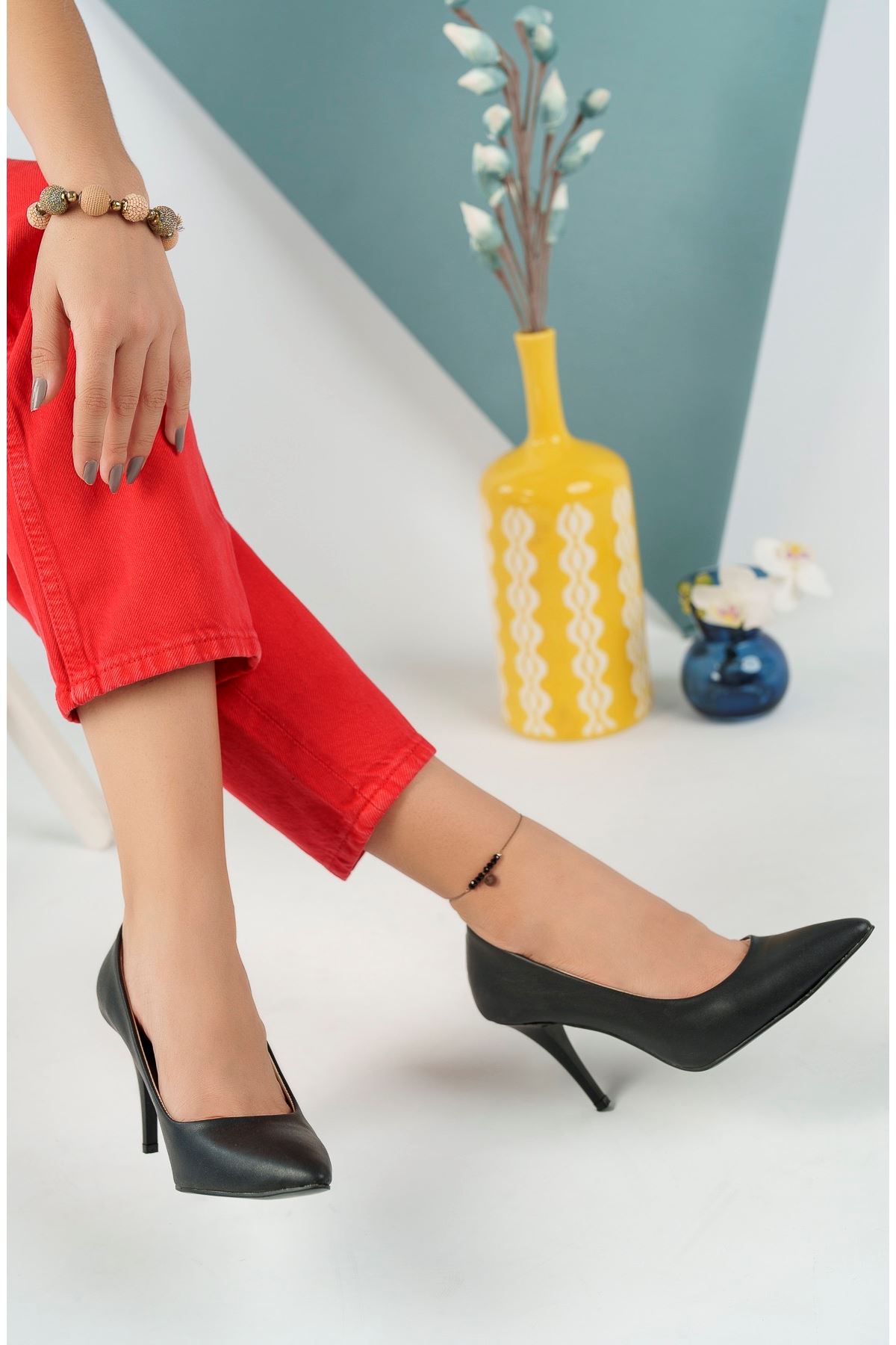 İnce Topuk Siyah Cilt Stiletto