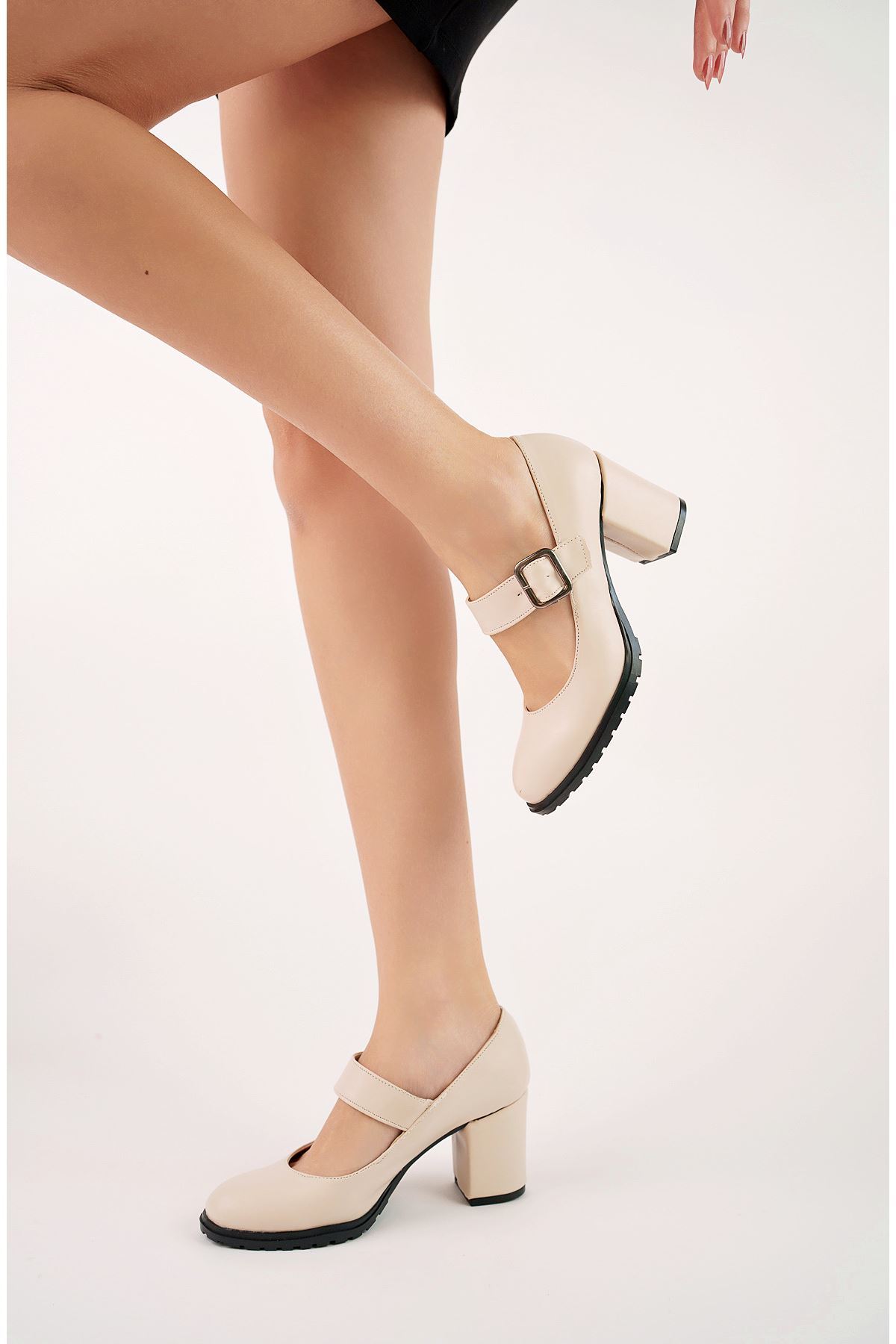Kalın Bant Krem Cilt Kadın Ayakkabı