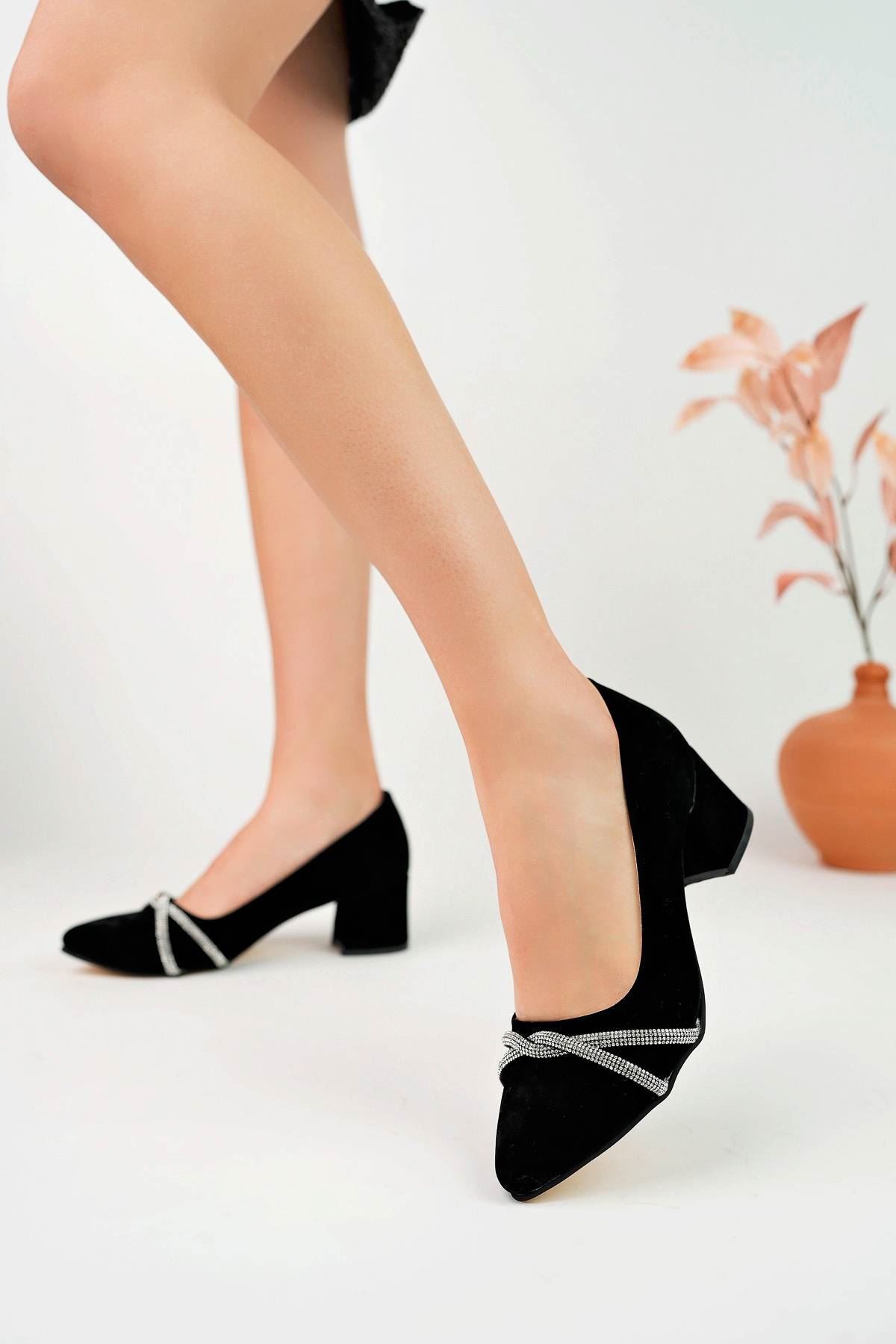 Ökçeli Biyesi Taşlı Siyah Süet Kadın Stiletto