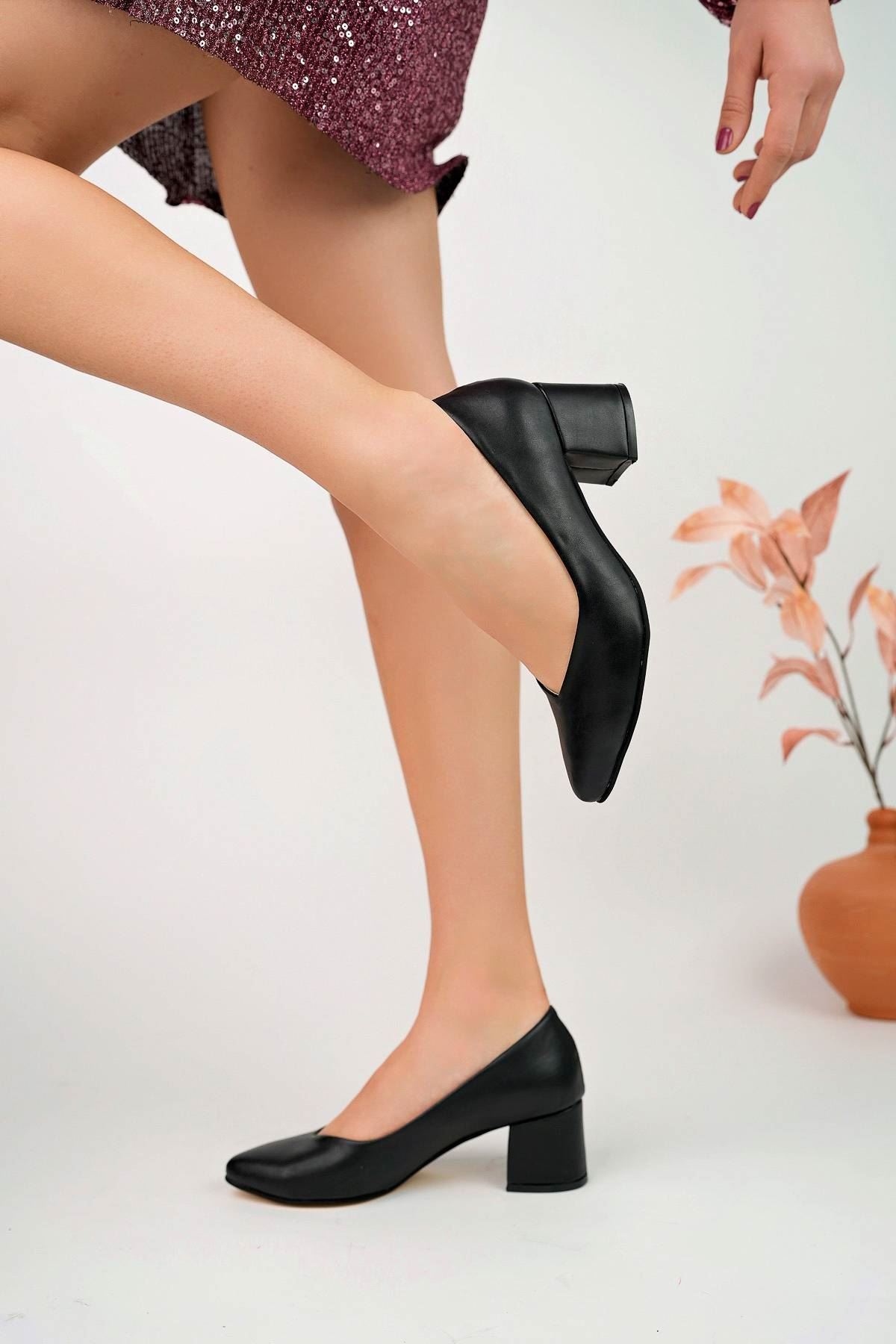 Ökçeli Sivri Kalıp Siyah Cilt Kadın Ayakkabı