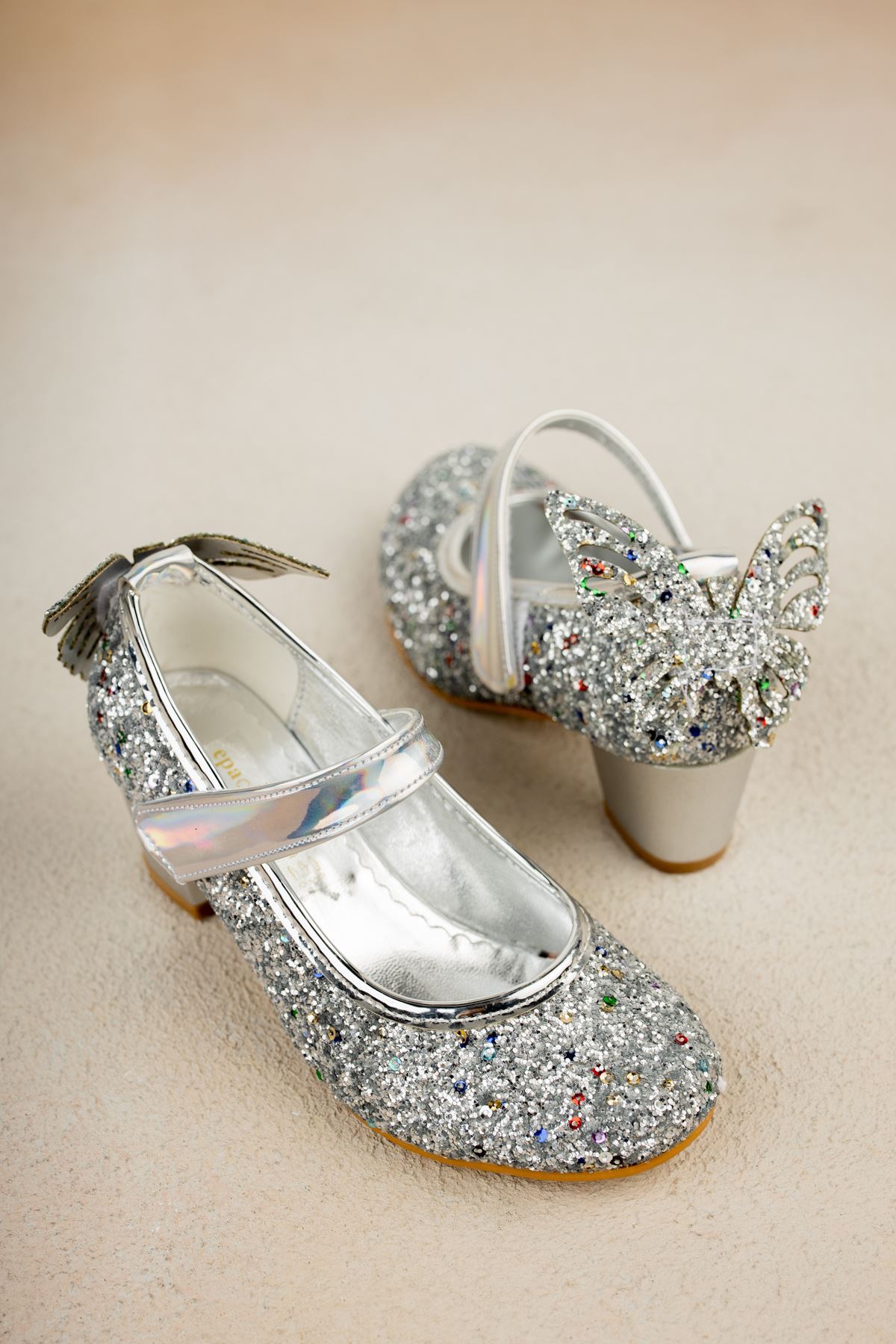 Topuklu Arkası Kelebekli Gümüş Taşlı Ayakkabı