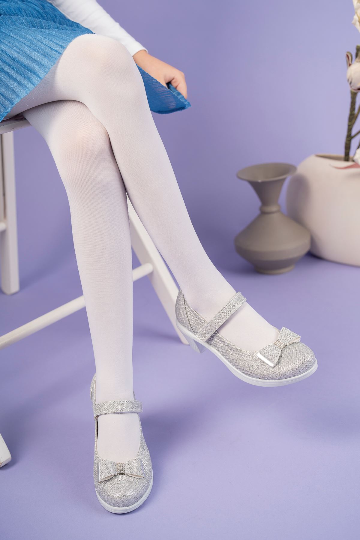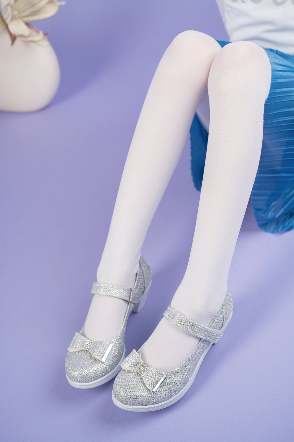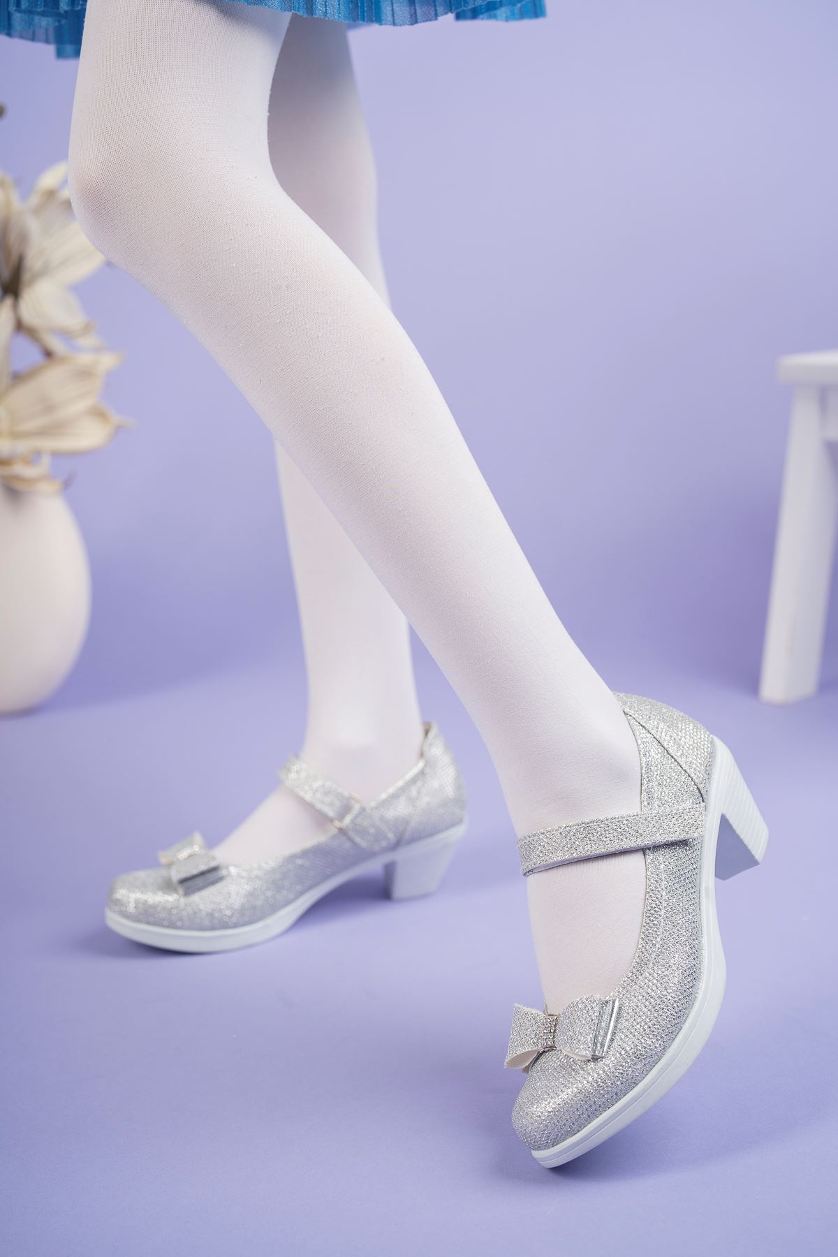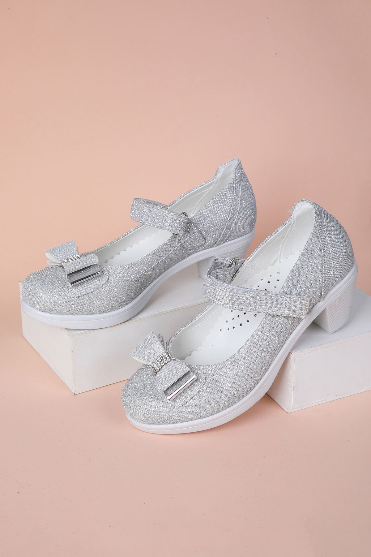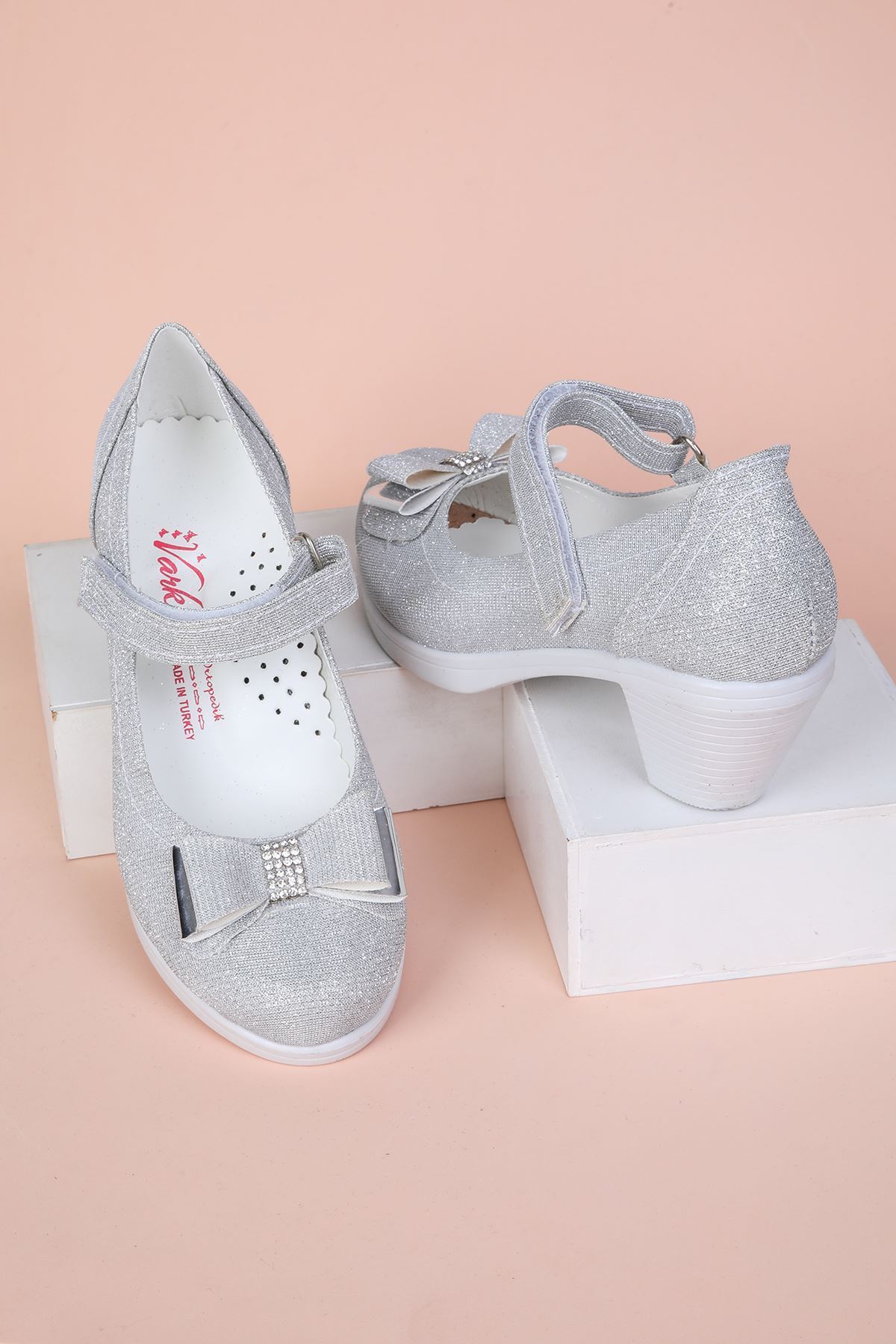 Topuklu Gümüş Simli Kız Çocuk Ayakkabı