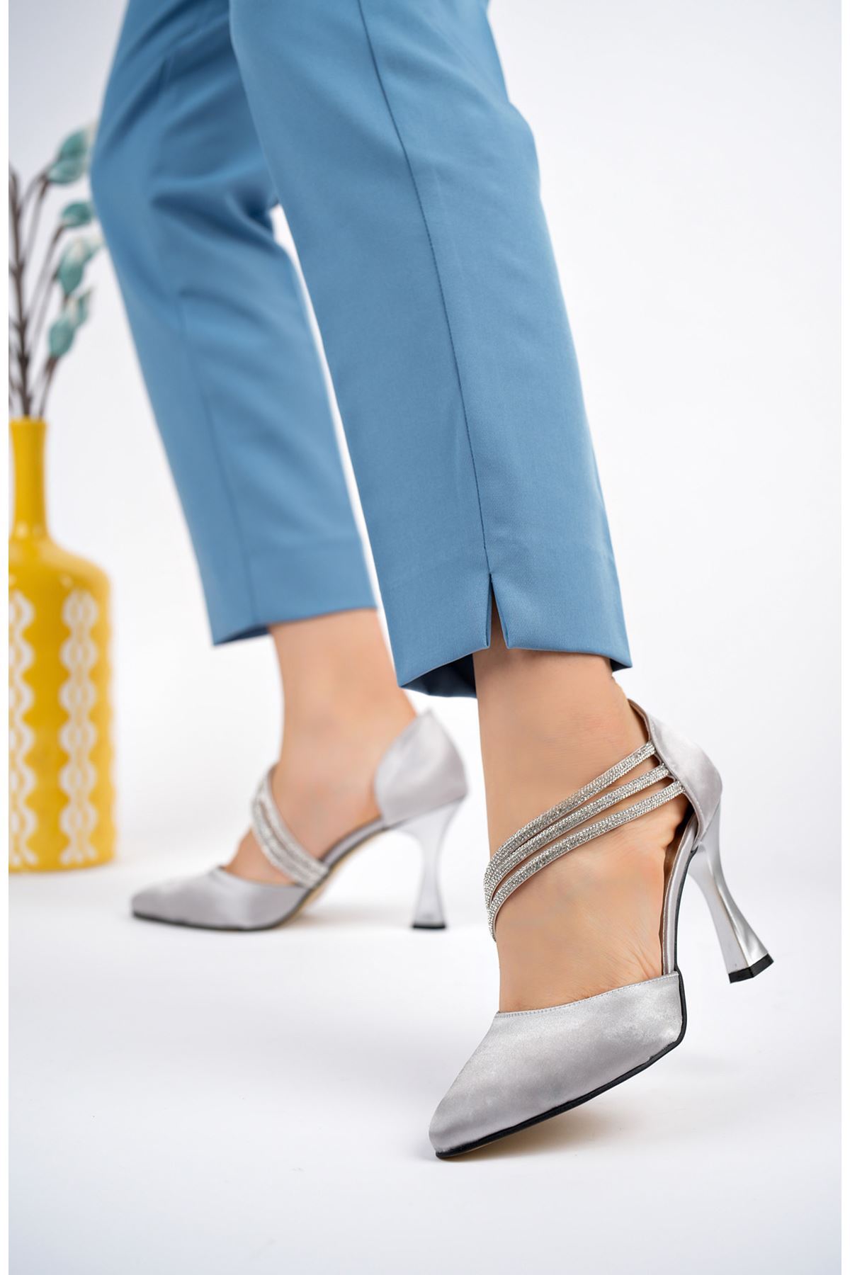 Üç Biyeli Taşlı Gümüş Saten Karnıyarık Ayakkabı