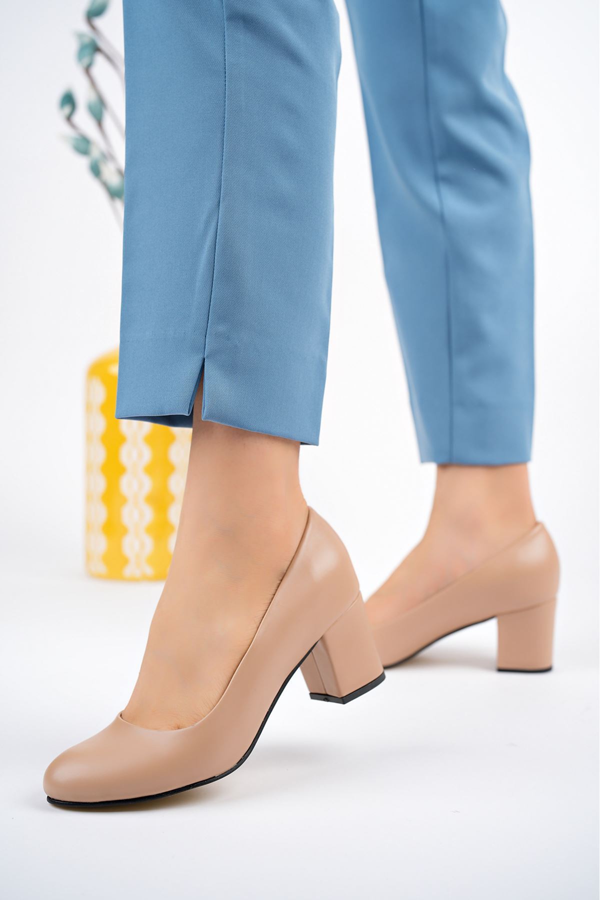 Alçak Topuk Yuvarlak Kalıp Nut Cilt Stiletto