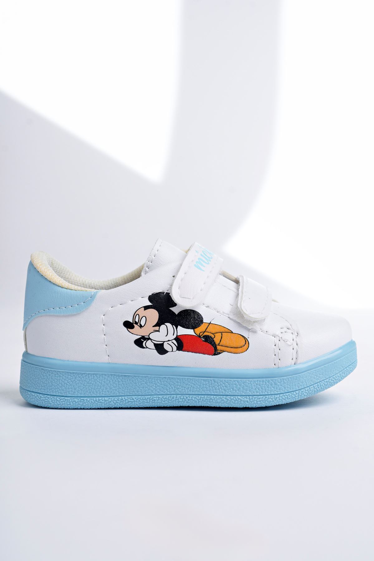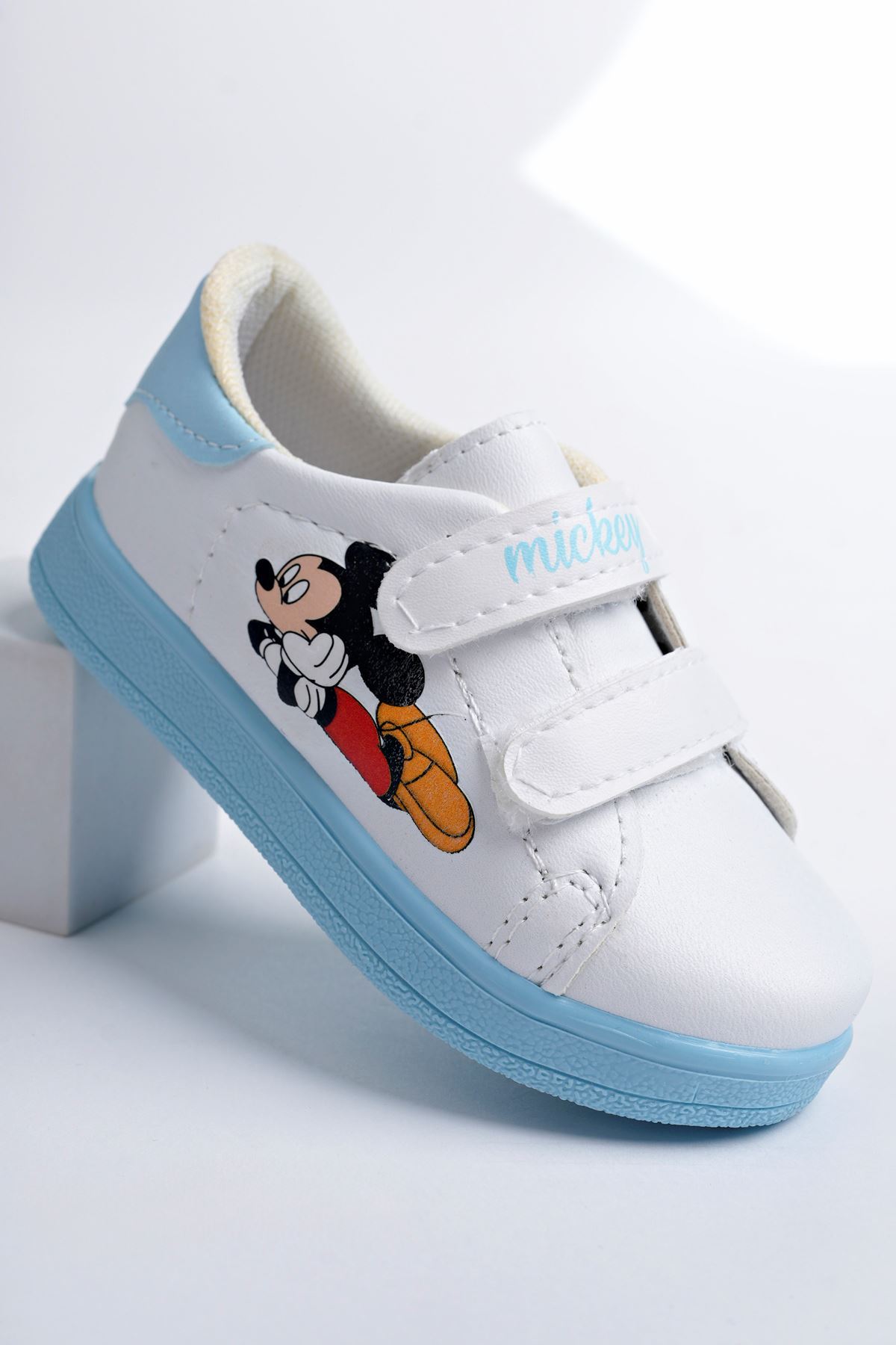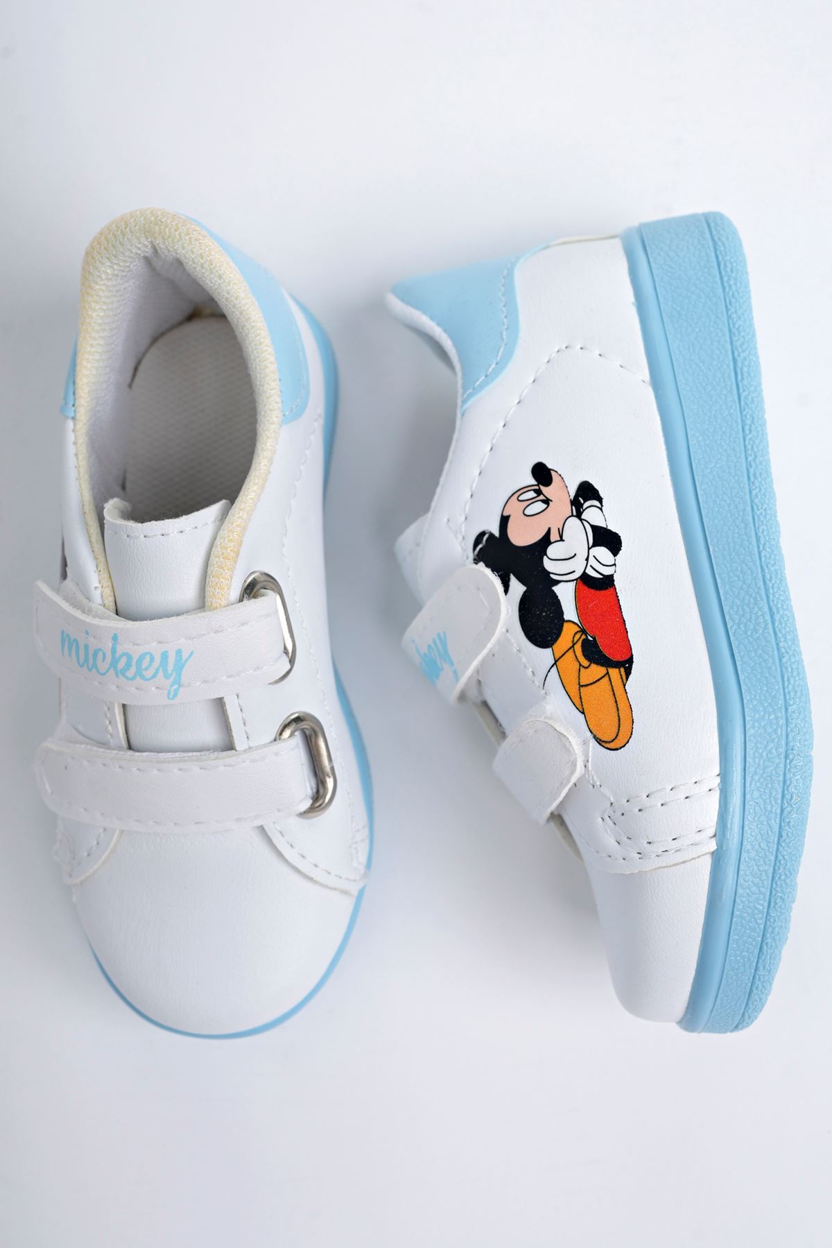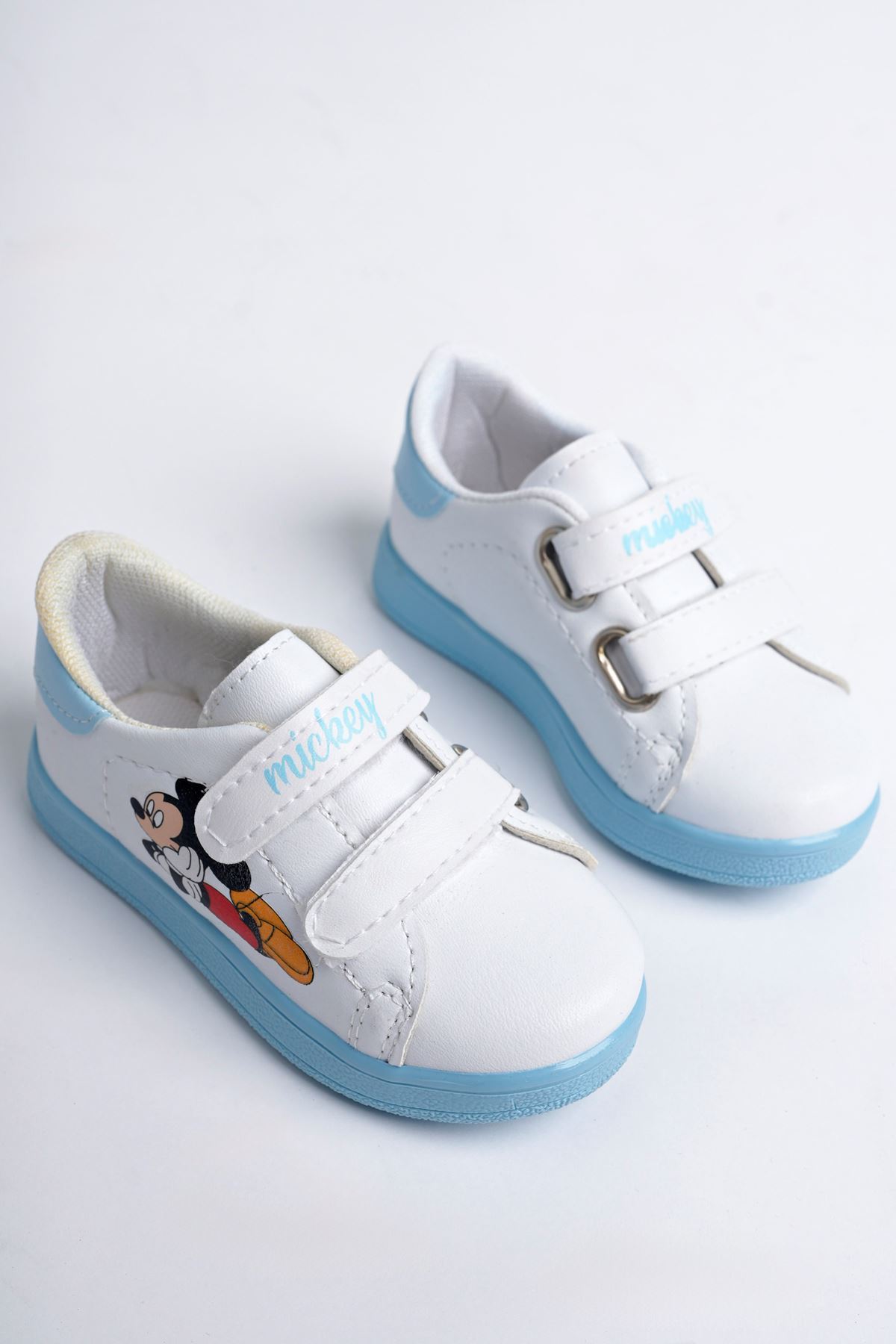 Baskılı Beyaza Mavi Garnili Bebe Ayakkabı