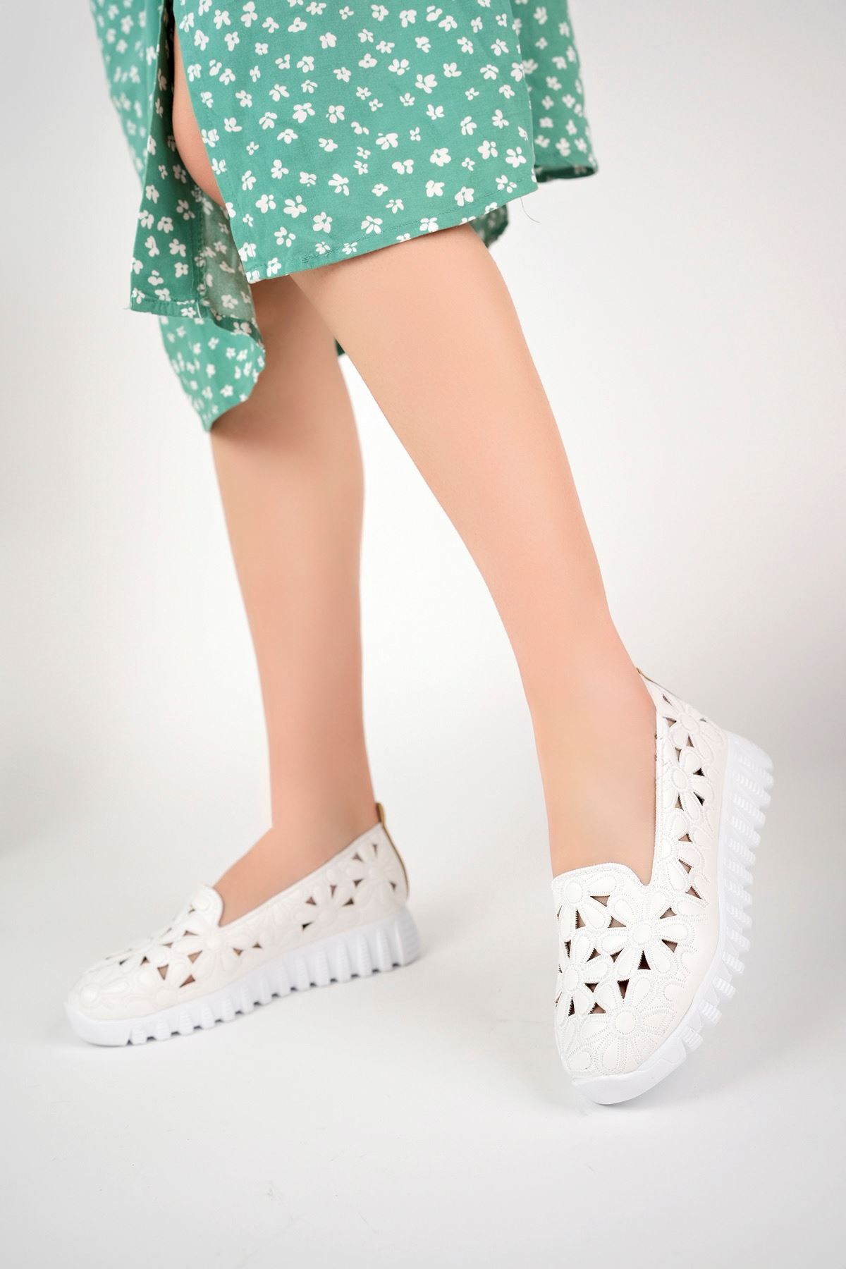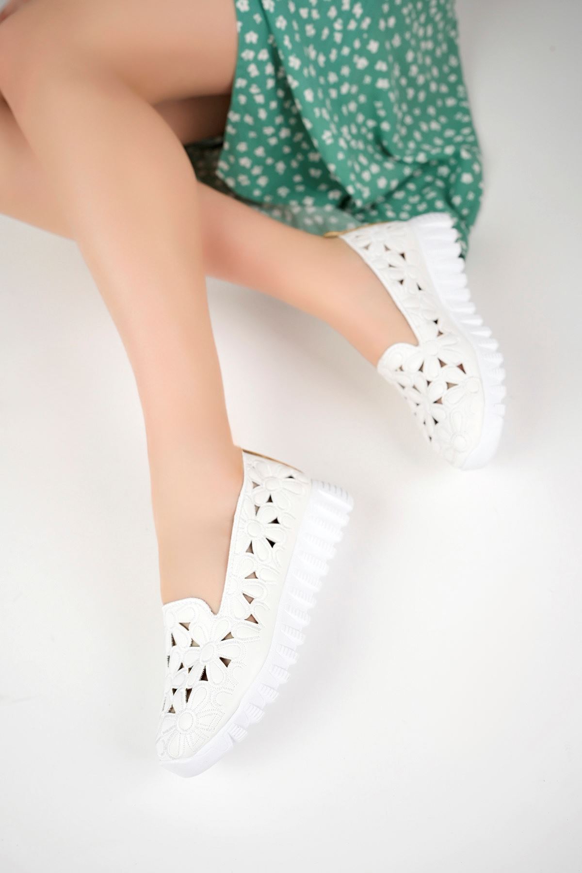 Çiçek Lazerli Beyaz Ayakkabı