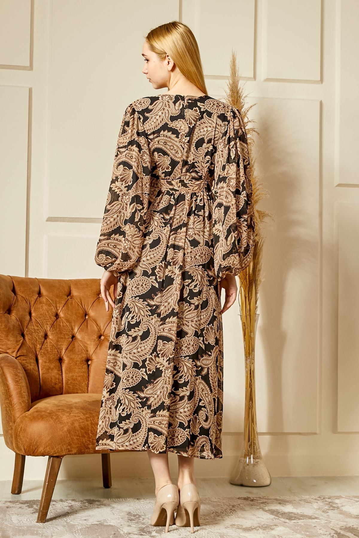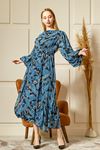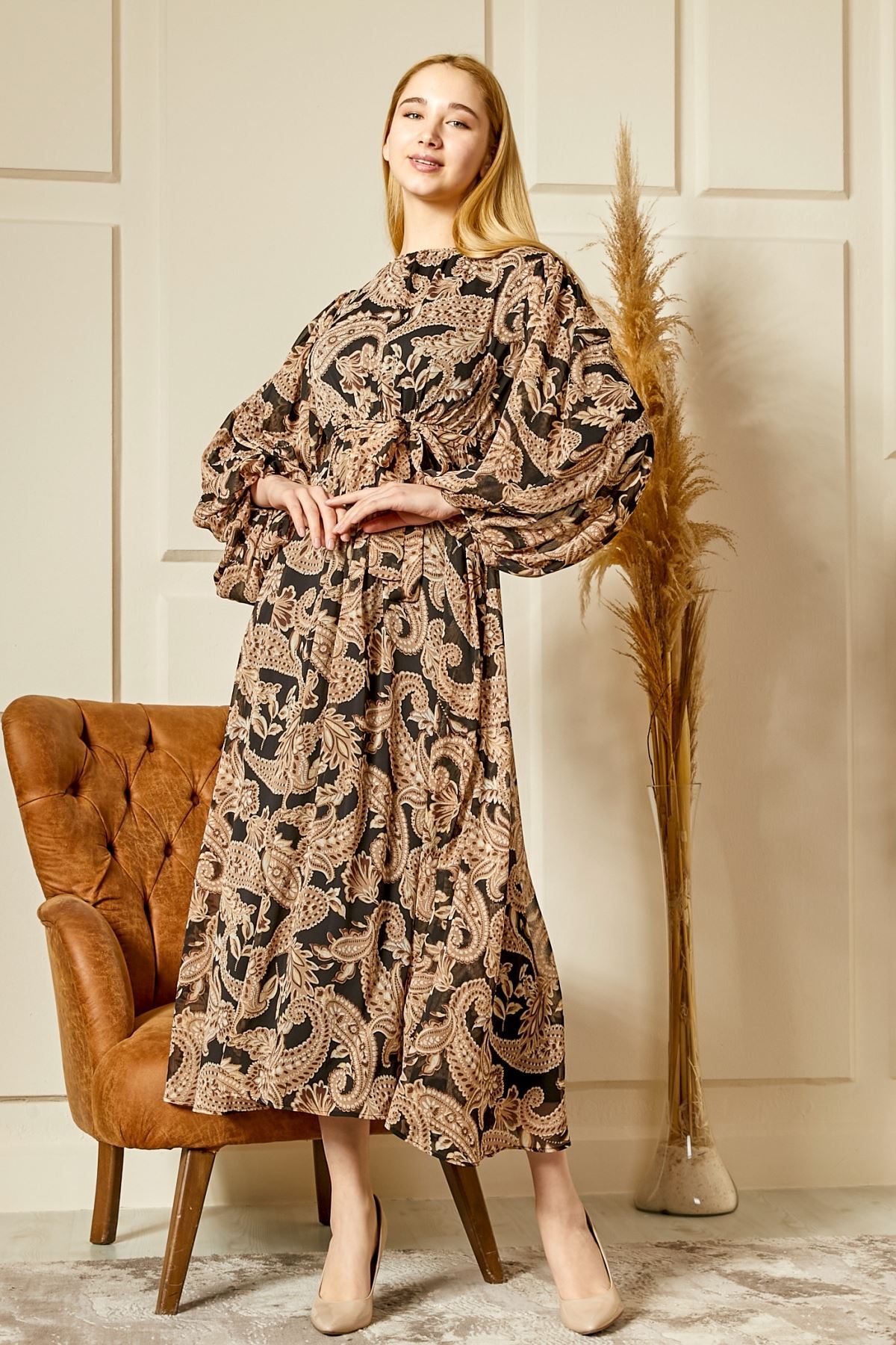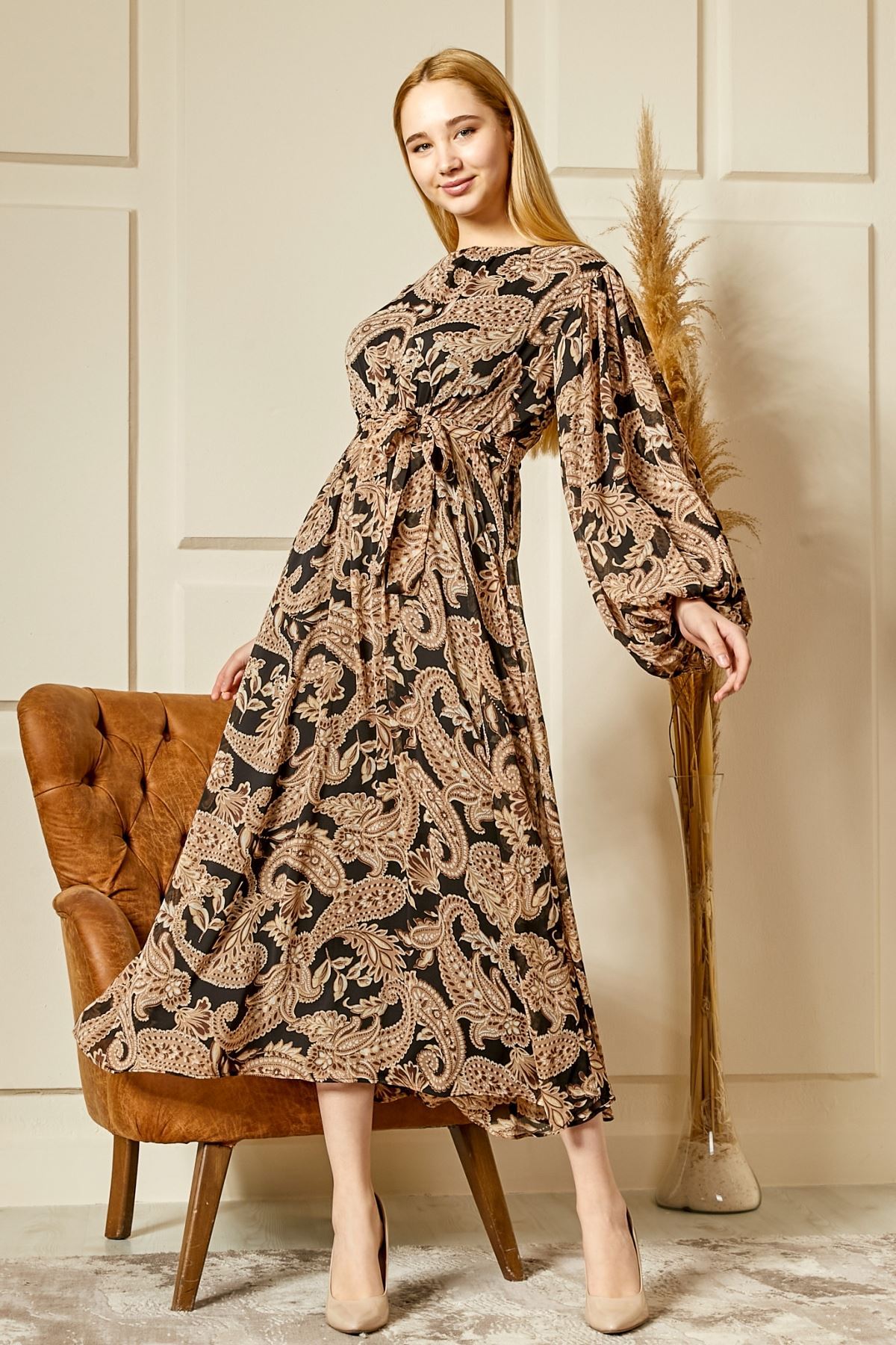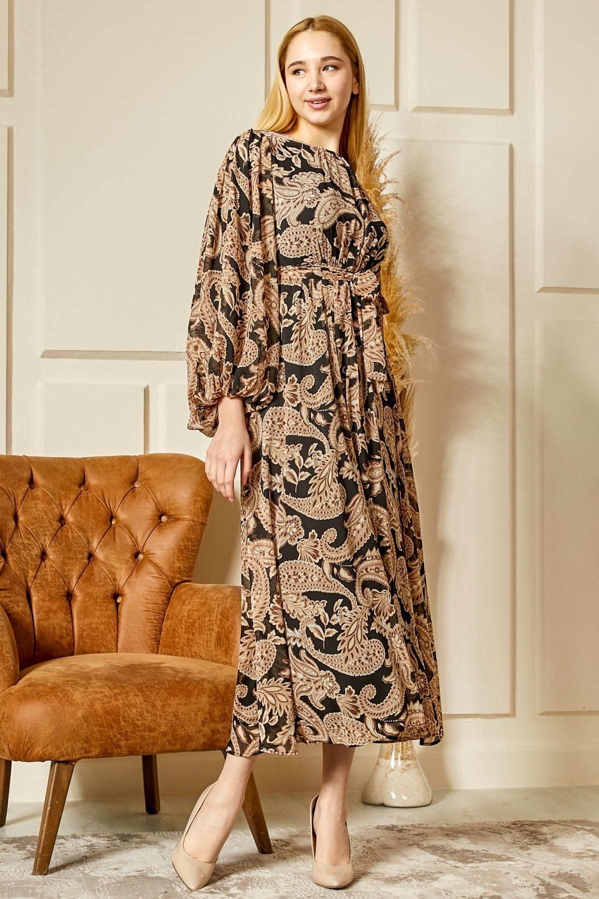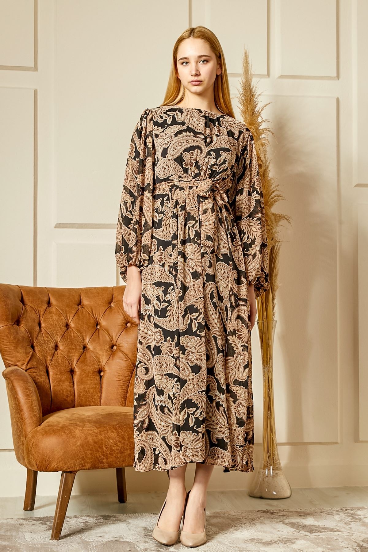 Desenli Beli Kuşaklı Şifon Kadın Elbise