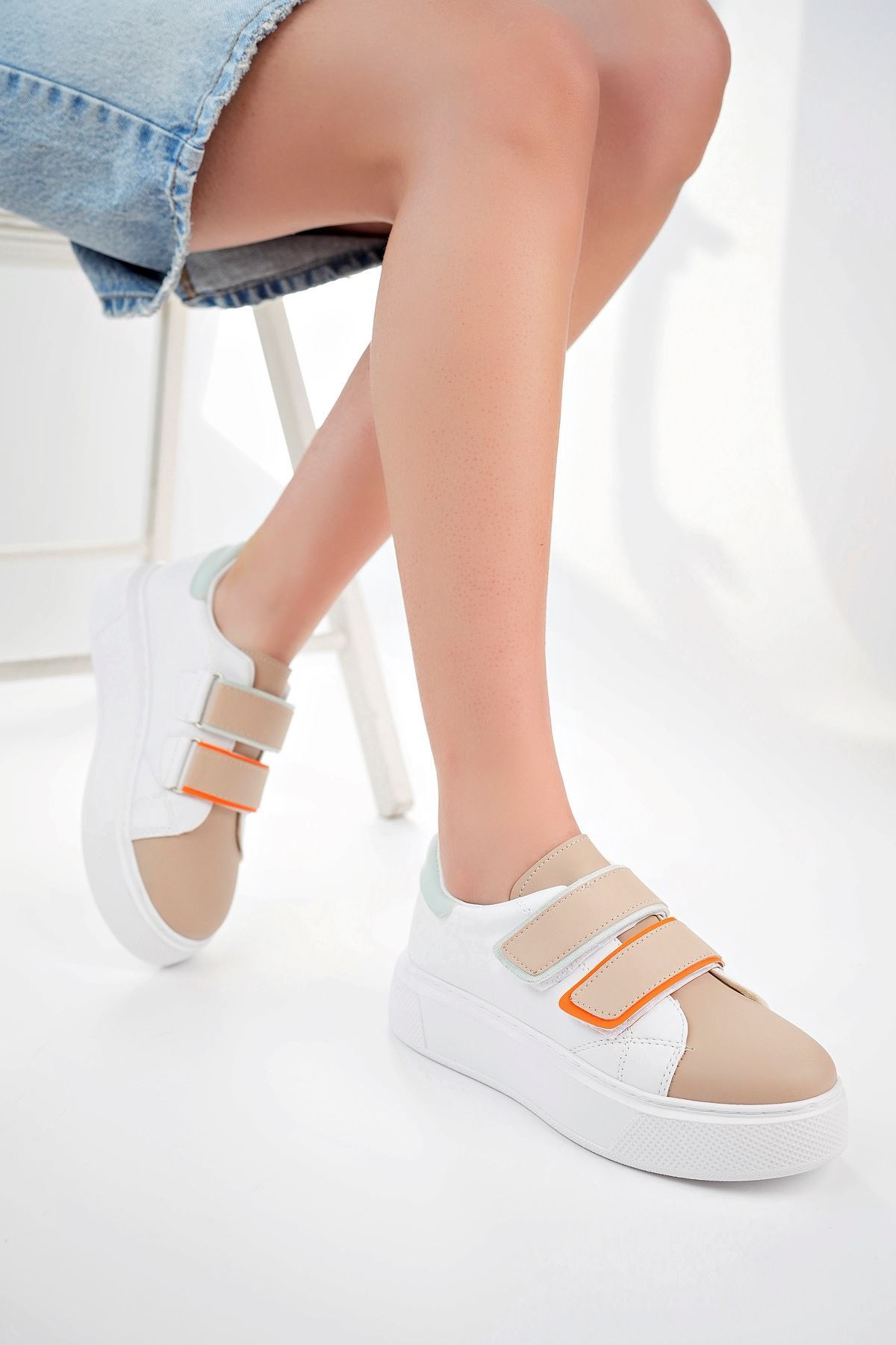 Dolgu Taban Cırtlı Beyaz Vizon Garnili Kadın Ayakkabı