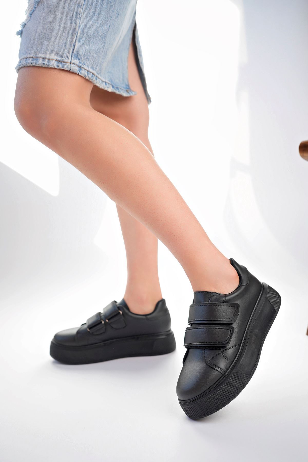 Dolgu Taban Cırtlı Siyah Cilt Kadın Ayakkabı