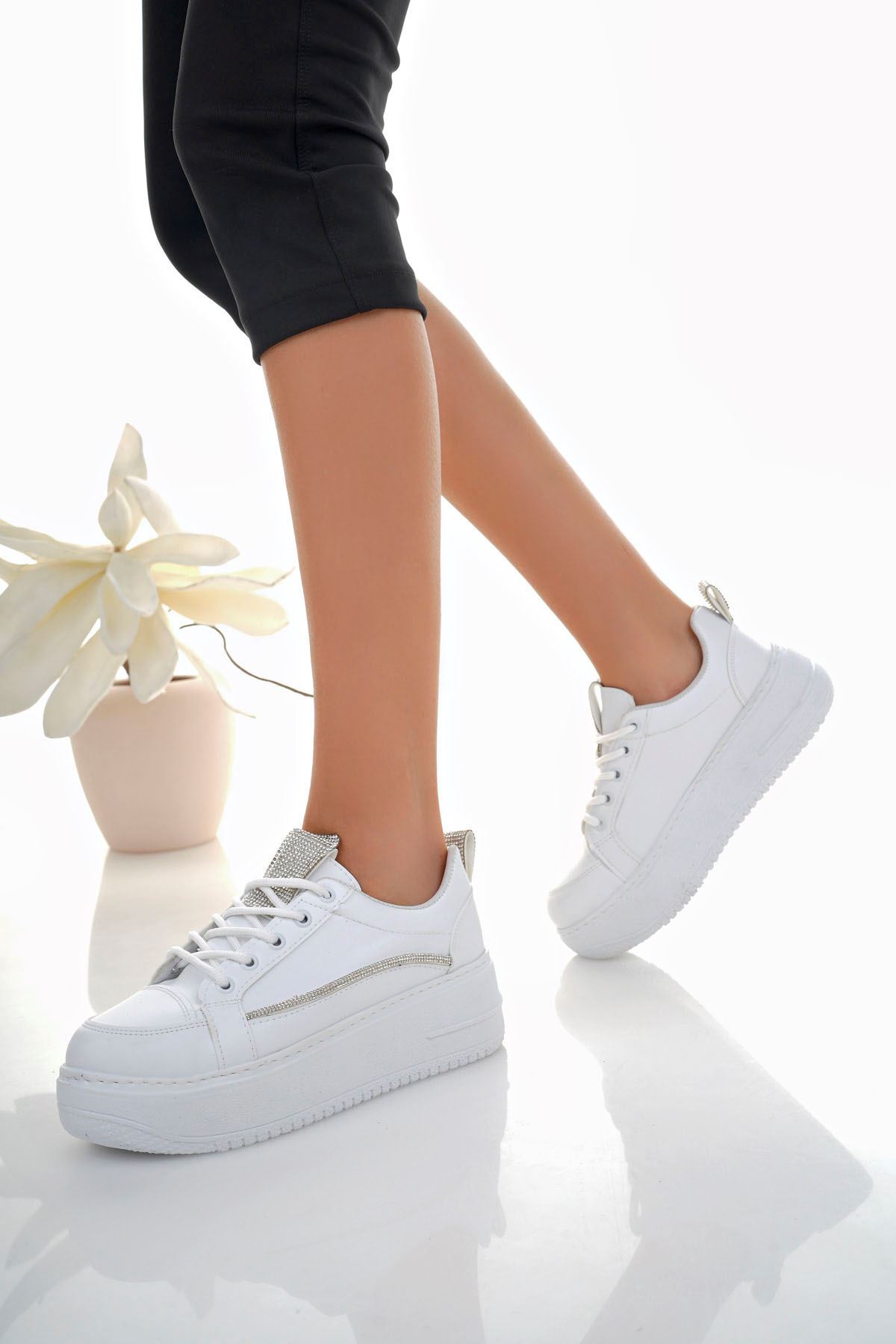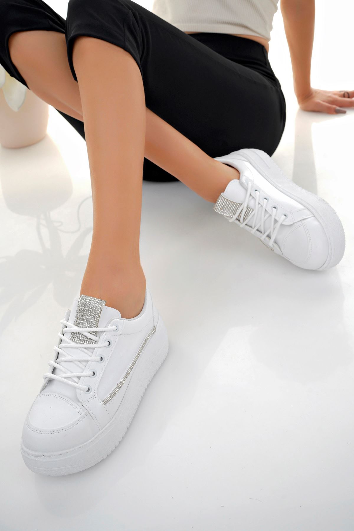 Dolgu Taban Taşlı Beyaz Kadın Ayakkabı