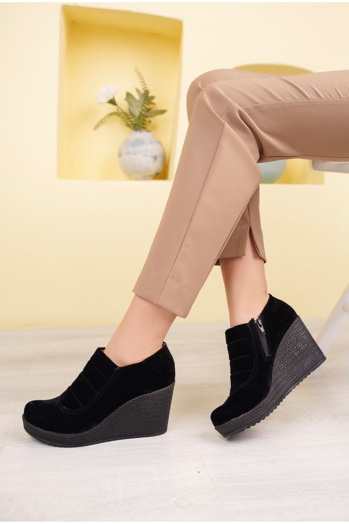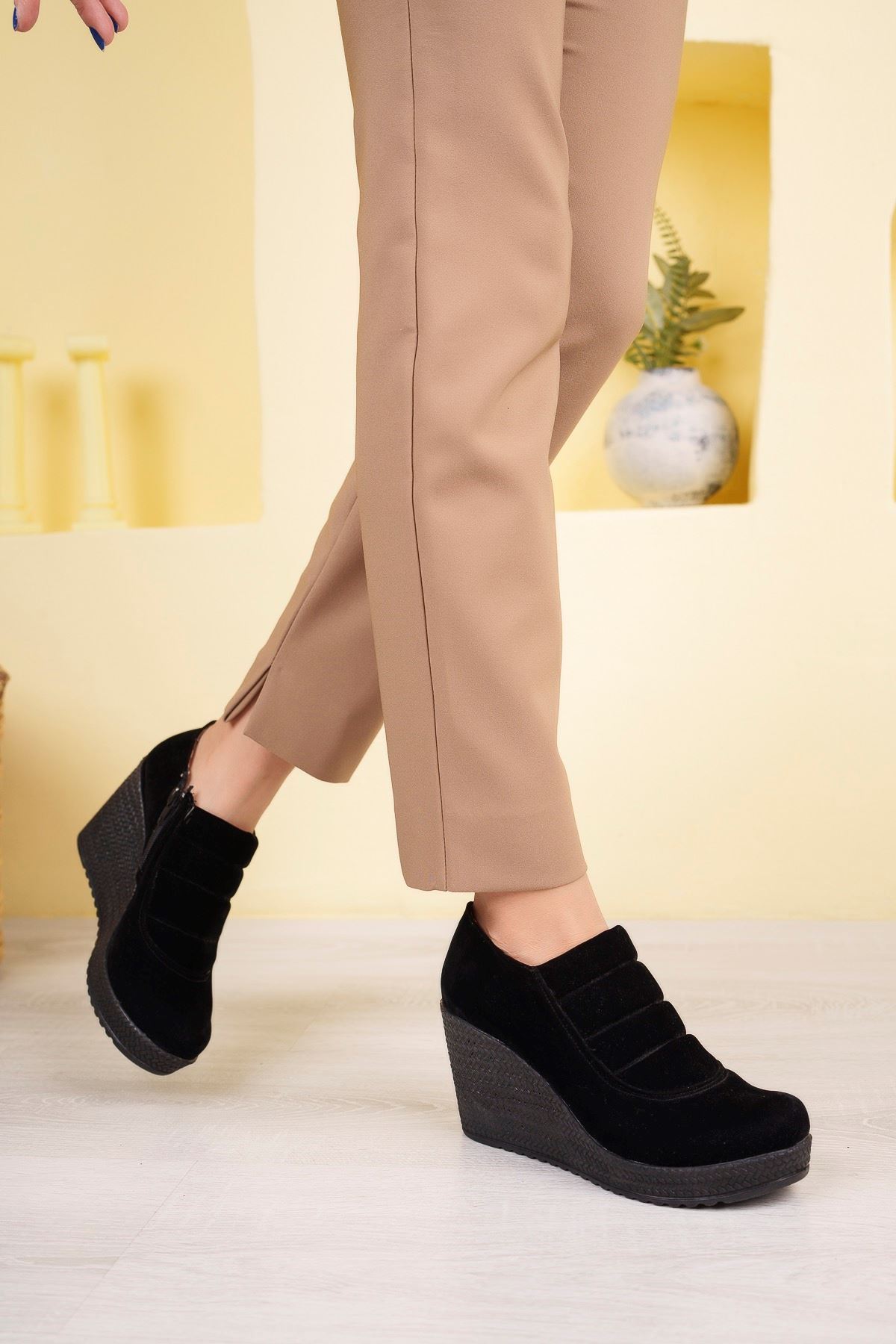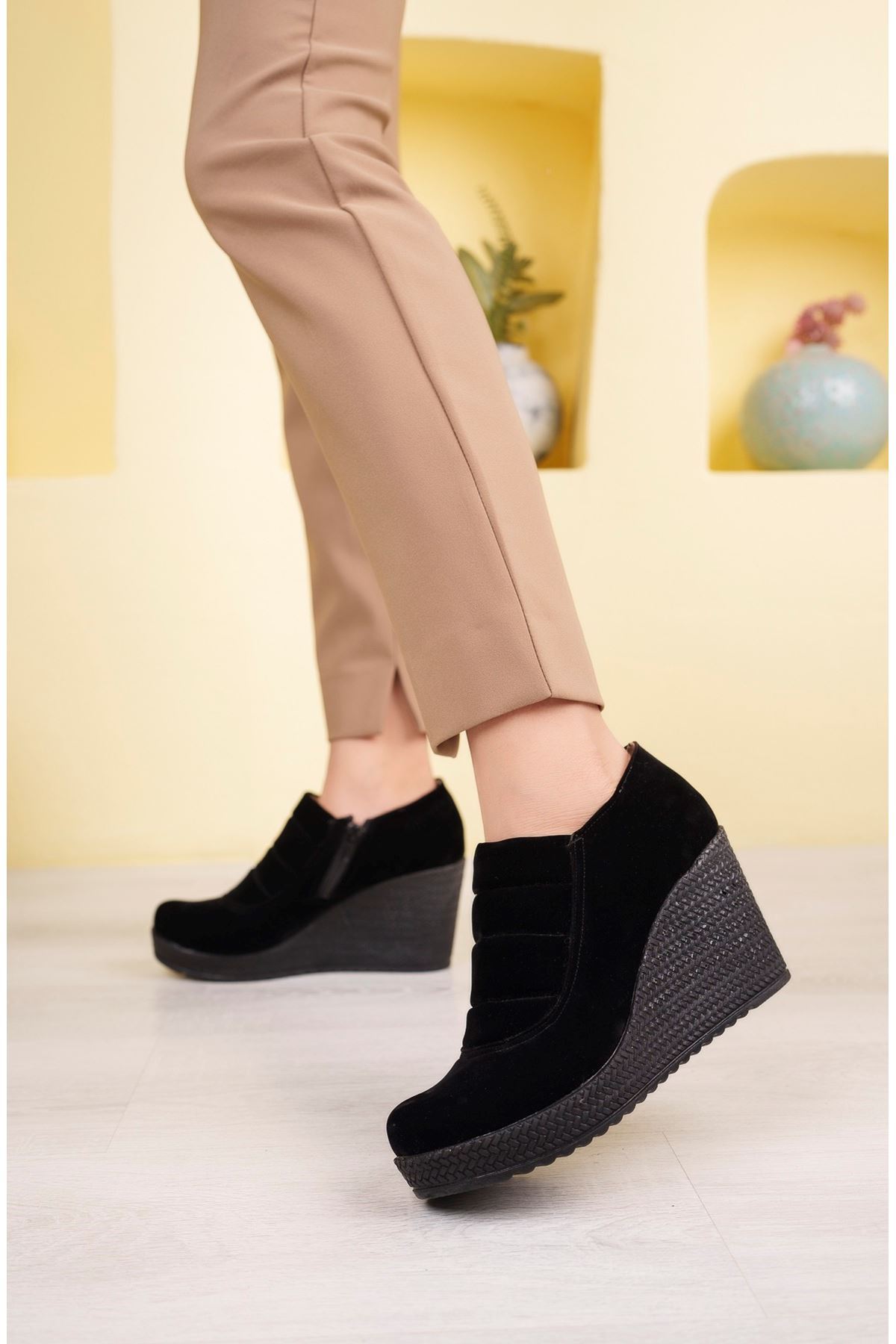 Dolgu Taban Yandan Fermuarlı Siyah Süet Kadın Ayakkabı