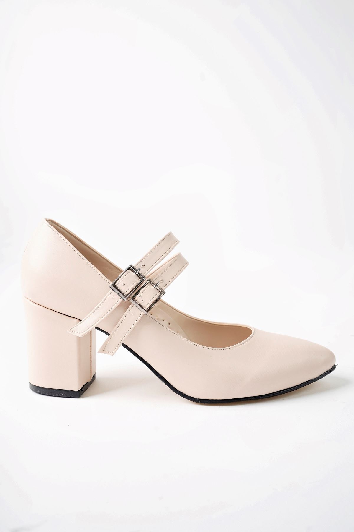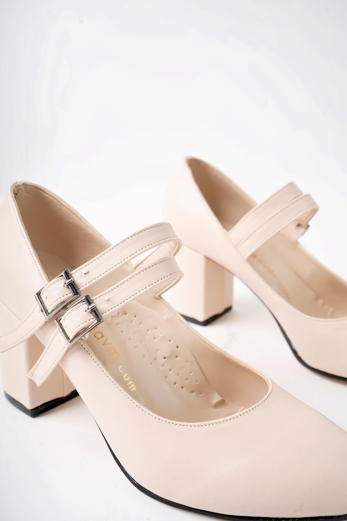 Dolgu Topuk Çift Bant Sivri Kalıp Krem Cilt