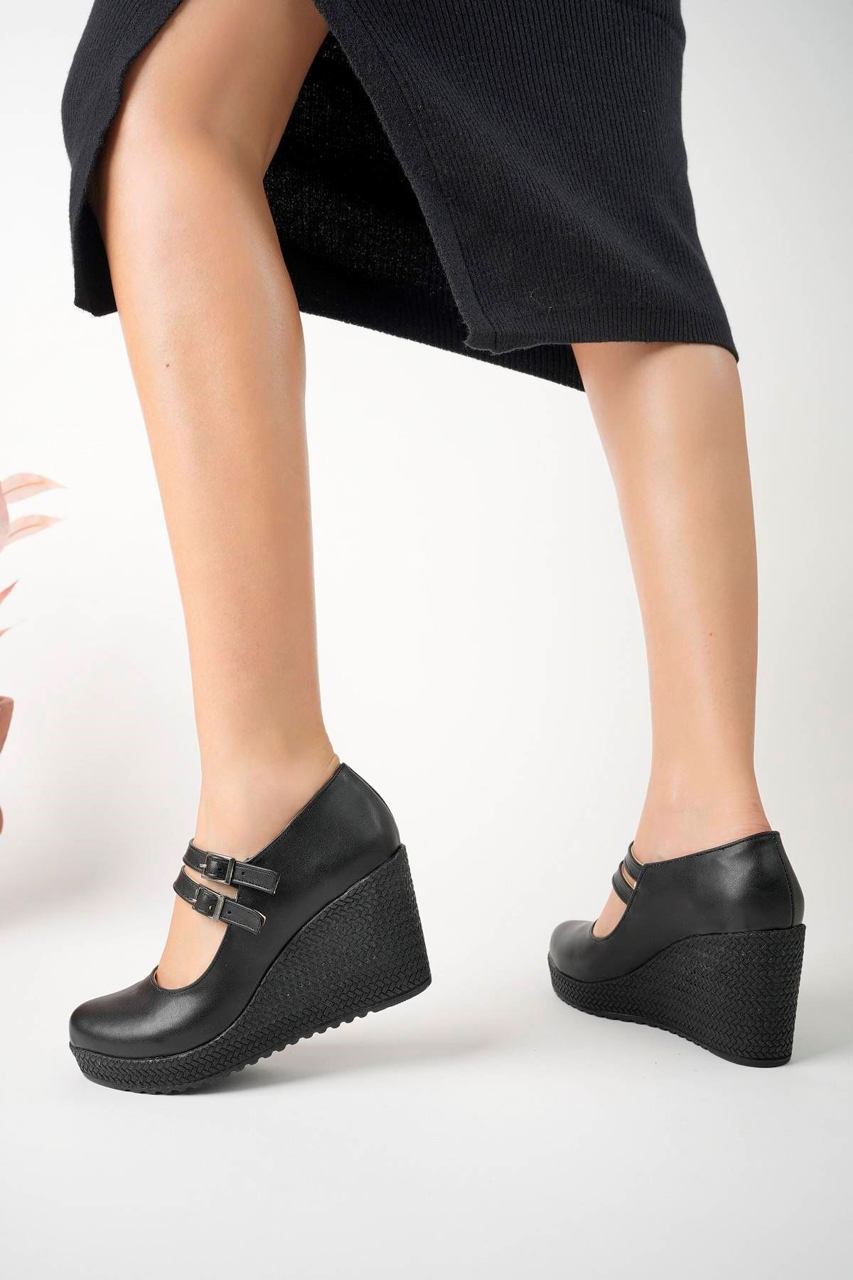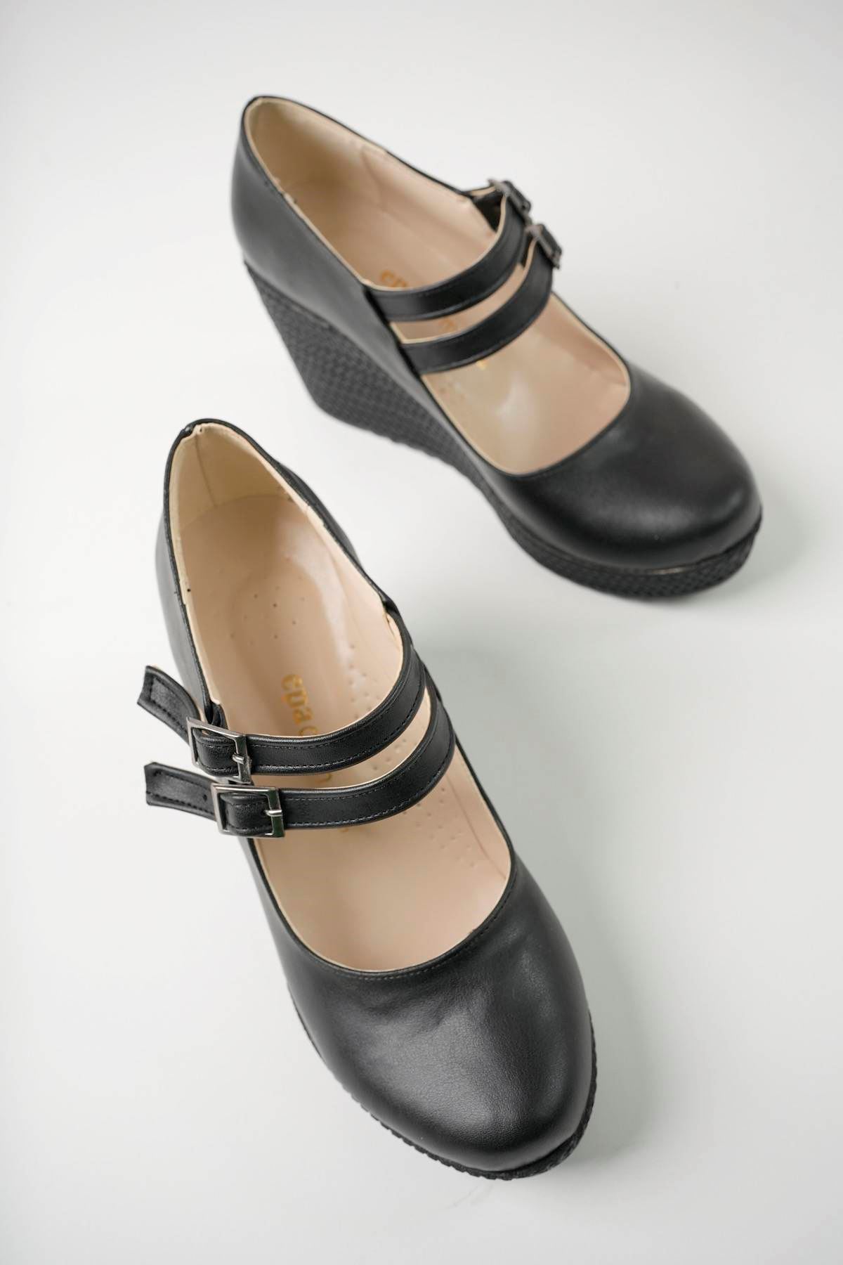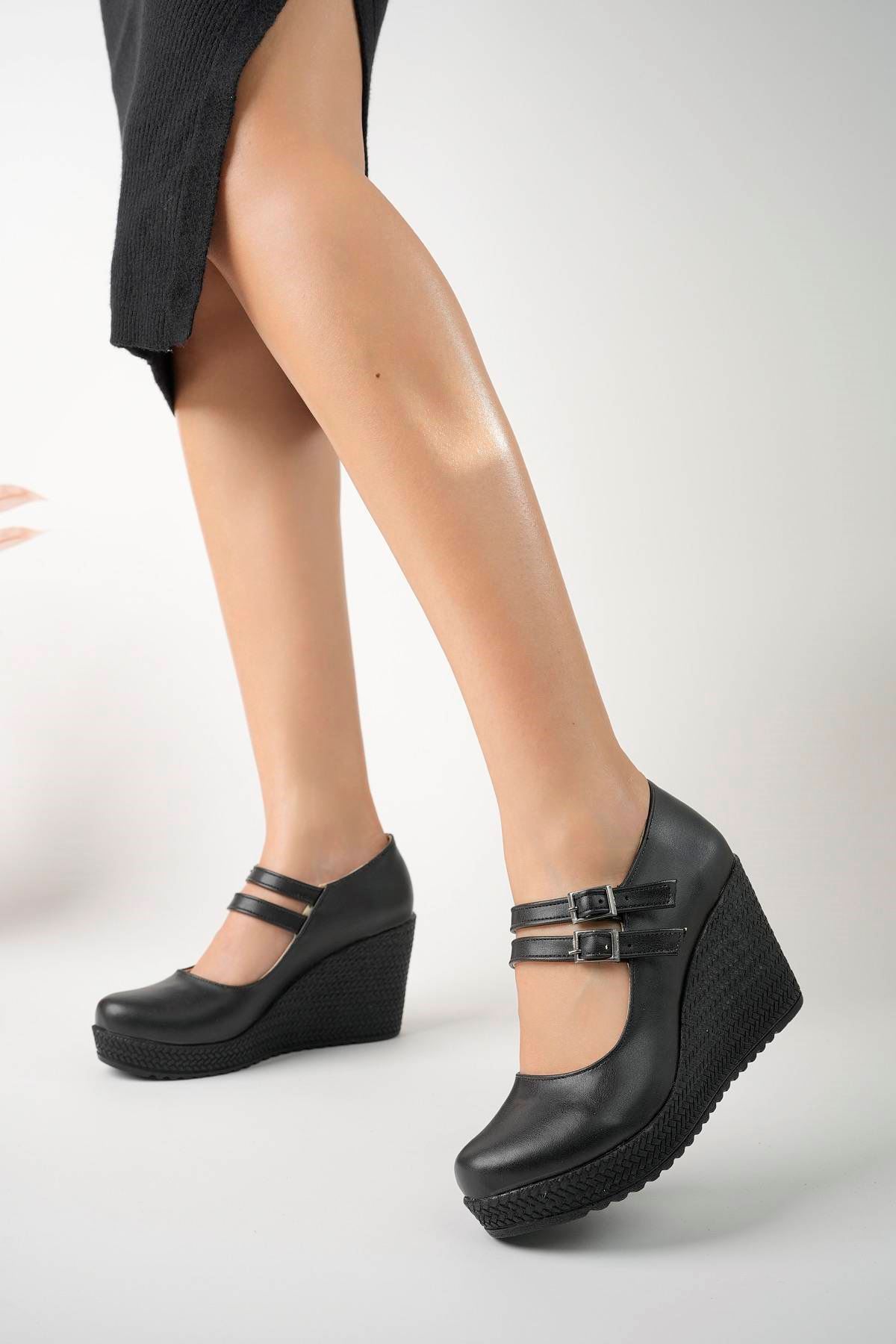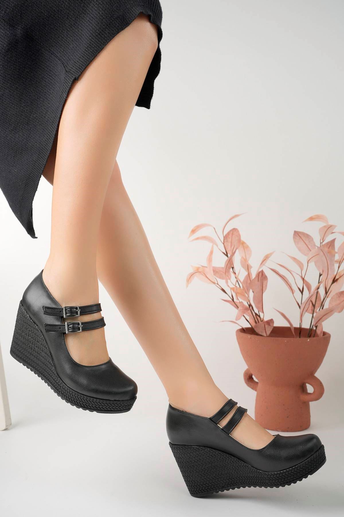 Dolgu Topuk Çift Bantlı Siyah Cilt Kadın Ayakkabı