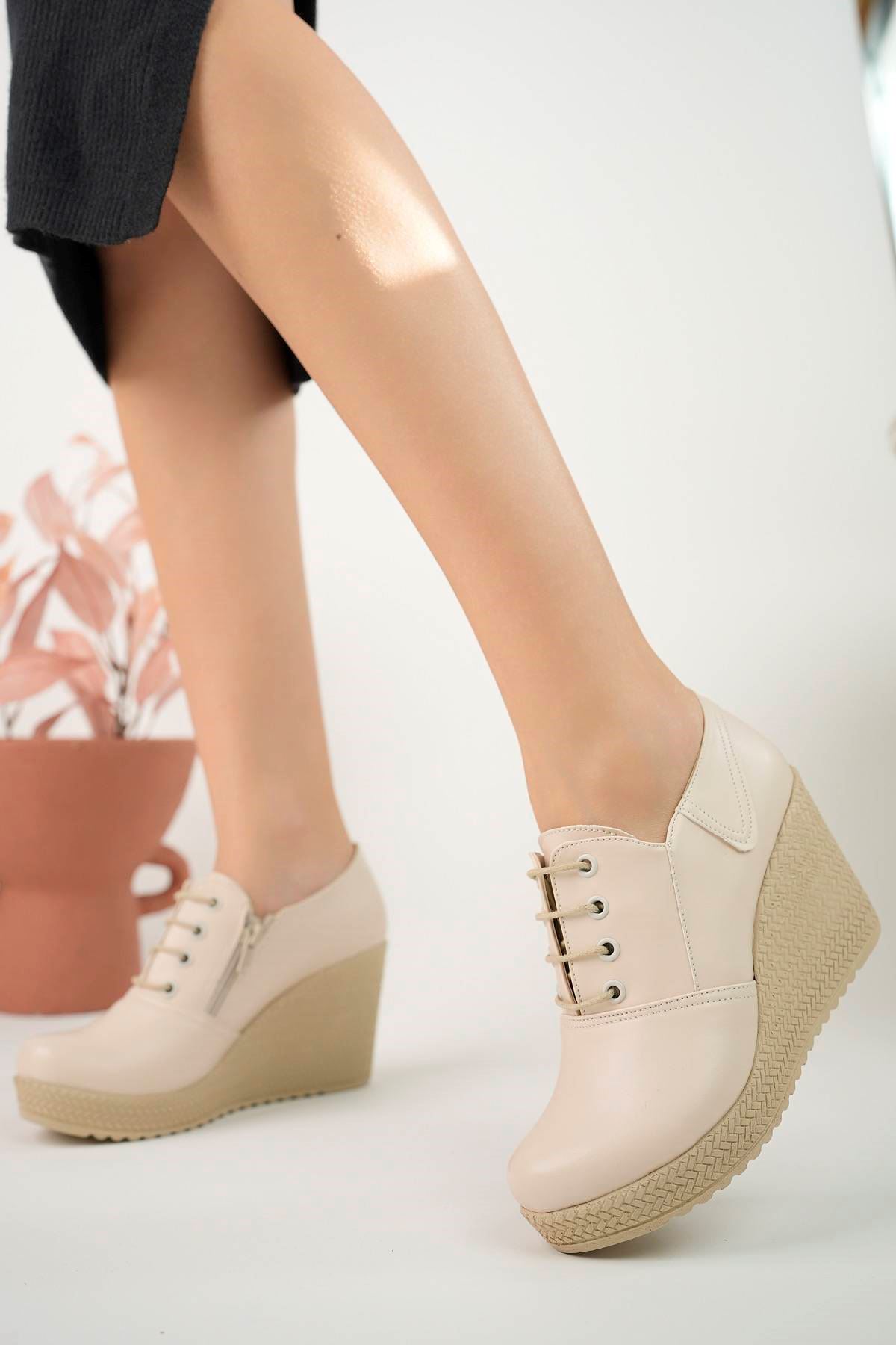 Dolgu Topuk Fermuarlı Krem Cilt Kadın Ayakkabı