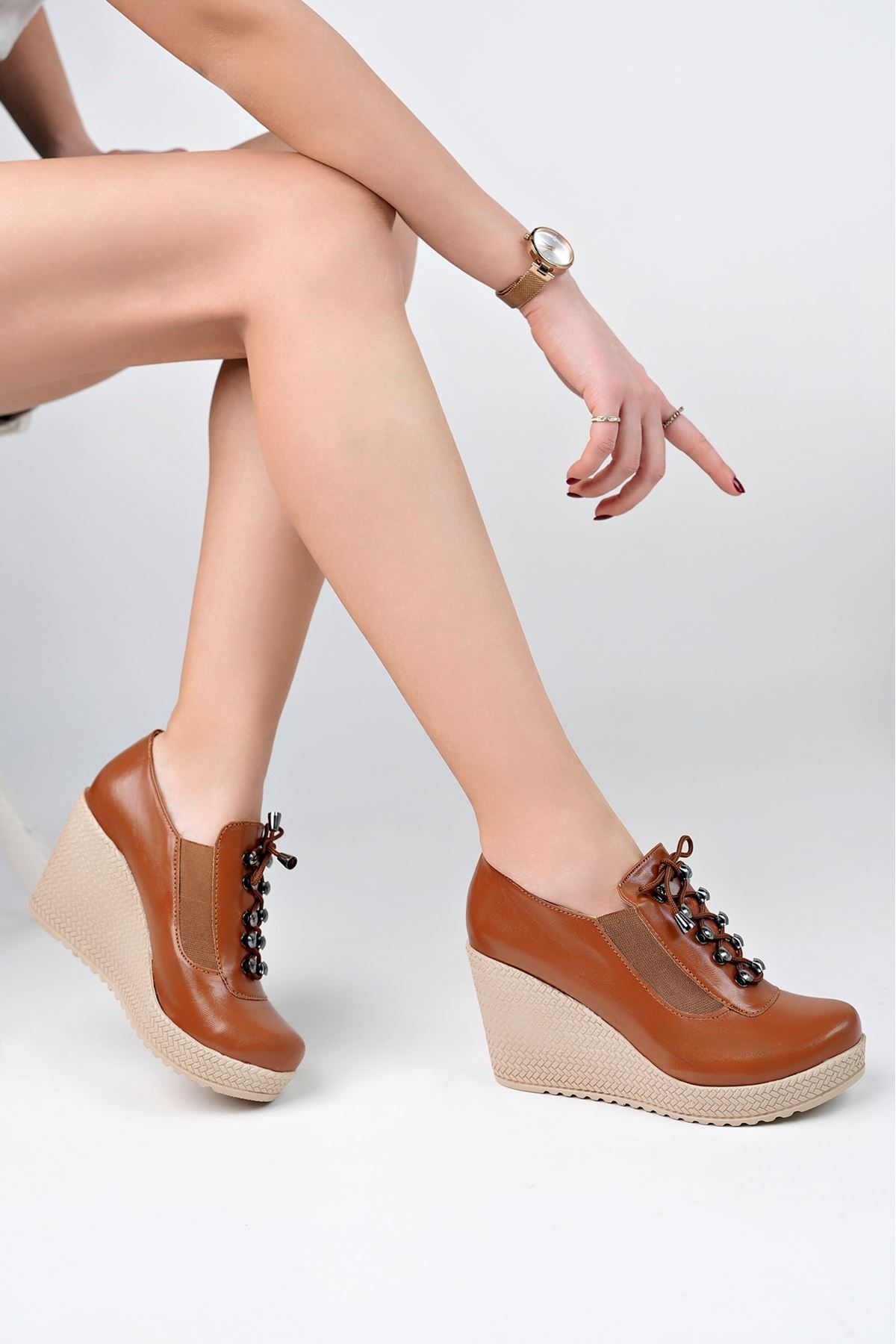 Dolgu Topuk Kancalı Taba Cilt Kadın Ayakkabı