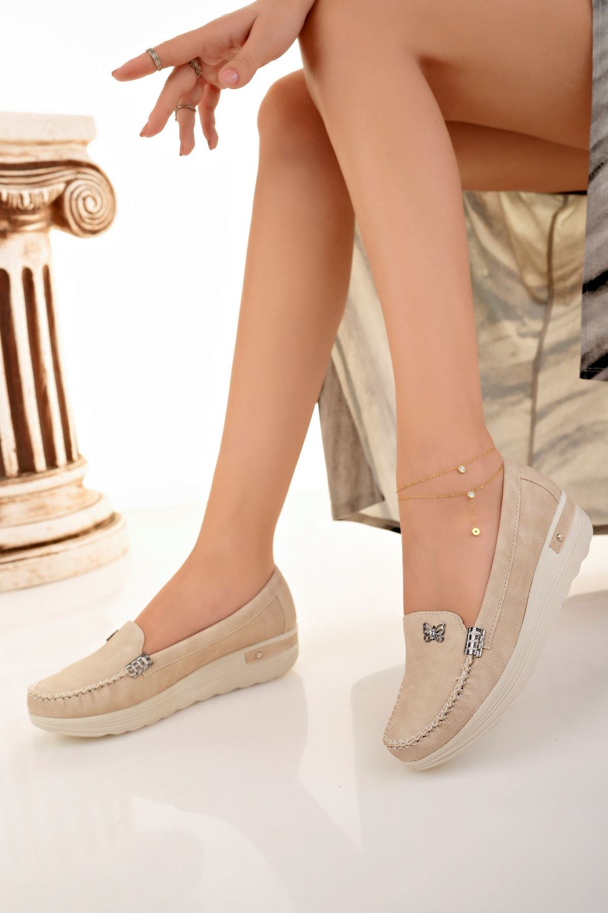 Dolgu Topuk Kelebekli Krem Kot Ayakkabı