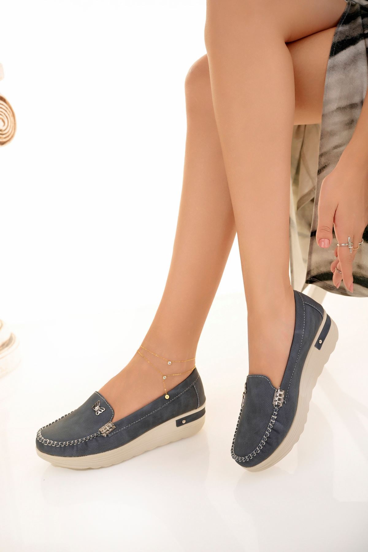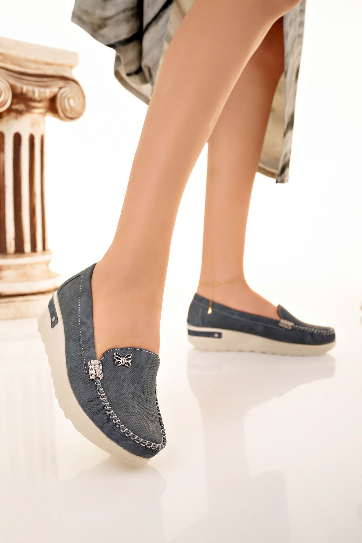 Dolgu Topuk Kelebekli Lacivert Kot Ayakkabı