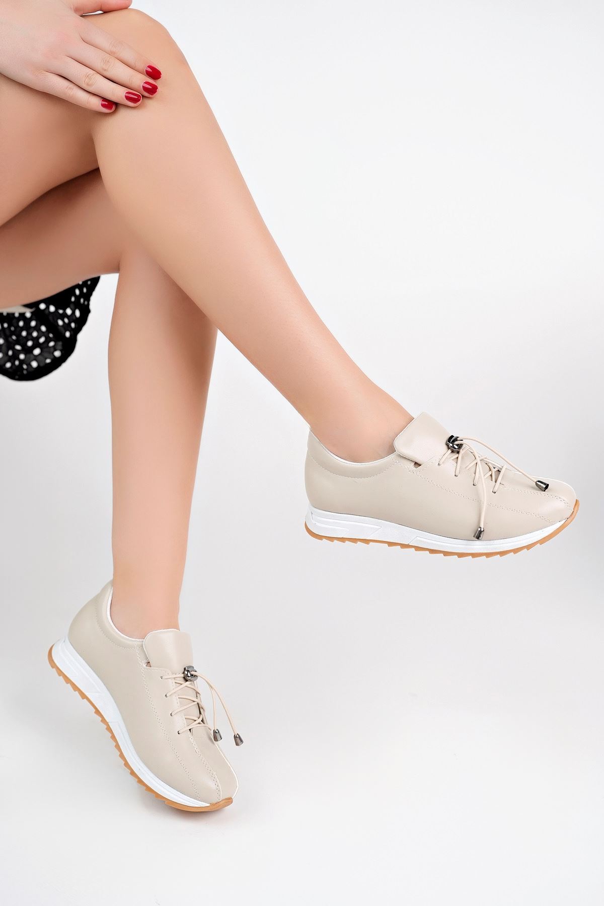 Dolgu Topuk Krem Cilt Kadın Ayakkabı