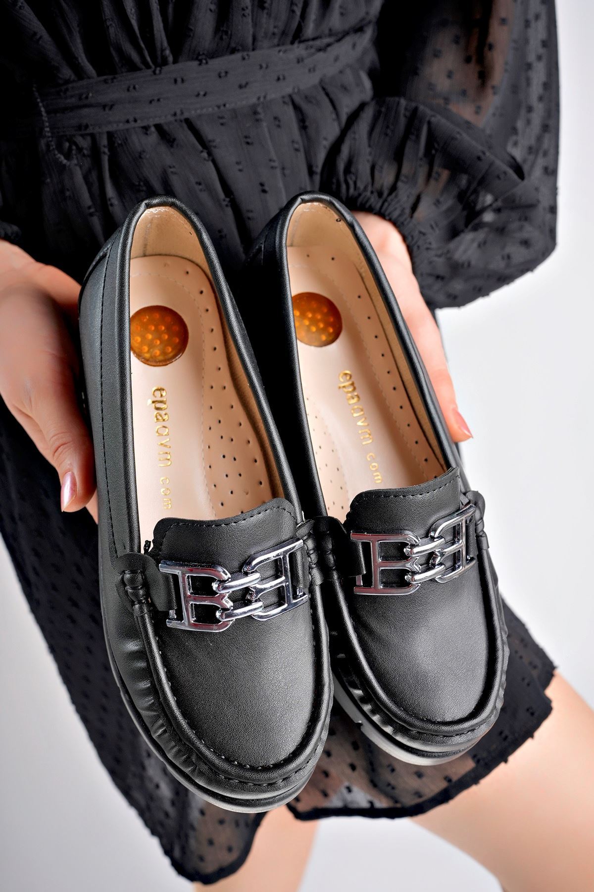Dolgu Topuk Ortopedik Pedli Siyah Cilt Kadın Ayakkabı