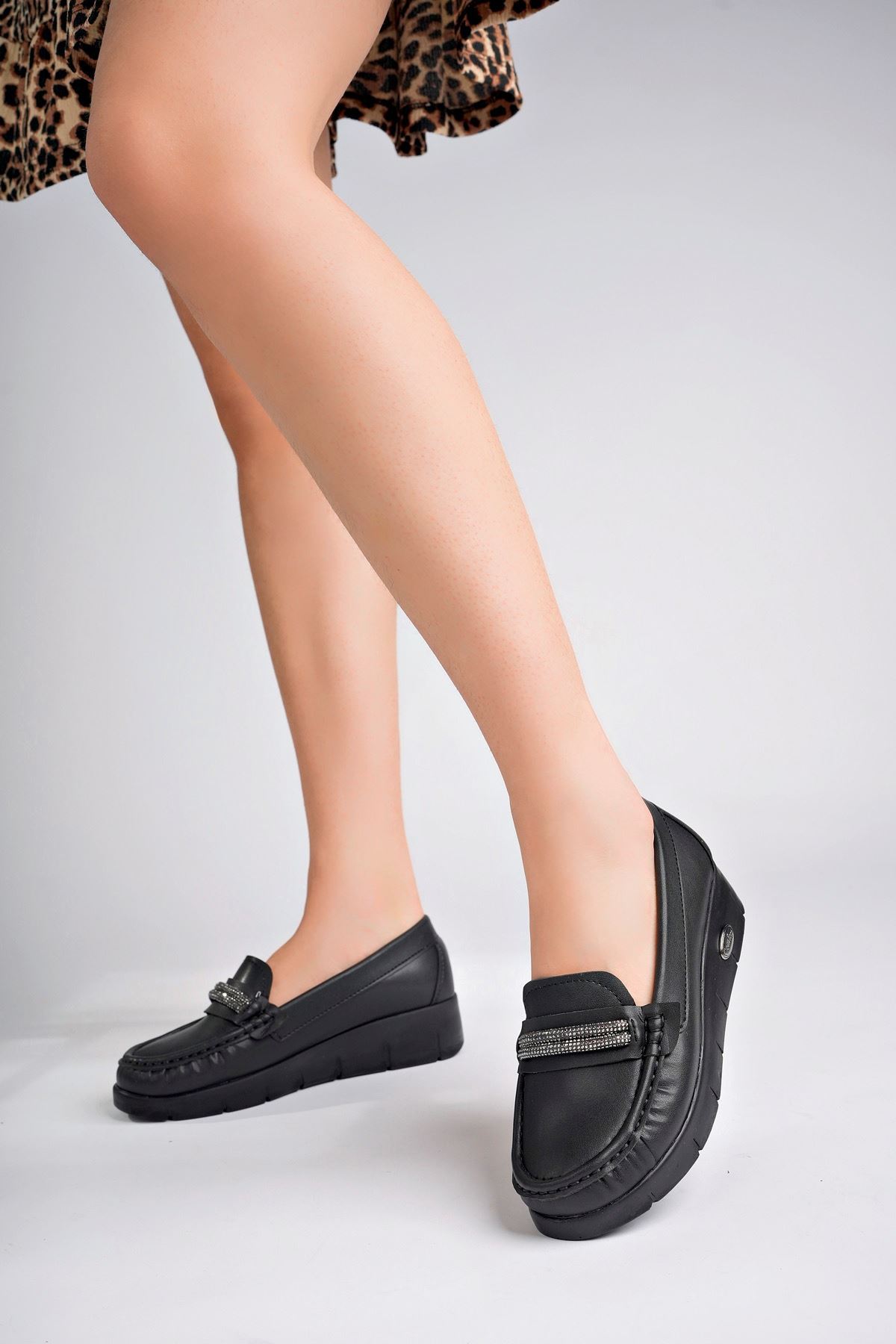 Dolgu Topuk Ortopedik Pedli Siyah Cilt Kadın Ayakkabı