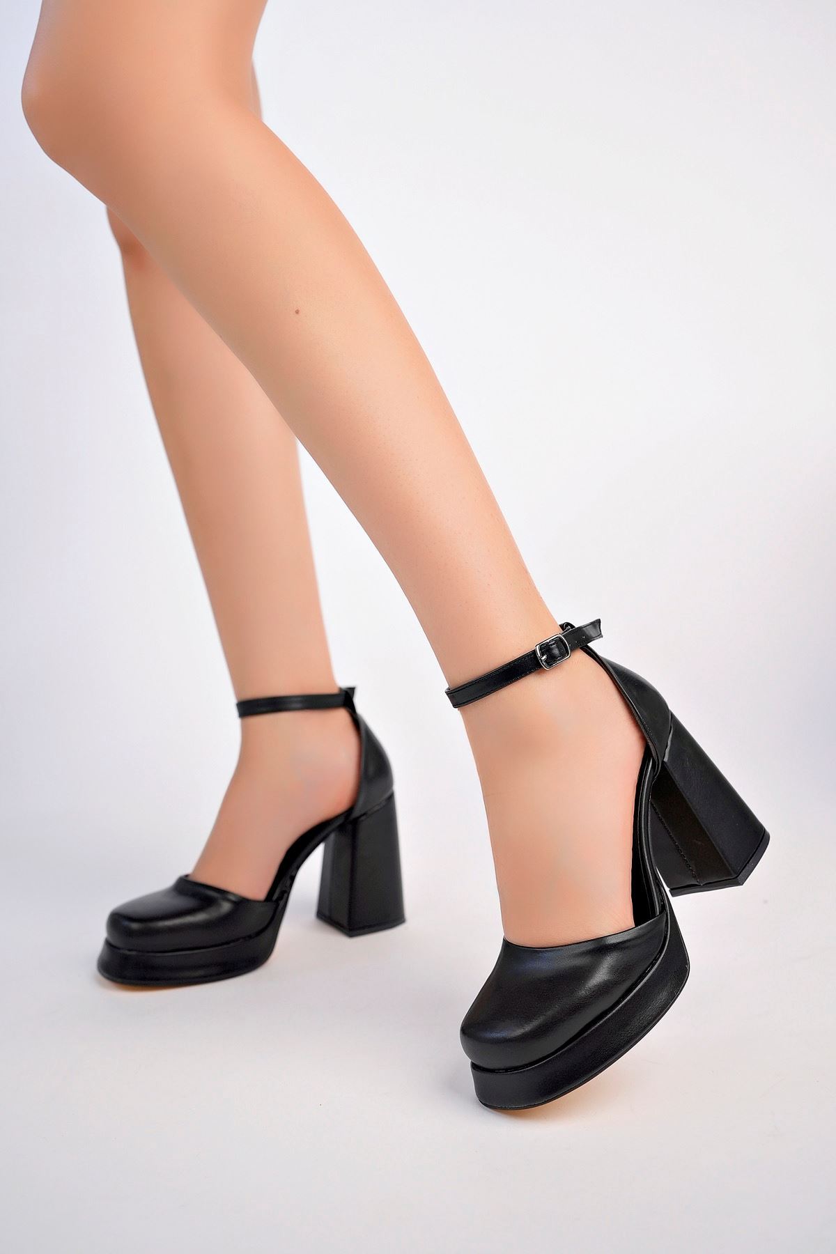 Dolgu Topuk Platform Siyah Cilt Karnıyarık Ayakkabı