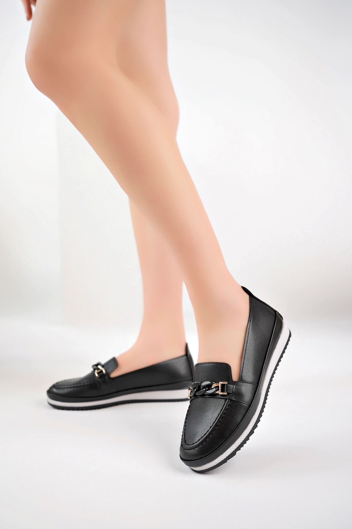 Dolgu Topuk Siyah Cilt Ayakkabı