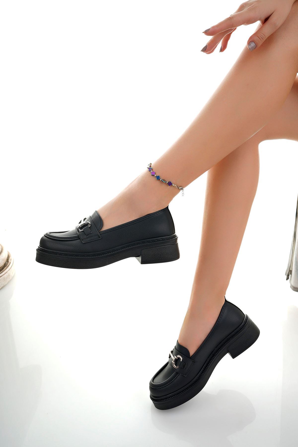 Dolgu Topuk Siyah Cilt Kadın Ayakkabı