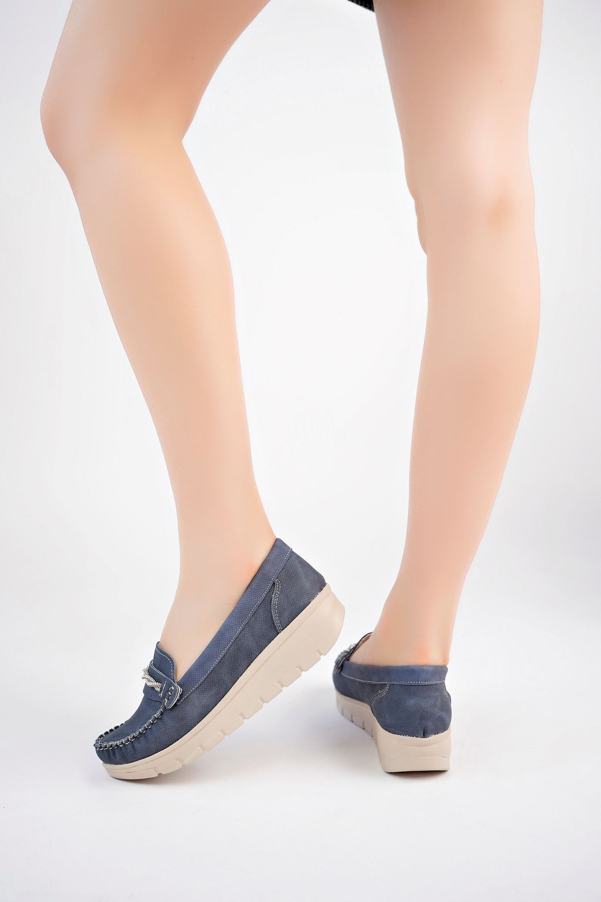 Dolgu Topuk Taşlı Lacivert Kot Kadın Ayakkabı