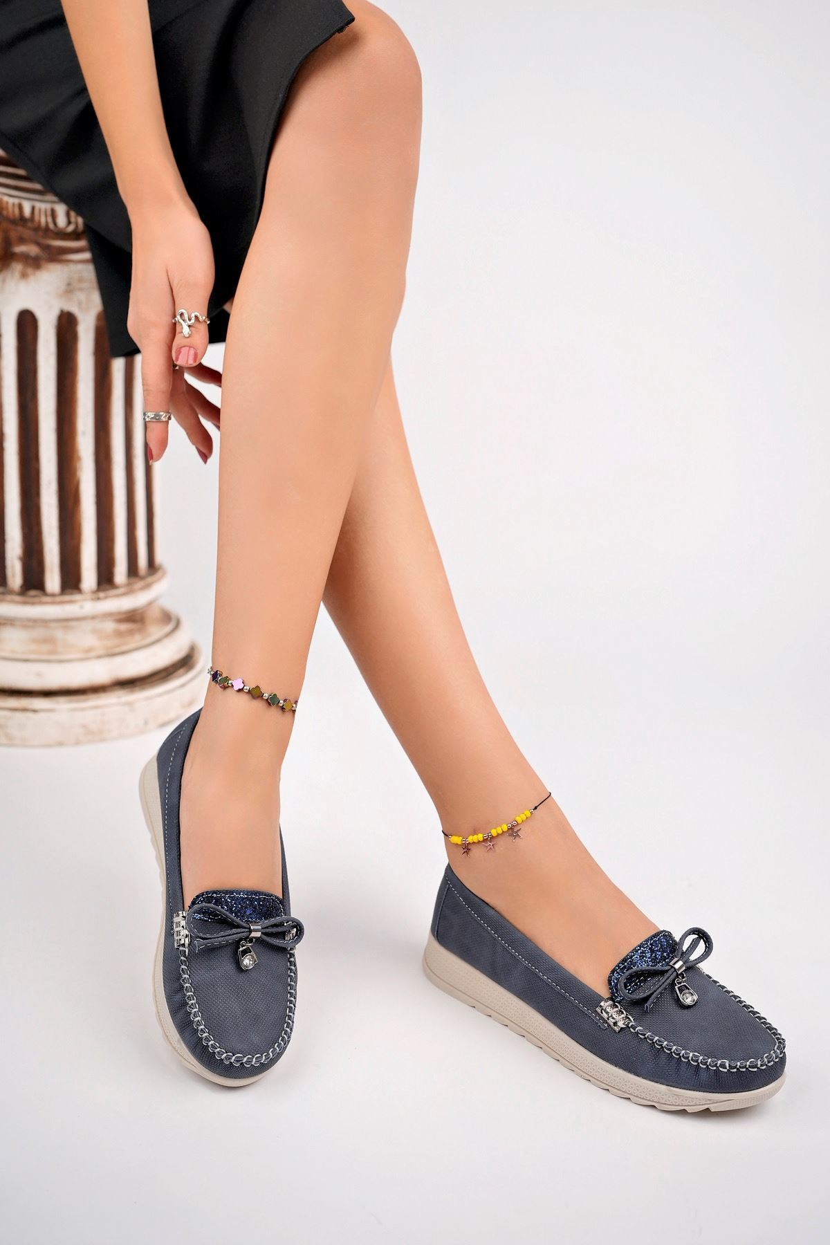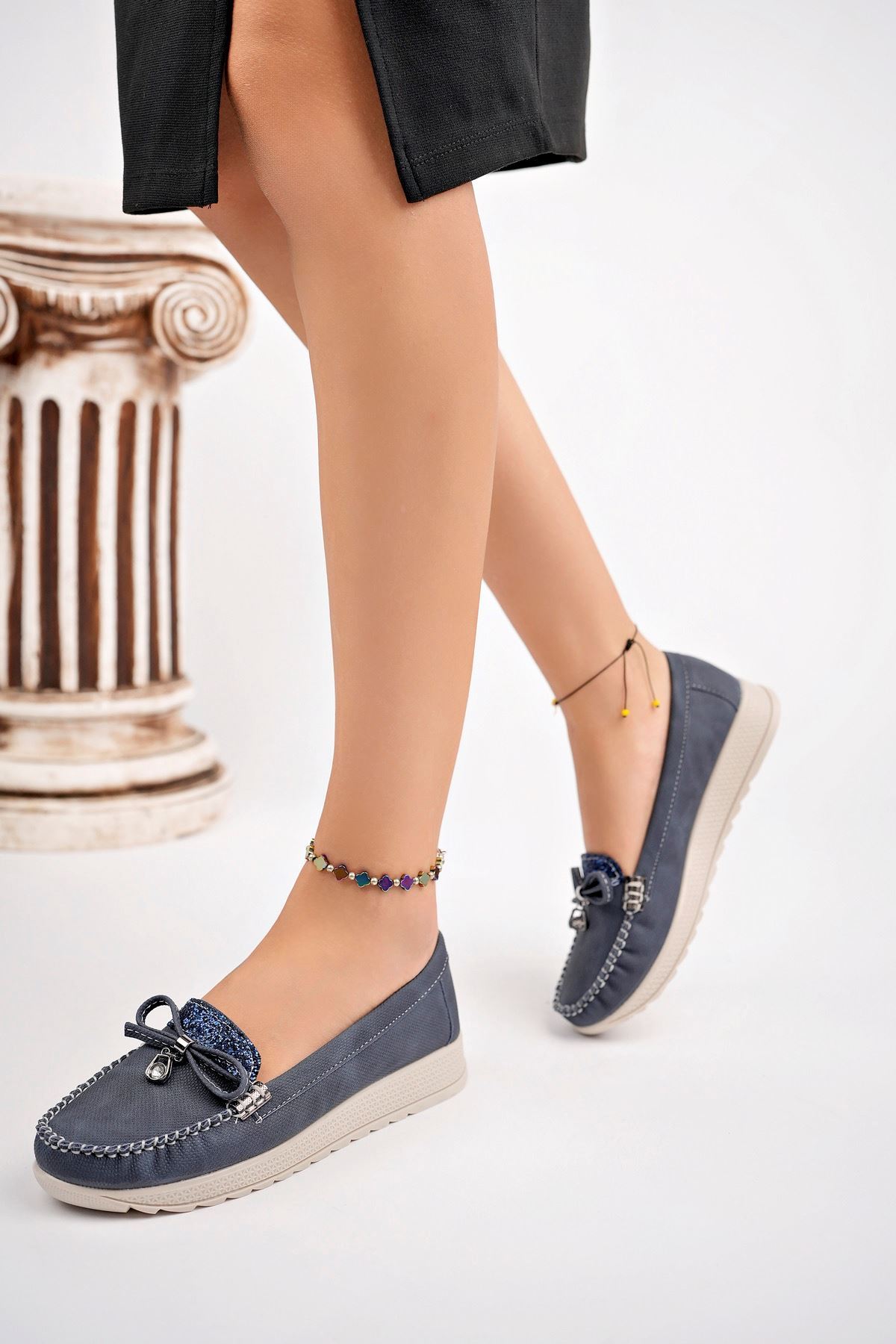Dolgu Topuk Termo Taban Dili Taşlı Lacivert Kot Ayakkabı