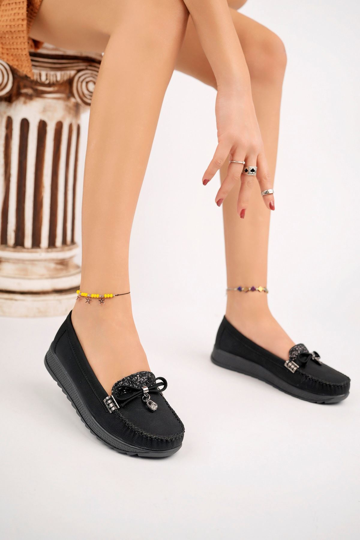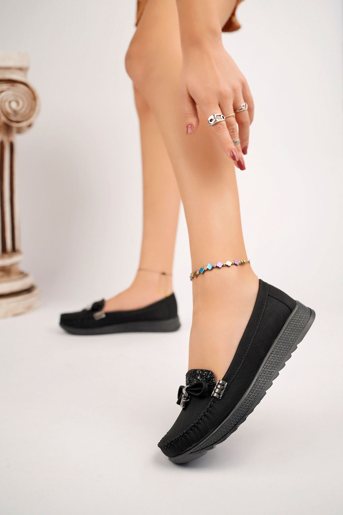 Dolgu Topuk Termo Taban Dili Taşlı Siyah Kot Ayakkabı
